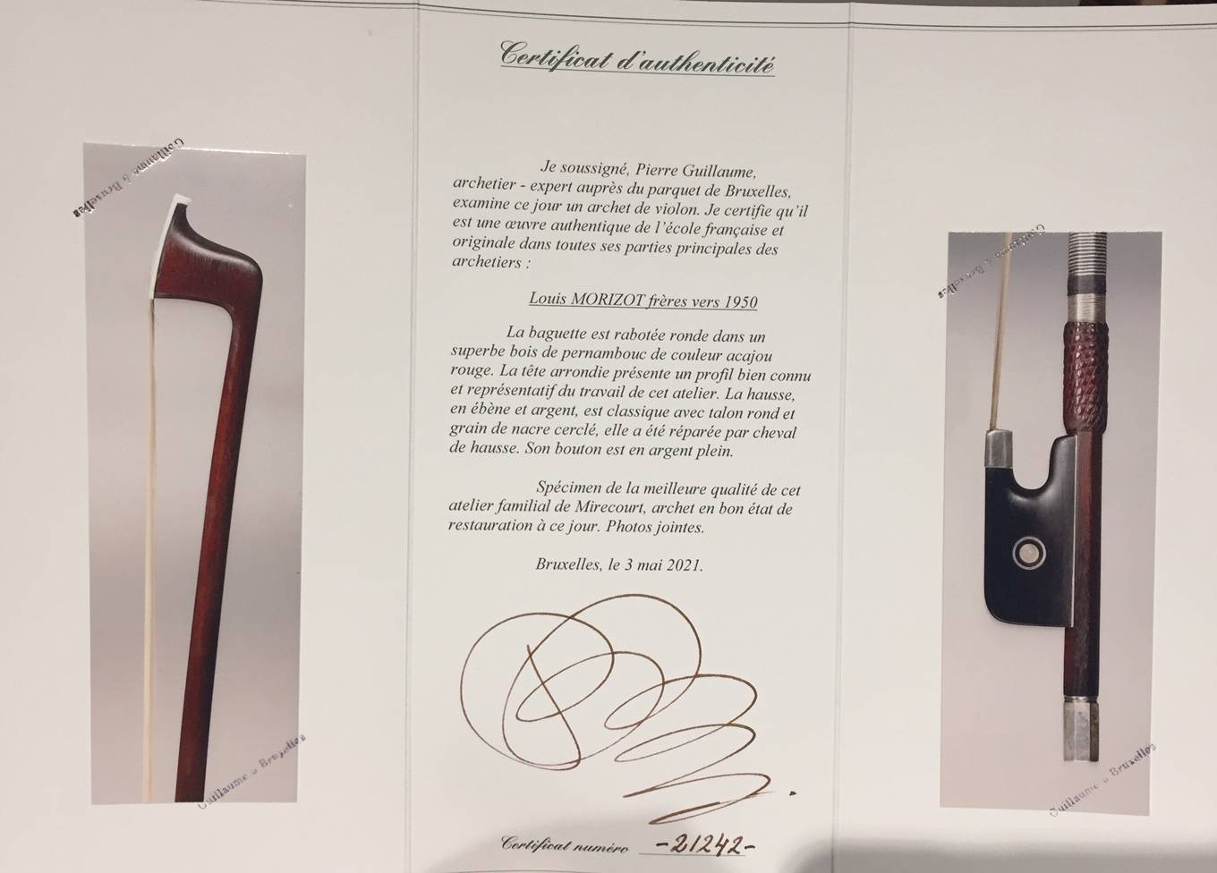 French violin bow by Louis Morizot brothers. P. Guillaume certificate.