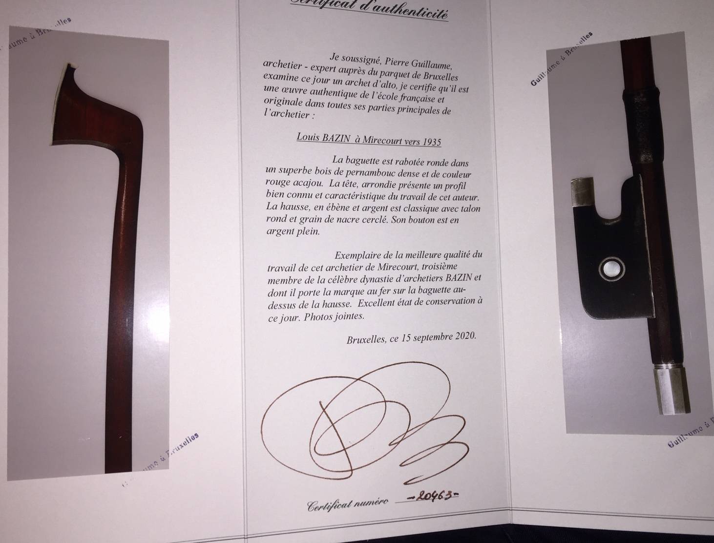 French viola bow by Louis BAZIN bearing the stamp. Pierre Guillaume certificate.