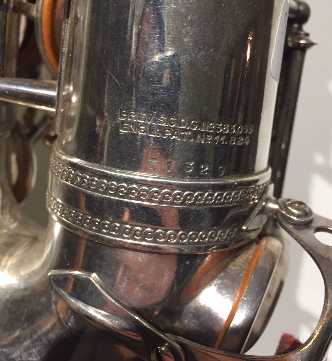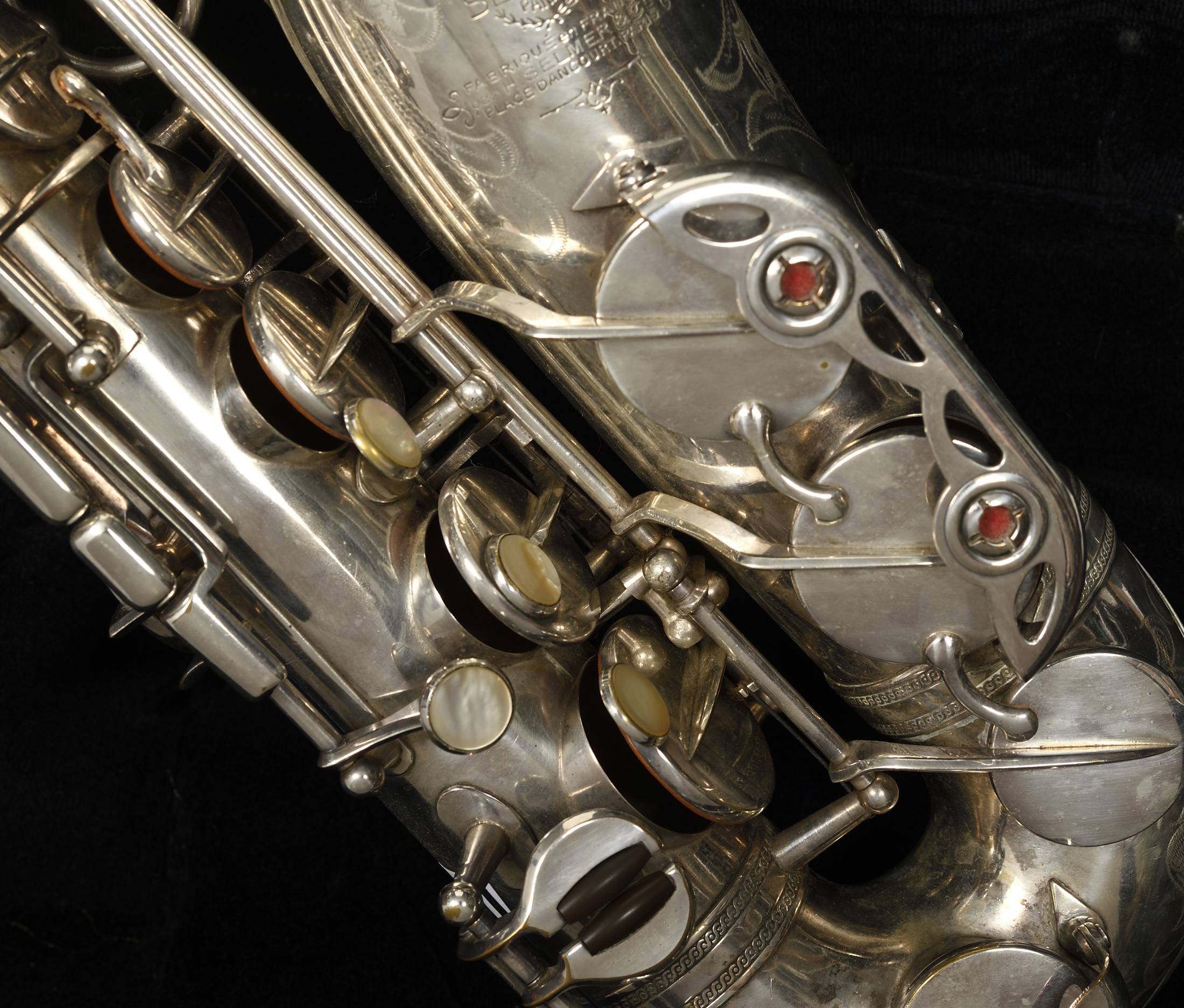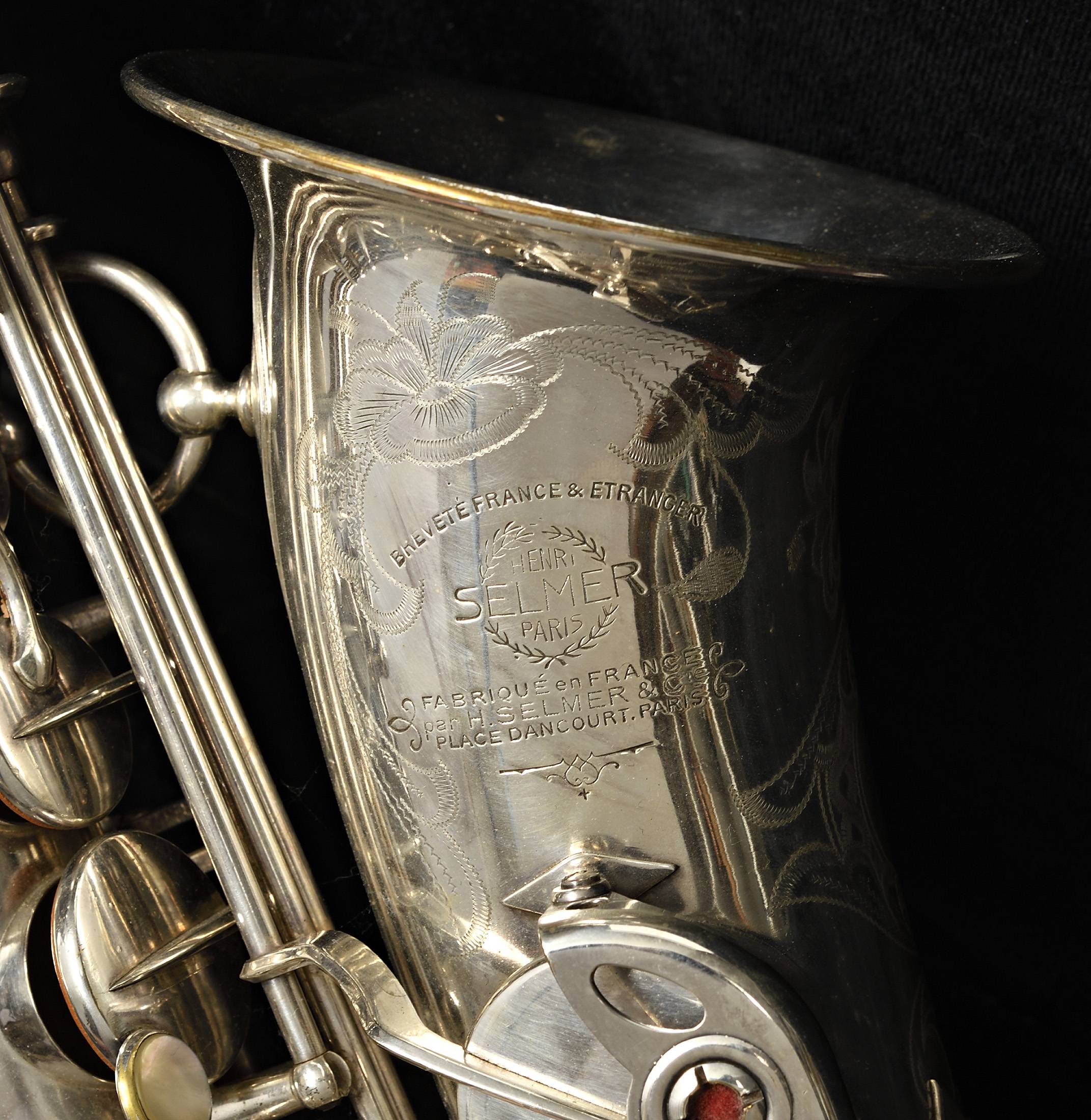 Portant la marque " Henri SELMER PARIS...". Balanced action, fait en 1943. Numéros de série: 31329. Légèrement bossué, rayé. Avec étui moderne. Bec MEYER.
