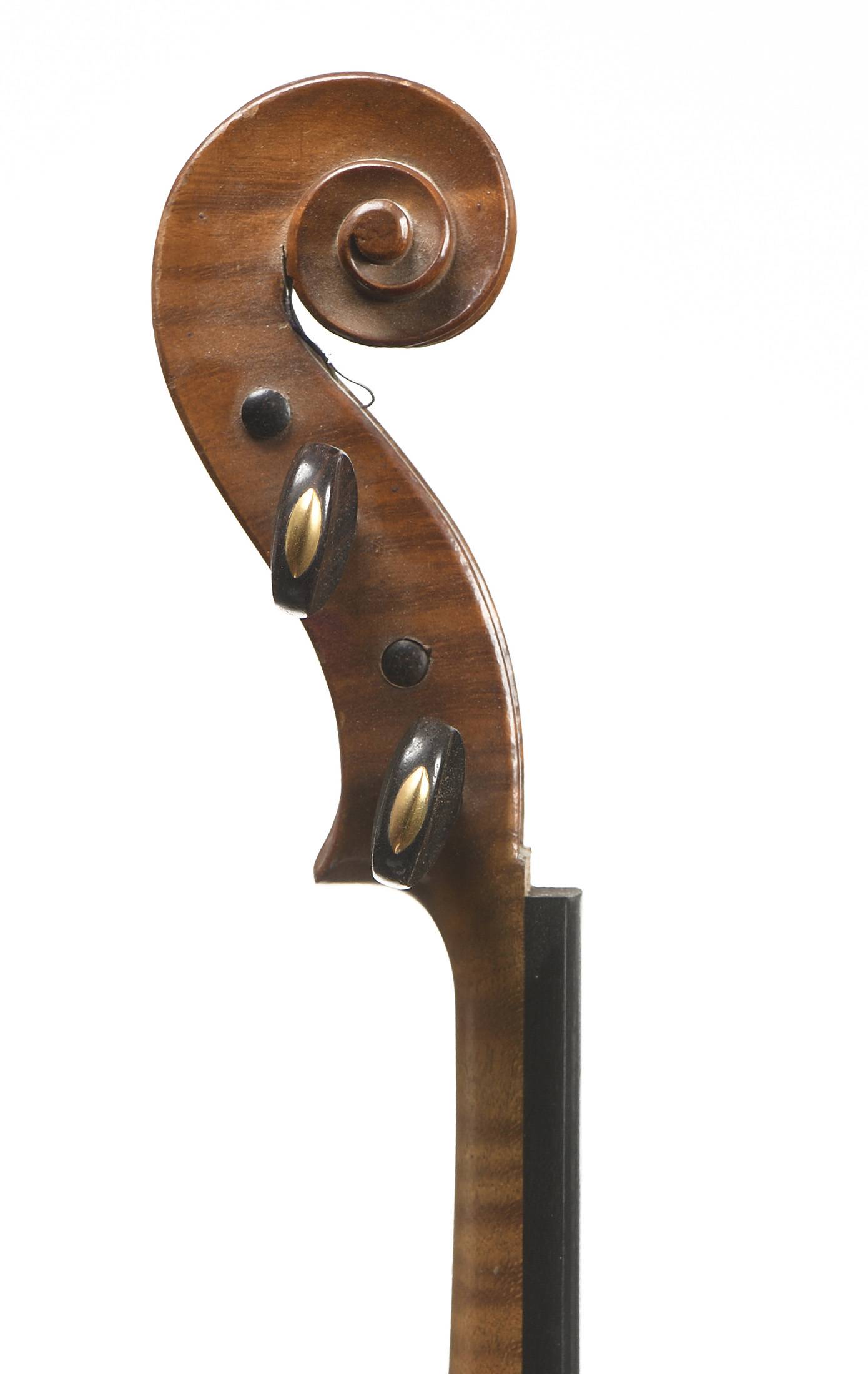 dont il porte l'étiquette originale "H. Emile Blondelet. Luthier à Paris. N°37. Année 1921" et la marque au fer en dessous du talon du manche. Fond de deux pièces en bel érable aux ondes descendantes sur les cotés. Eclisses et tête du même bois. Table en épicéa aux pores moyennement serrés au centre s'élargissant sur les bords. 359 mm. Avec boite et archet.