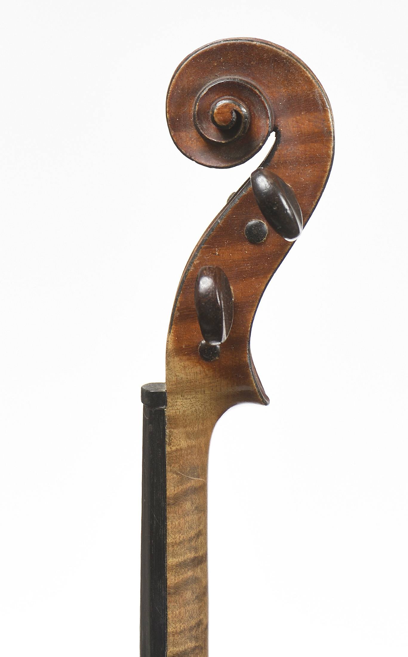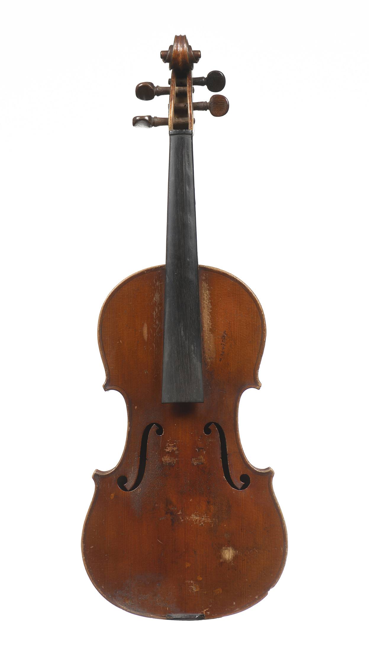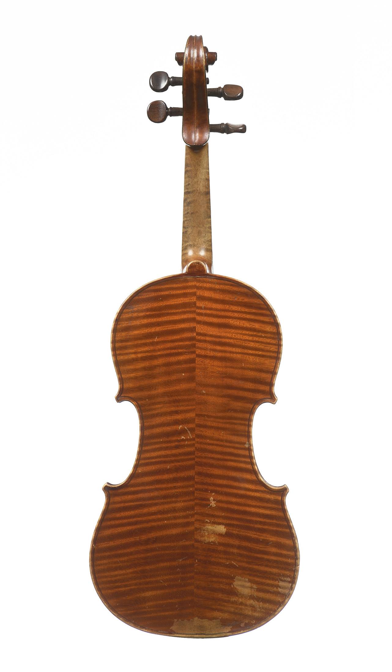 portant l'étiquette "Joseph GUARINI fecit anno 1918. N°484. Emile MENESSION à Reims (Marne)..." et une étiquette "Antonius Stradiavarius 1718...". Fond de deux pièces en érable. Vernis brun orangé sur fond doré. 357 mm.