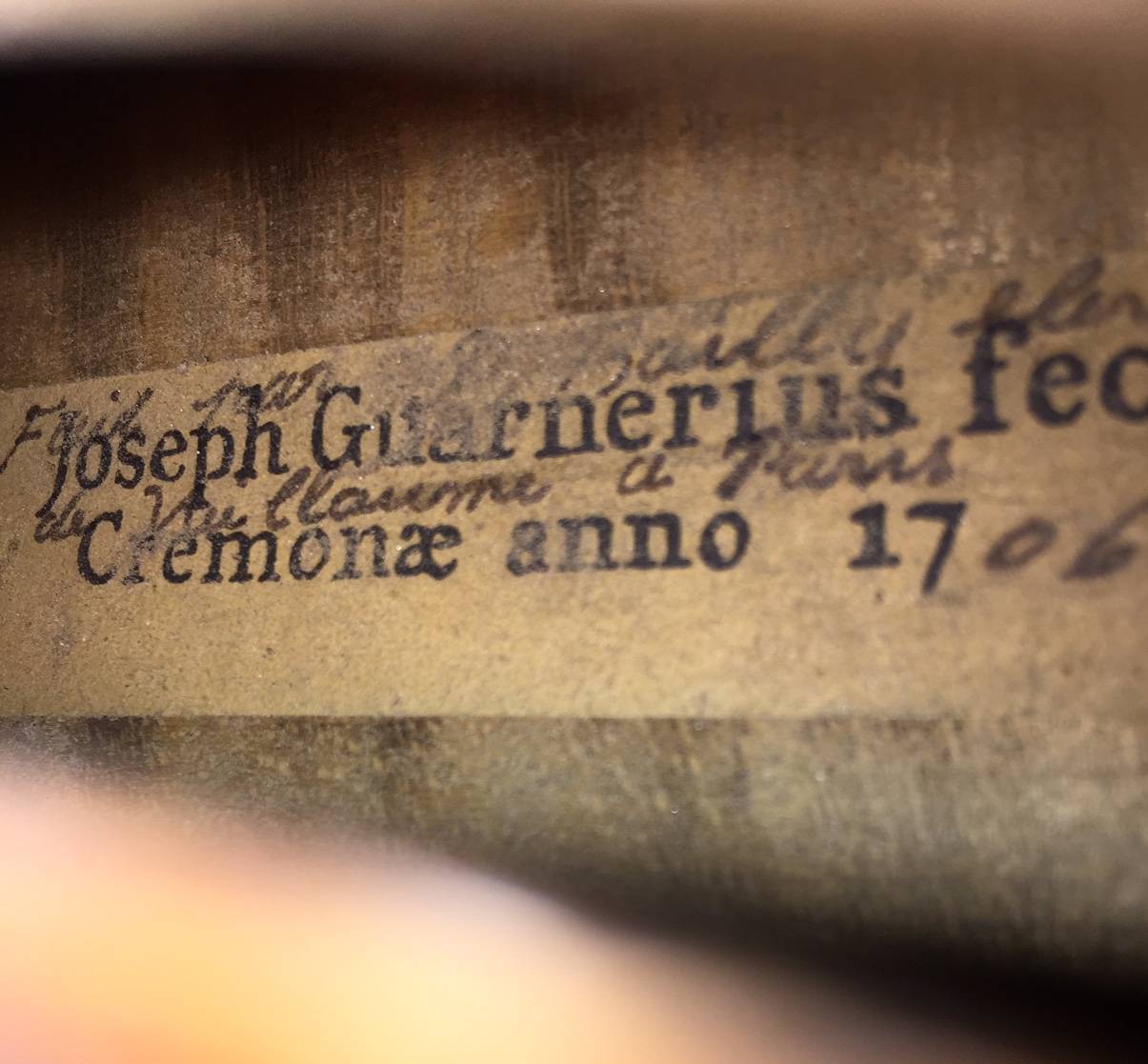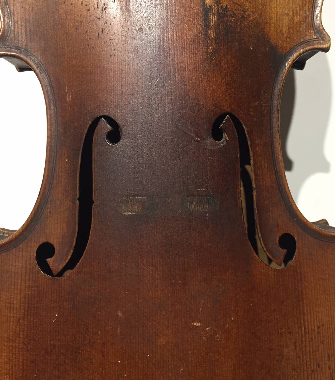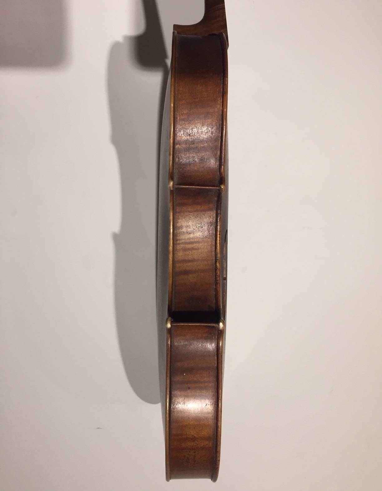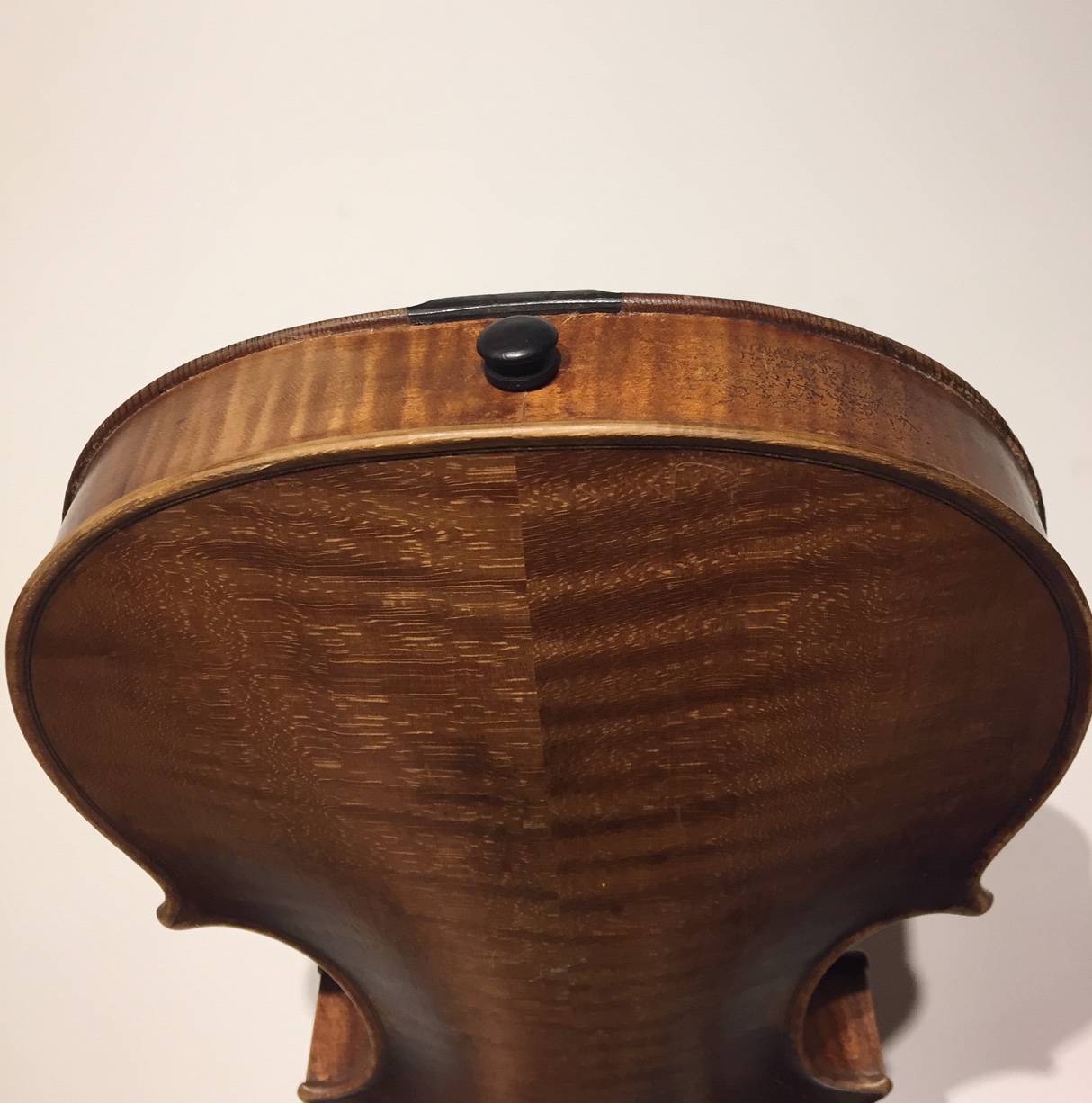 portant une étiquette "Josef Guarnerius... 1706" et une signature manuscrite apocryphe. Fond de deux pièce en érable aux ondes régulières. Table en épicéa aux pores réguliers. 360 mm.