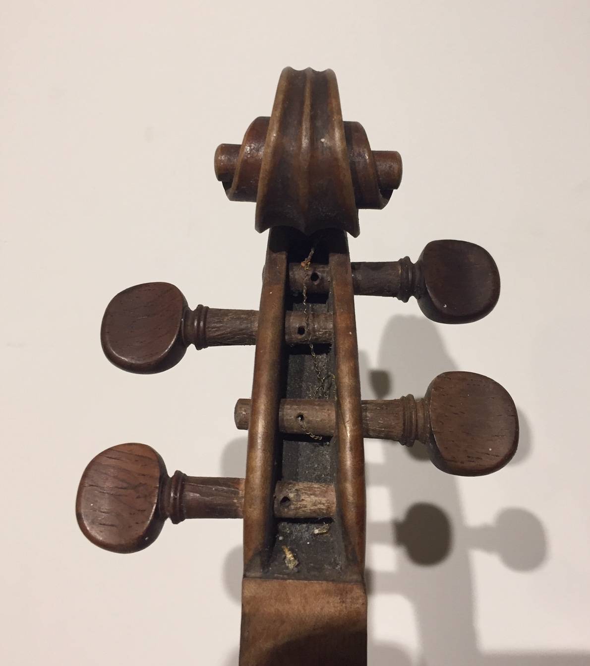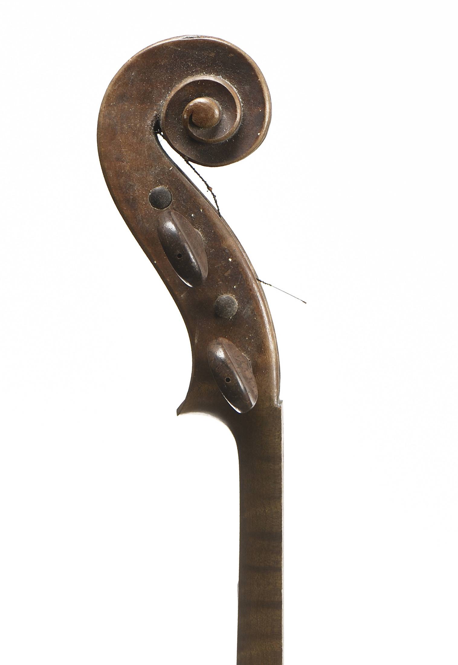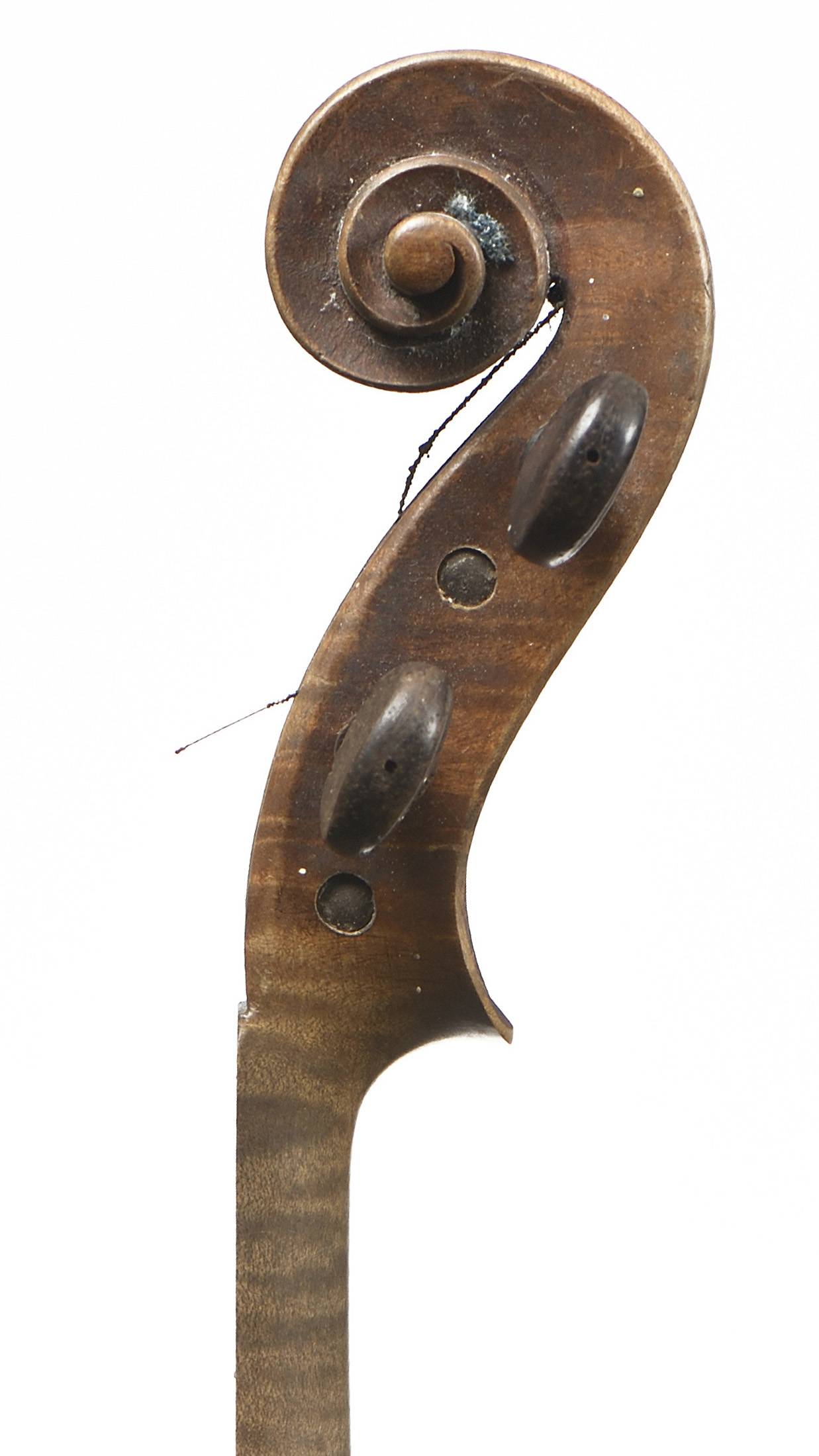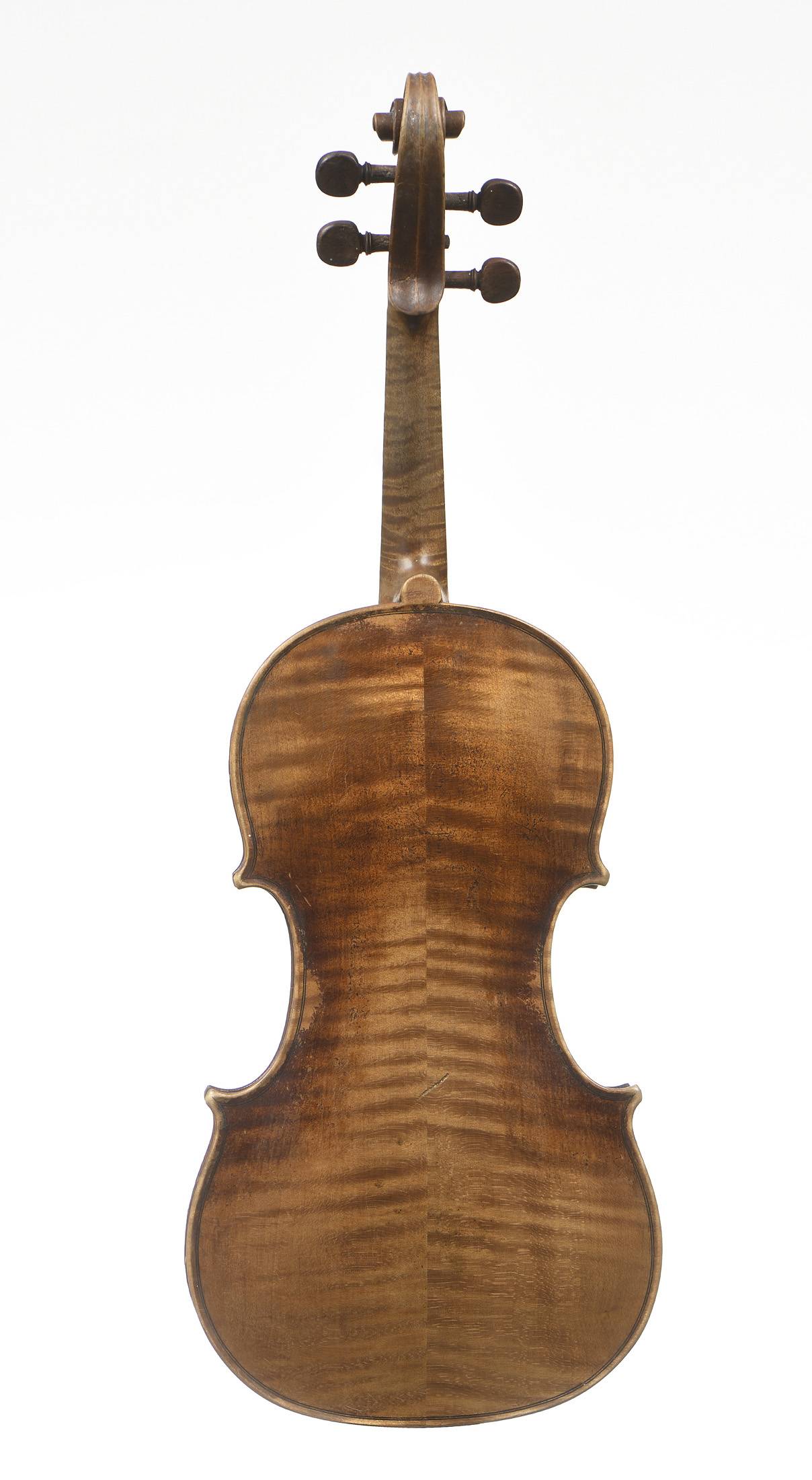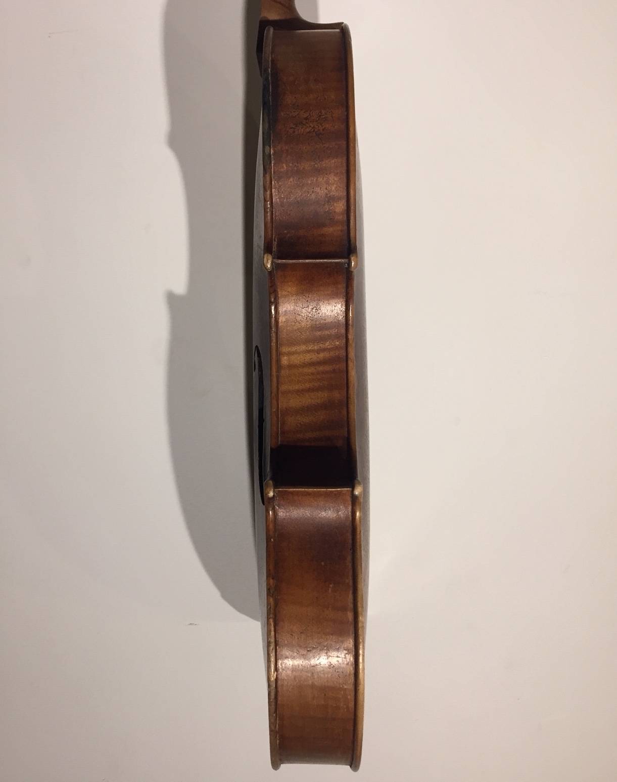 portant une étiquette "Josef Guarnerius... 1706" et une signature manuscrite apocryphe. Fond de deux pièce en érable aux ondes régulières. Table en épicéa aux pores réguliers. 360 mm.