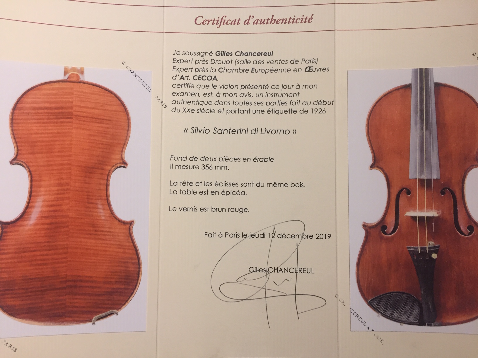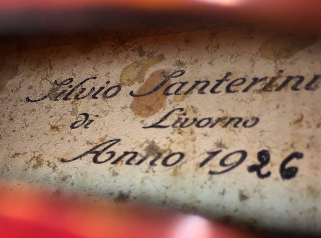 Italian violin bearing the label " Silvio Santerini di Livorno. Anno 1926.".