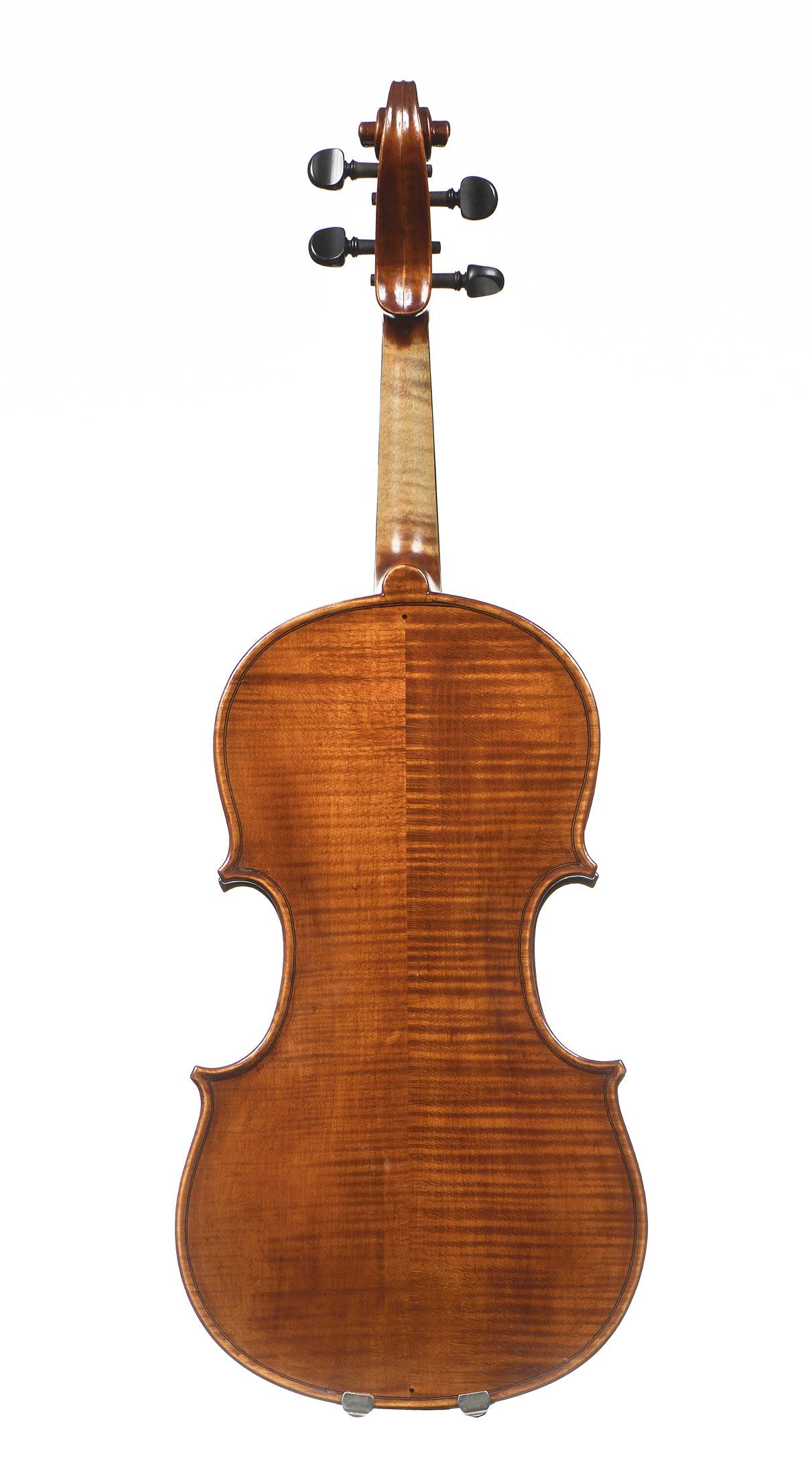 Fond de deux pièces en bel érable aux ondes moyennes, régulières et horizontales. Table en épicéa aux pores serrés, irréguliers. Vernis doré / miel. 413 mm.