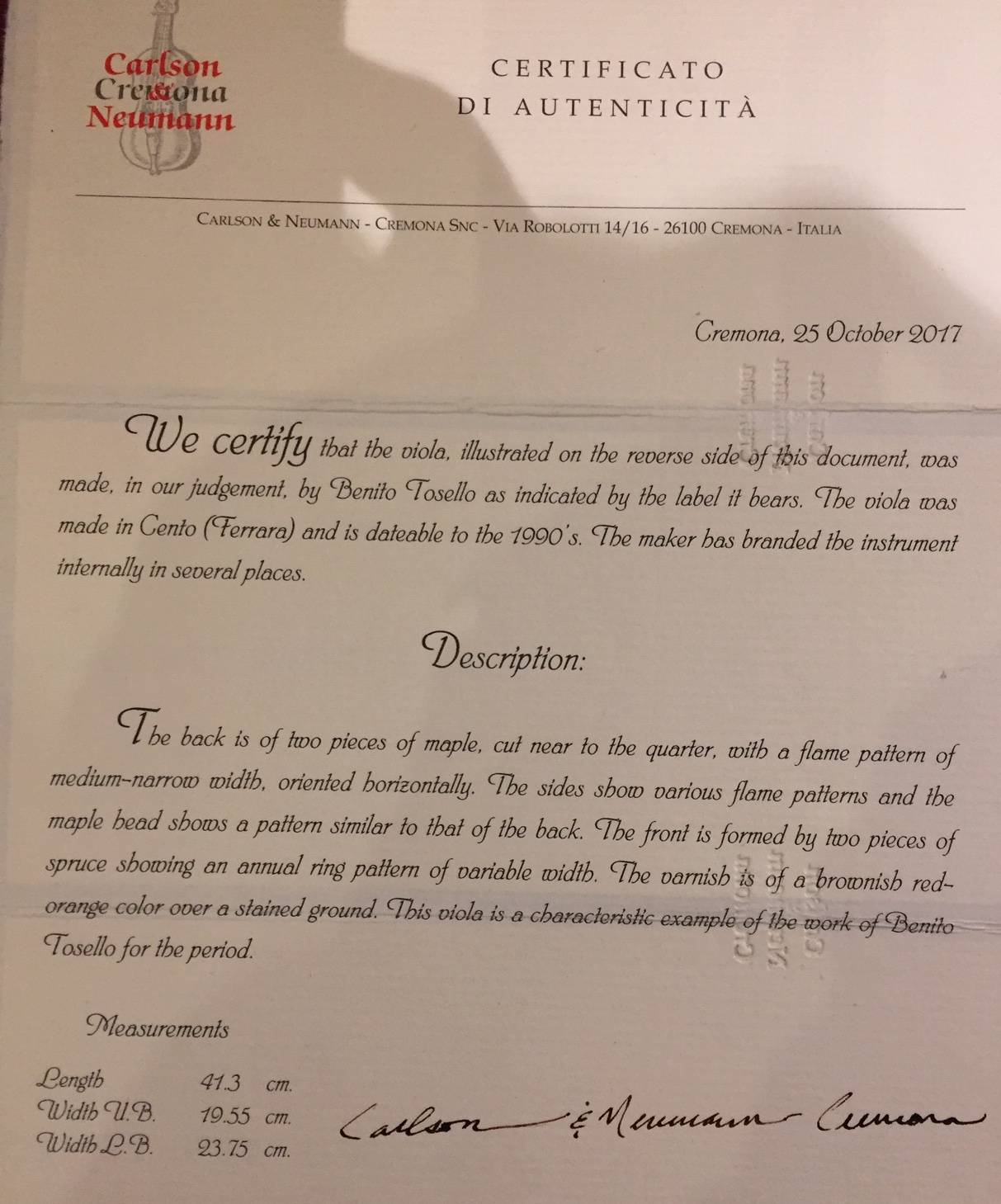 Italian viola by Benitto TOSSELLO bearing the label. With certificate.