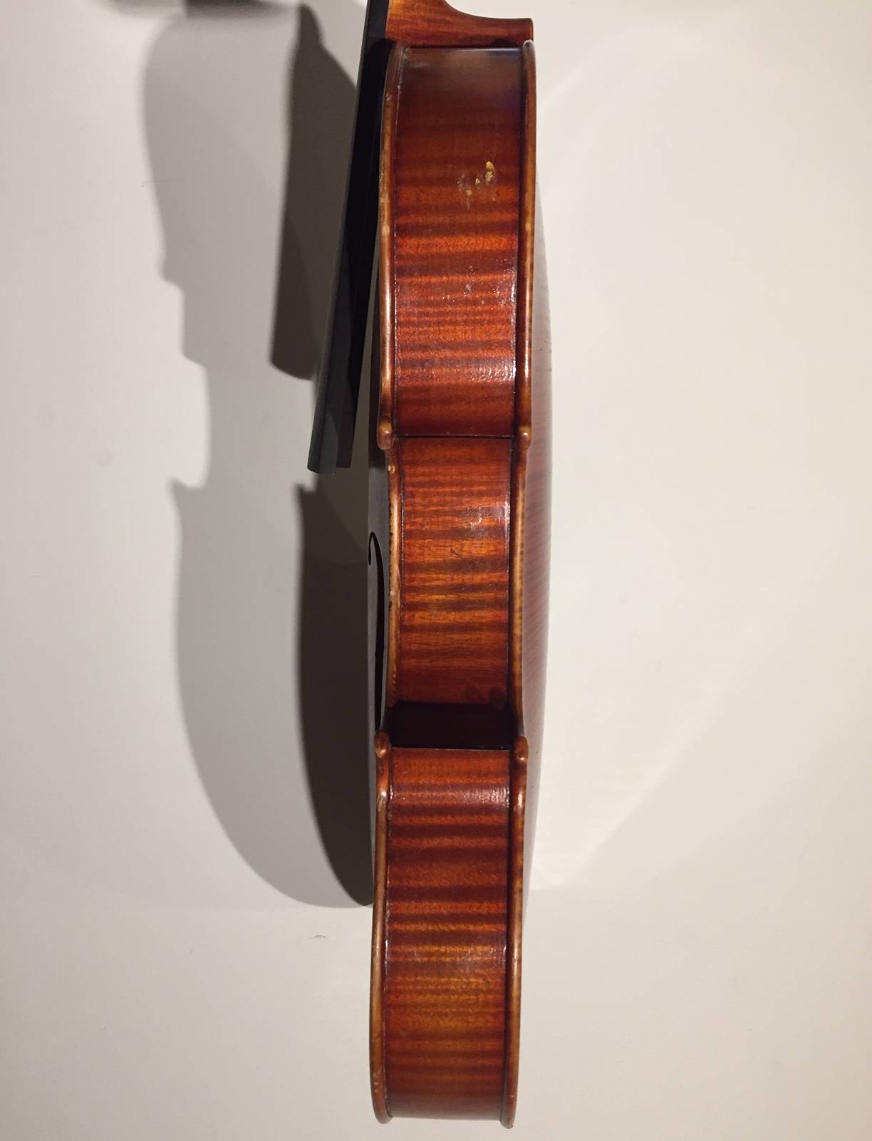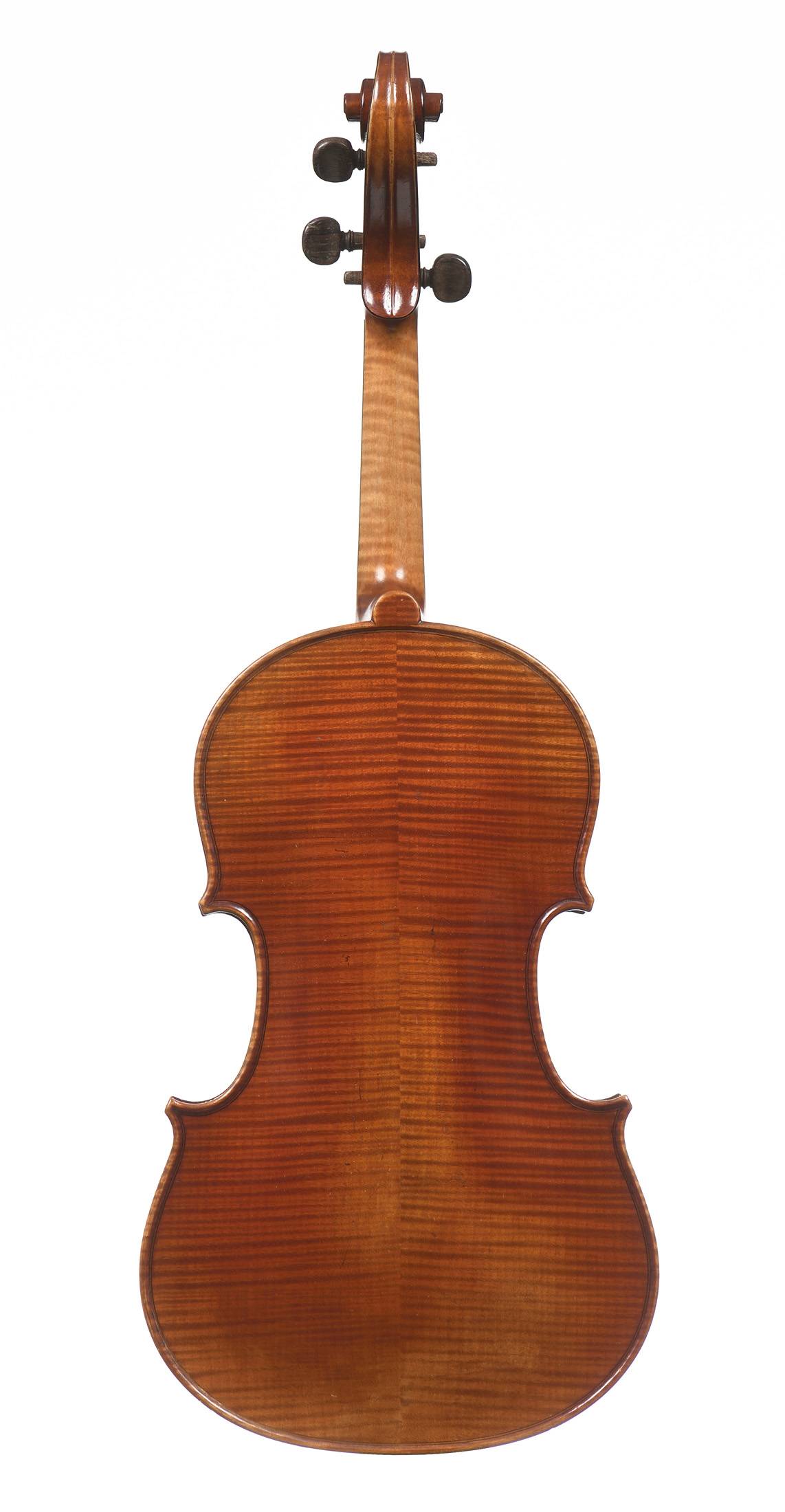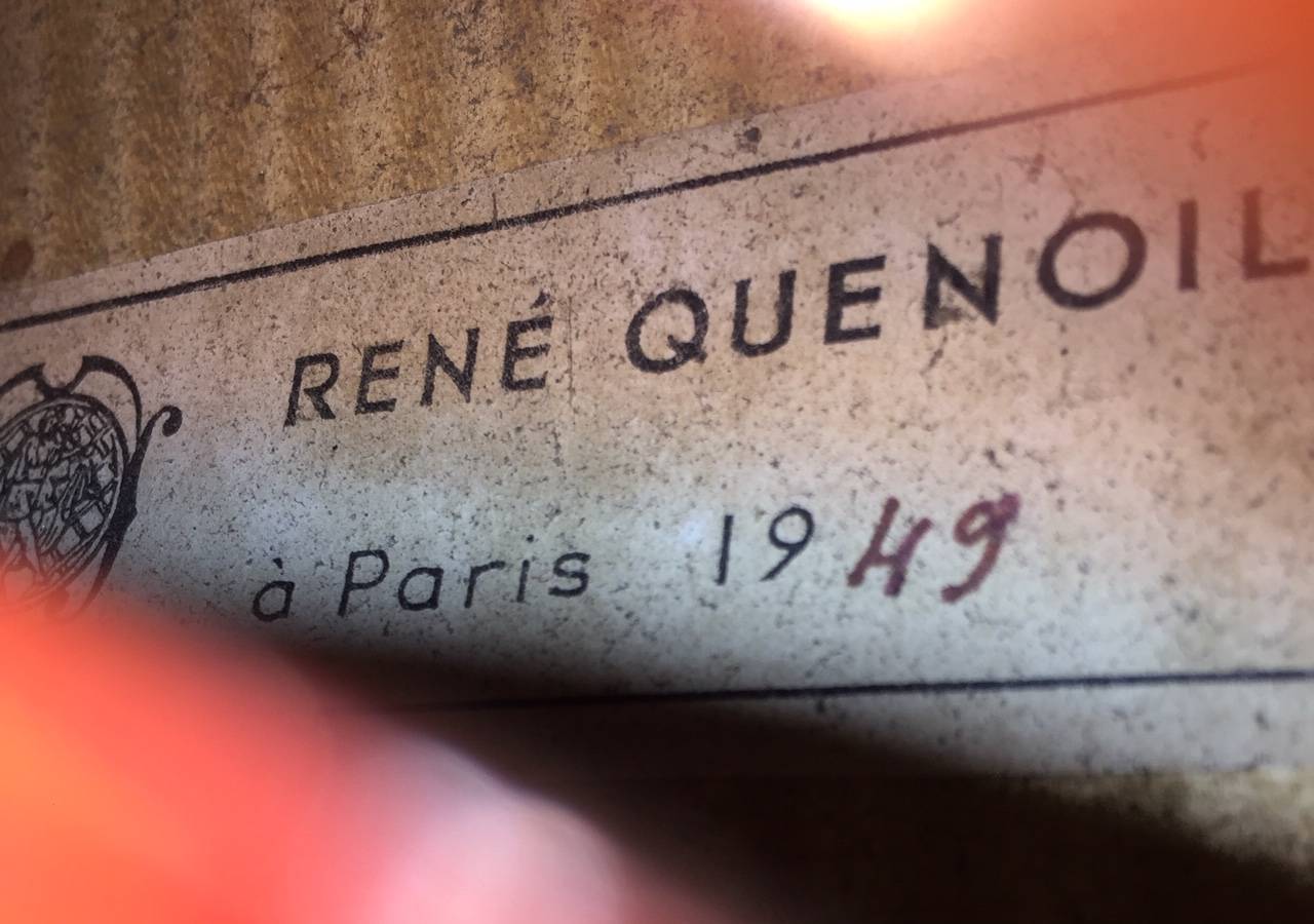 portant une étiquette "RENE QUENOIL à Paris 1949", et la marque au fer. Fond de deux pièces en érable. Vernis brun rouge sur fond doré. 380 mm.