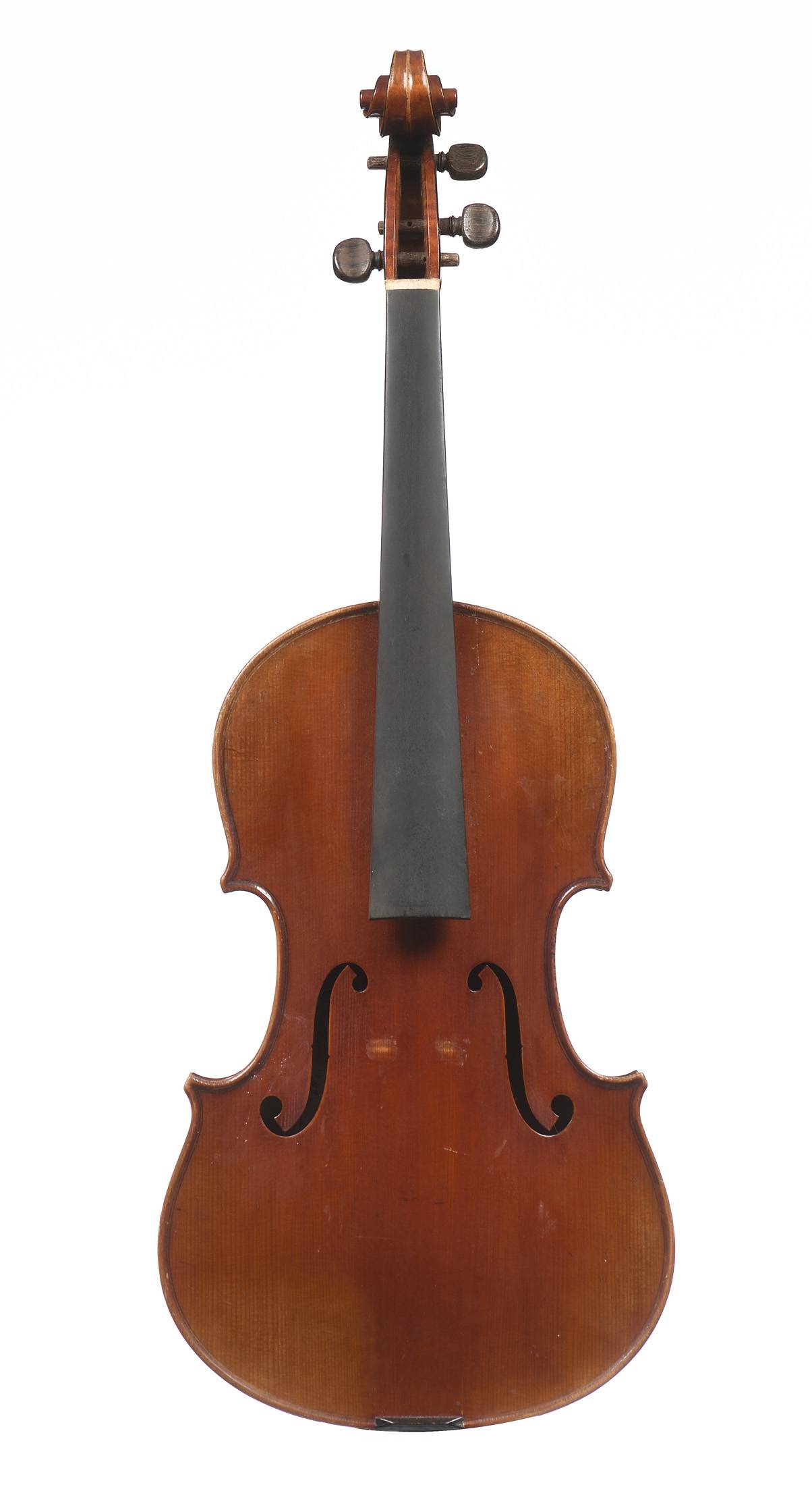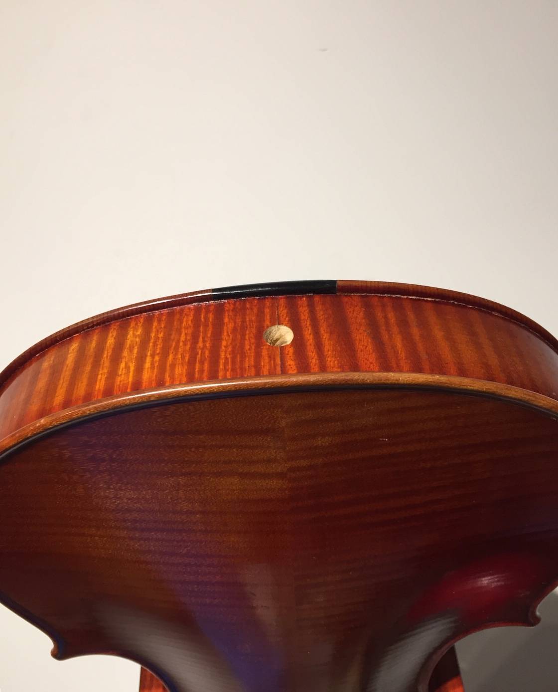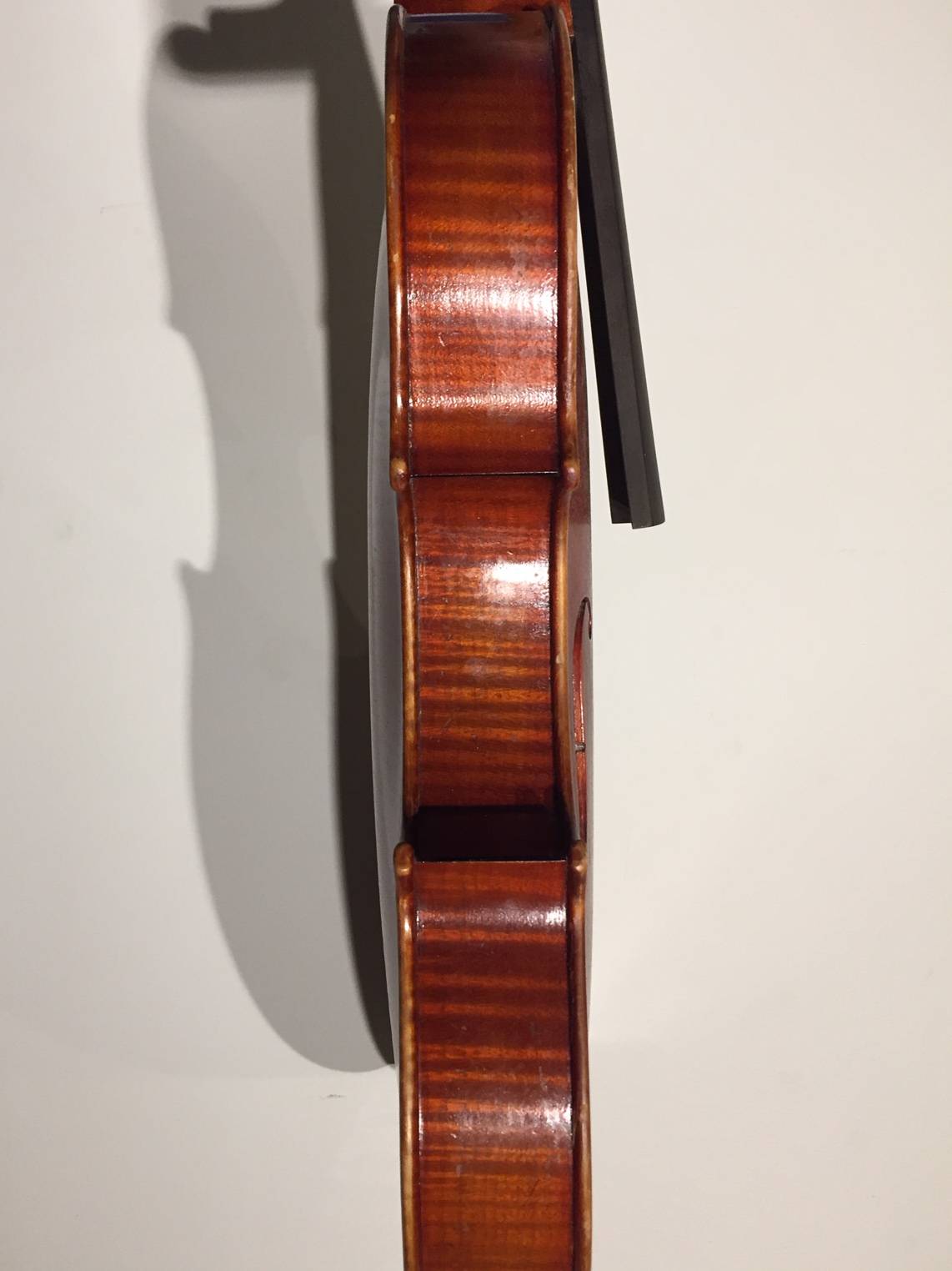 portant une étiquette "RENE QUENOIL à Paris 1949", et la marque au fer. Fond de deux pièces en érable. Vernis brun rouge sur fond doré. 380 mm.
