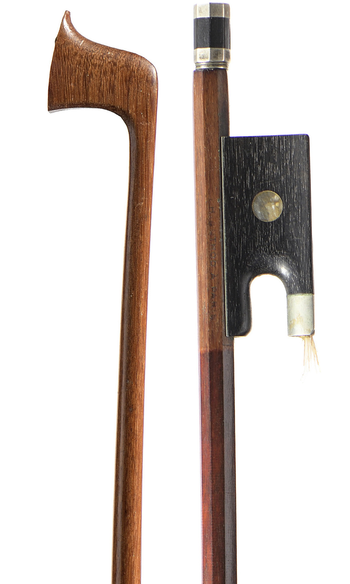 portant une marque au fer "H.BUTHOD A PARIS". Belle baguette en pernambouc brun rouge. Hausse ébène avec grain. Monté maillechort. Bouton ébène en trois pièces en ébène et maillechort.