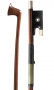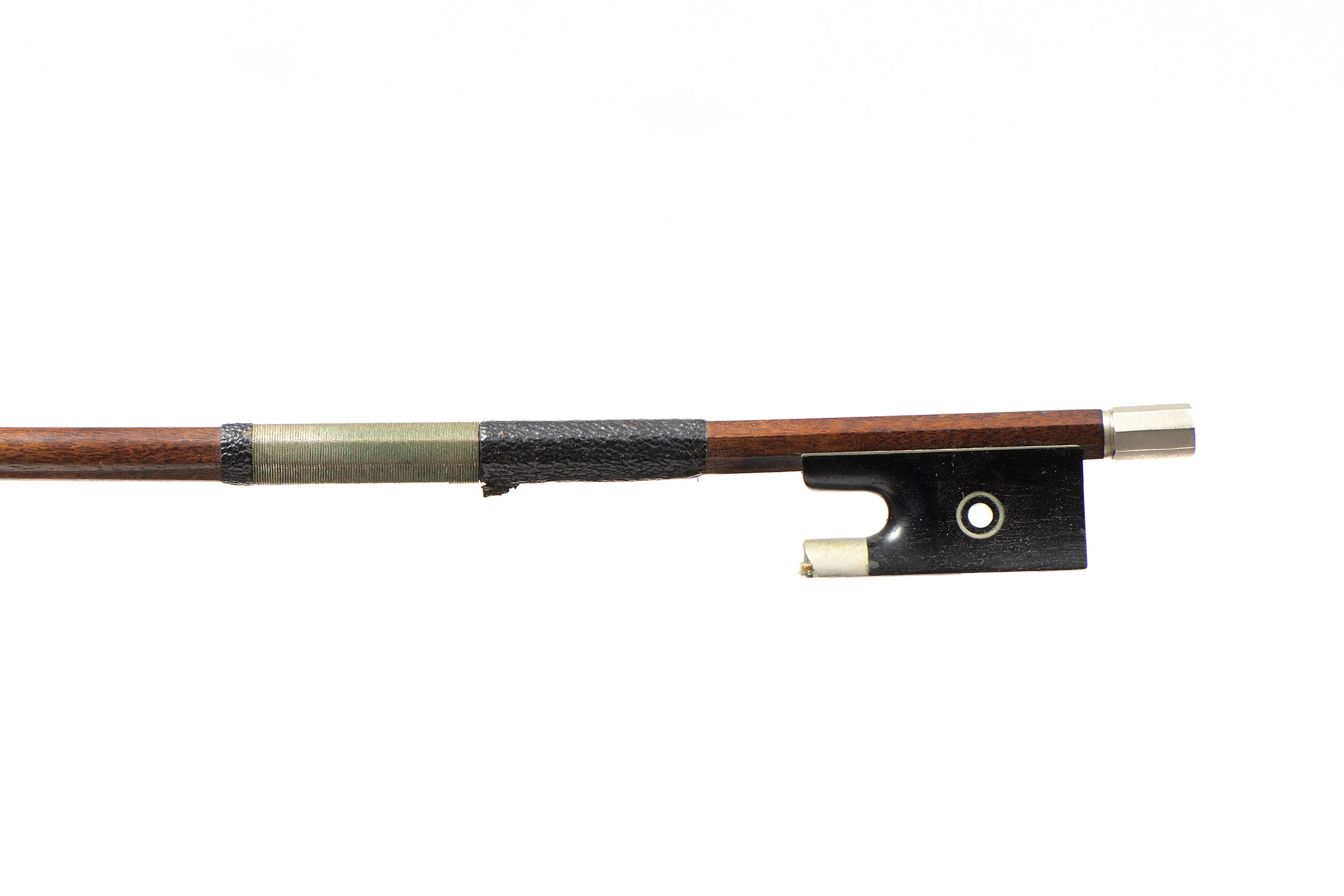 fai à Mirecourt au début du XXe. Baguette ronde en bois de pernambouc. Hausse ébène, monté maillechort. 727 mm. 52 g sans mèche, ni plaque de tête.