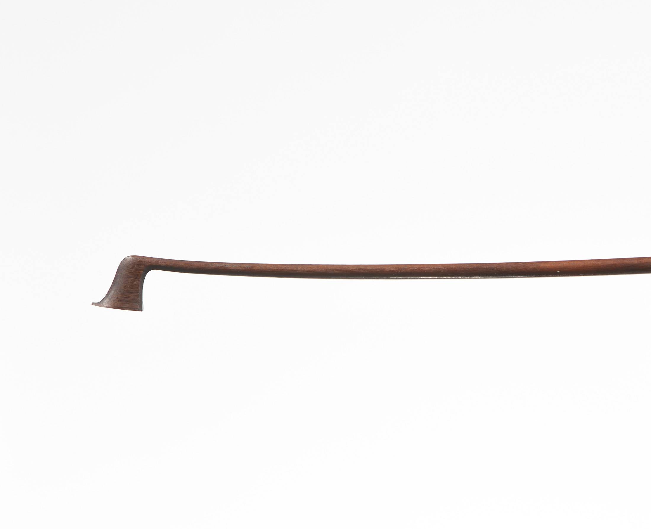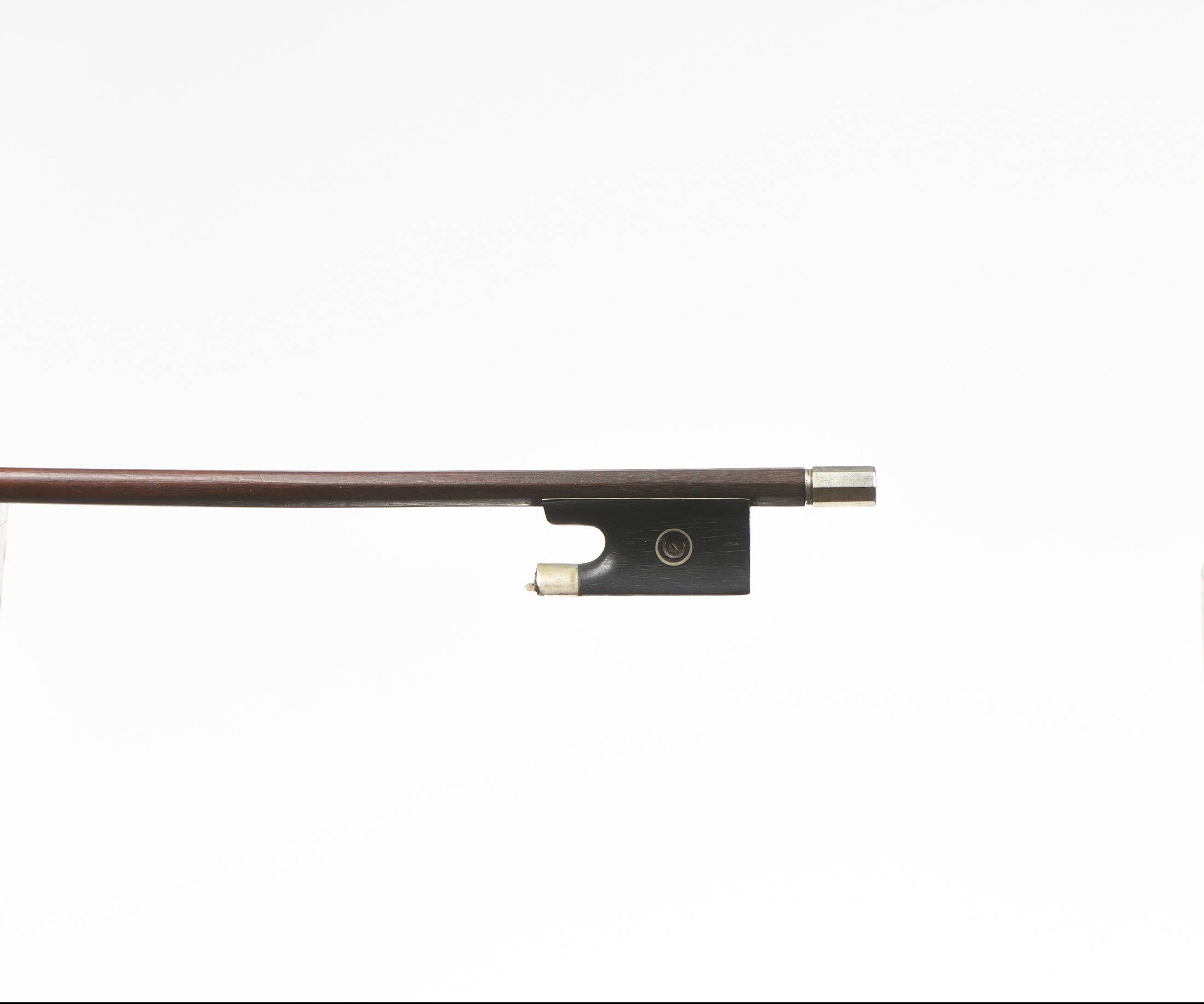 portant la marque au fer "C.BAZIN". Baguette ronde en bois de pernambouc. Hausse ébène avec grain cerclé, montée maillechort. Manque les deux grains. 45 g sans mèche, ni garniture, ni plaque de tête...