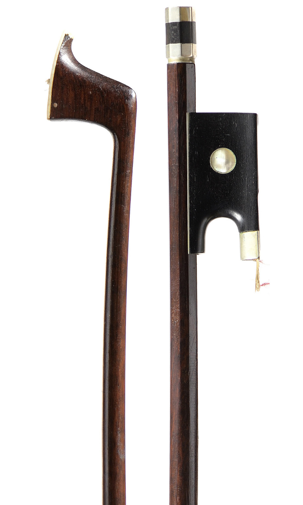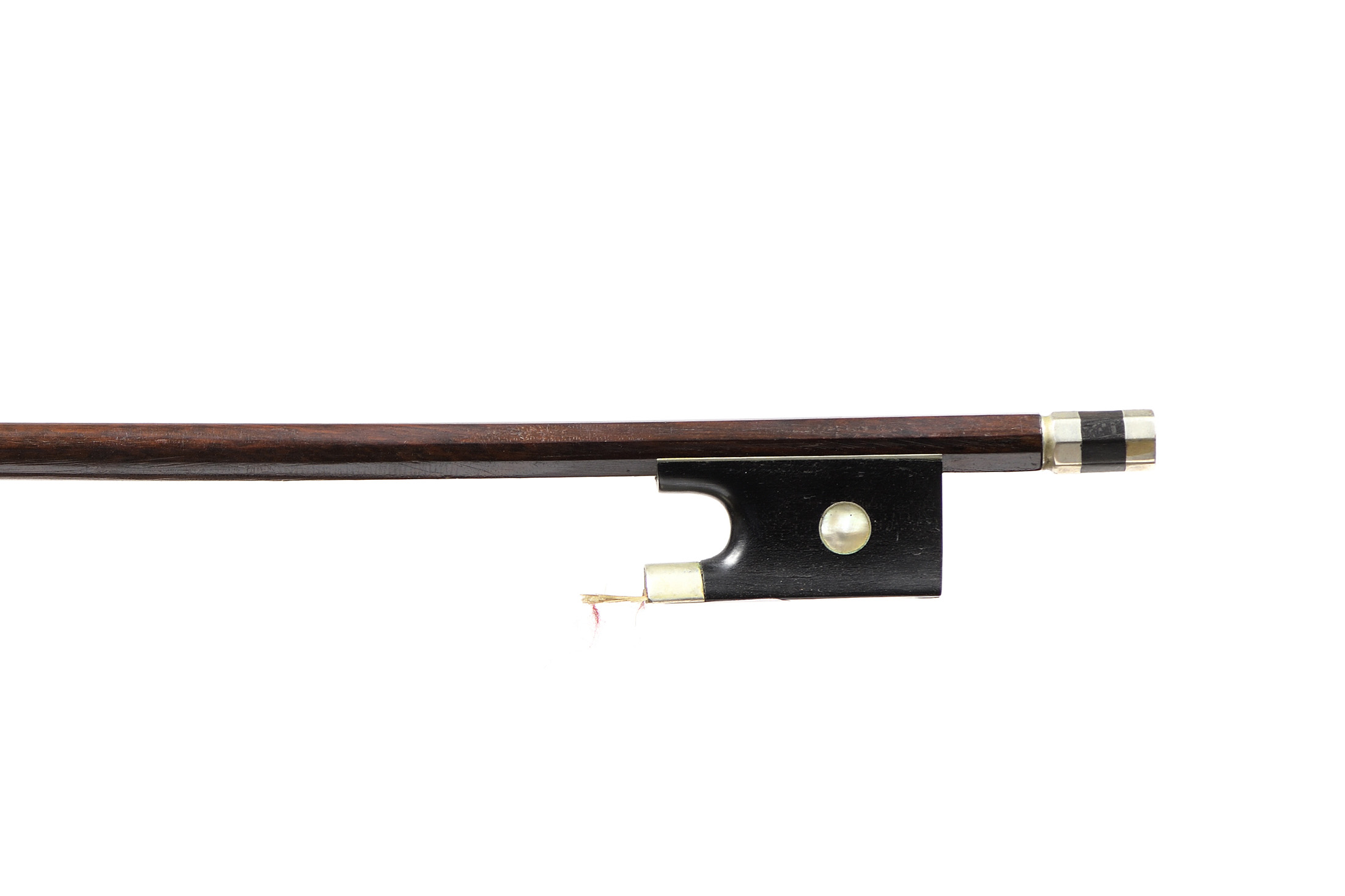 Baguette ronde en bois d'amourette. Hausse ébène, monté maillechort. 715 mm. 59 g sans mèche, ni garniture.