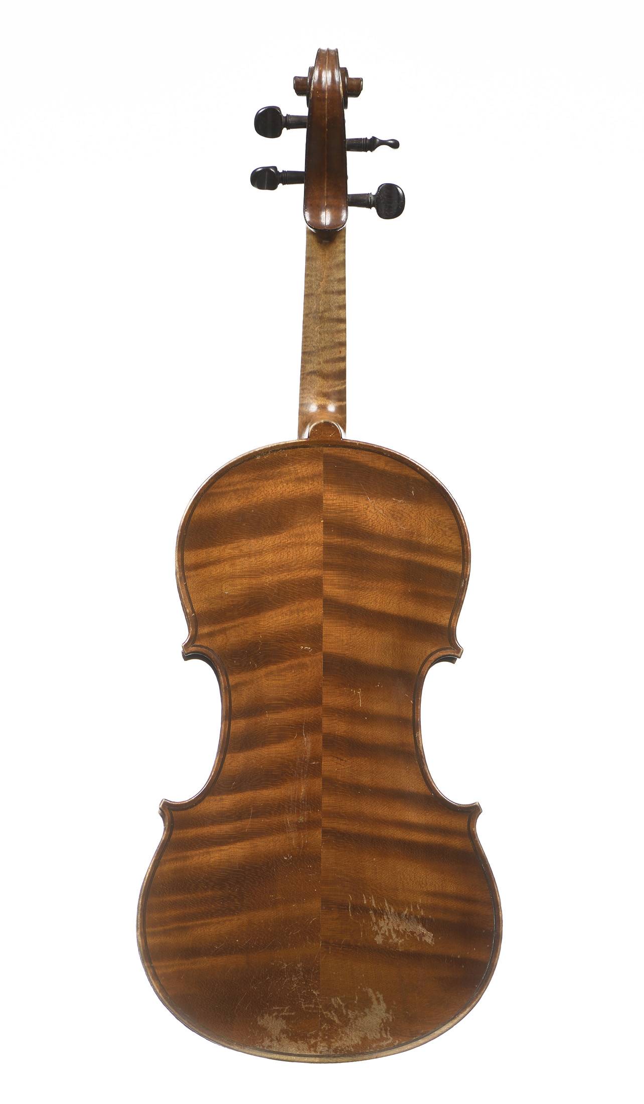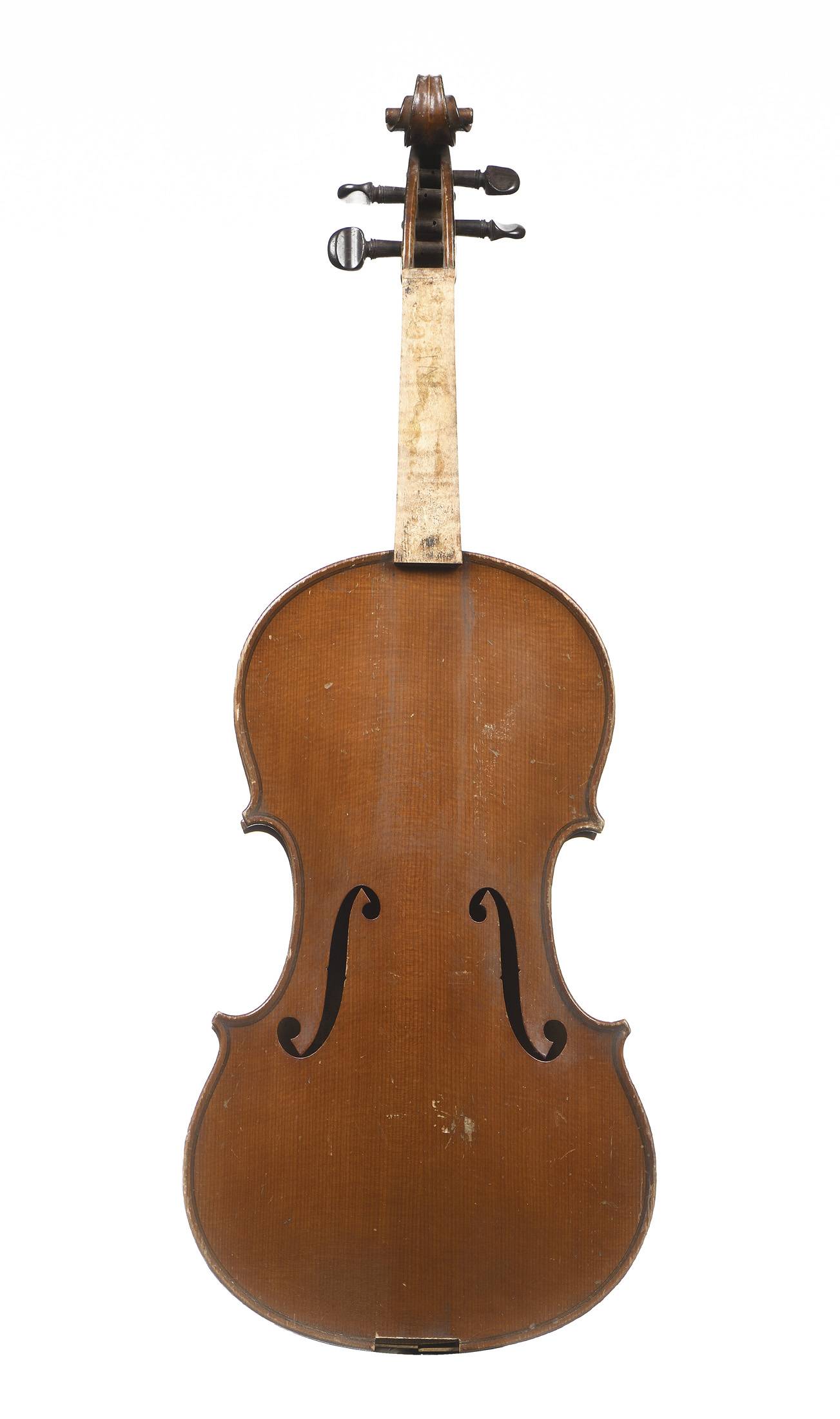 fait vers 1910 sur un modèle Guarneri. Portant l'étiquette " 1907 N°295". Fond de deux pièces en érable avec cassure à l'âme restaurée. Fracture d'âme au fond. A restaurer. 363 mm.