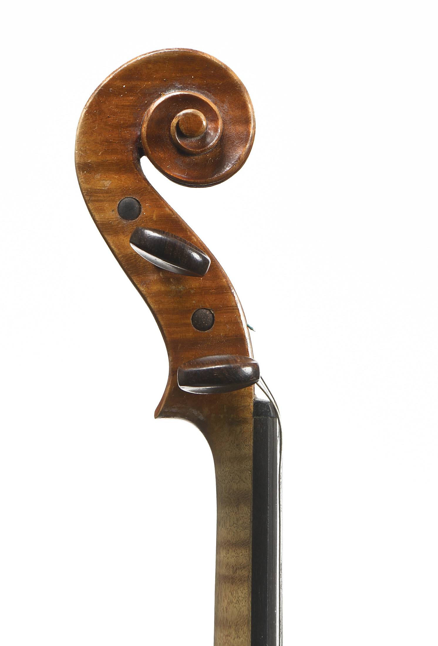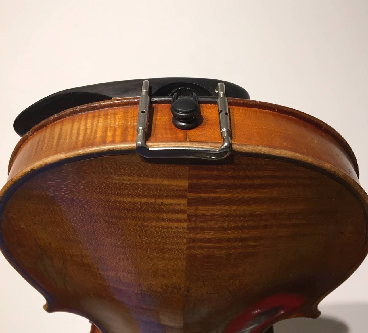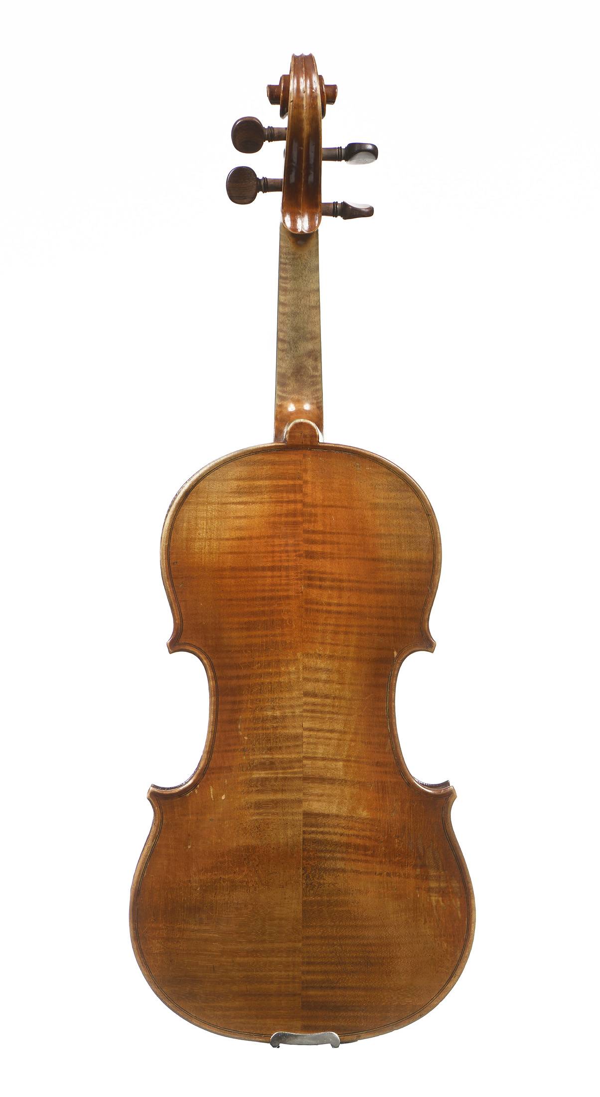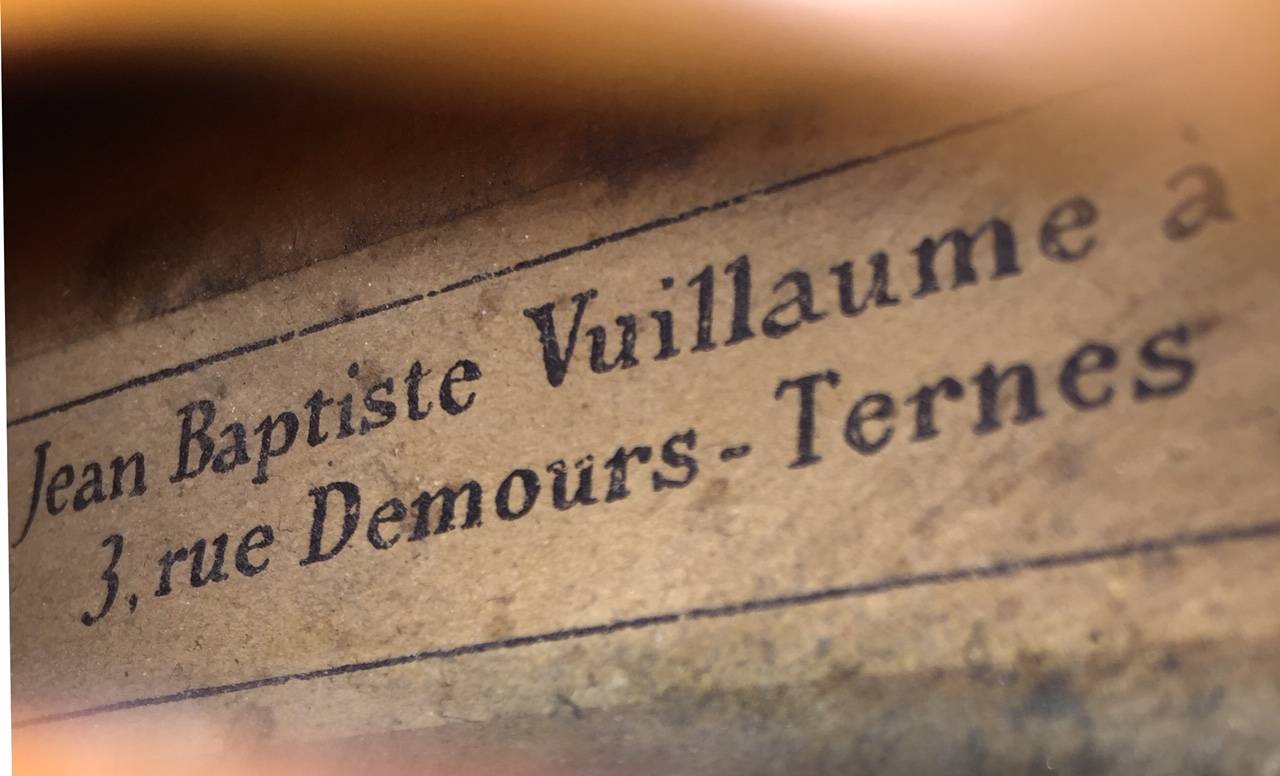 portant une étiquette "Jean-Baptiste Vuillaume à Paris...". Fond de deux pièces en érable. Vernis brun orangé sur fond doré. Avec boite BAM et archet en pernambouc. 358 mm. Une cassure de table.