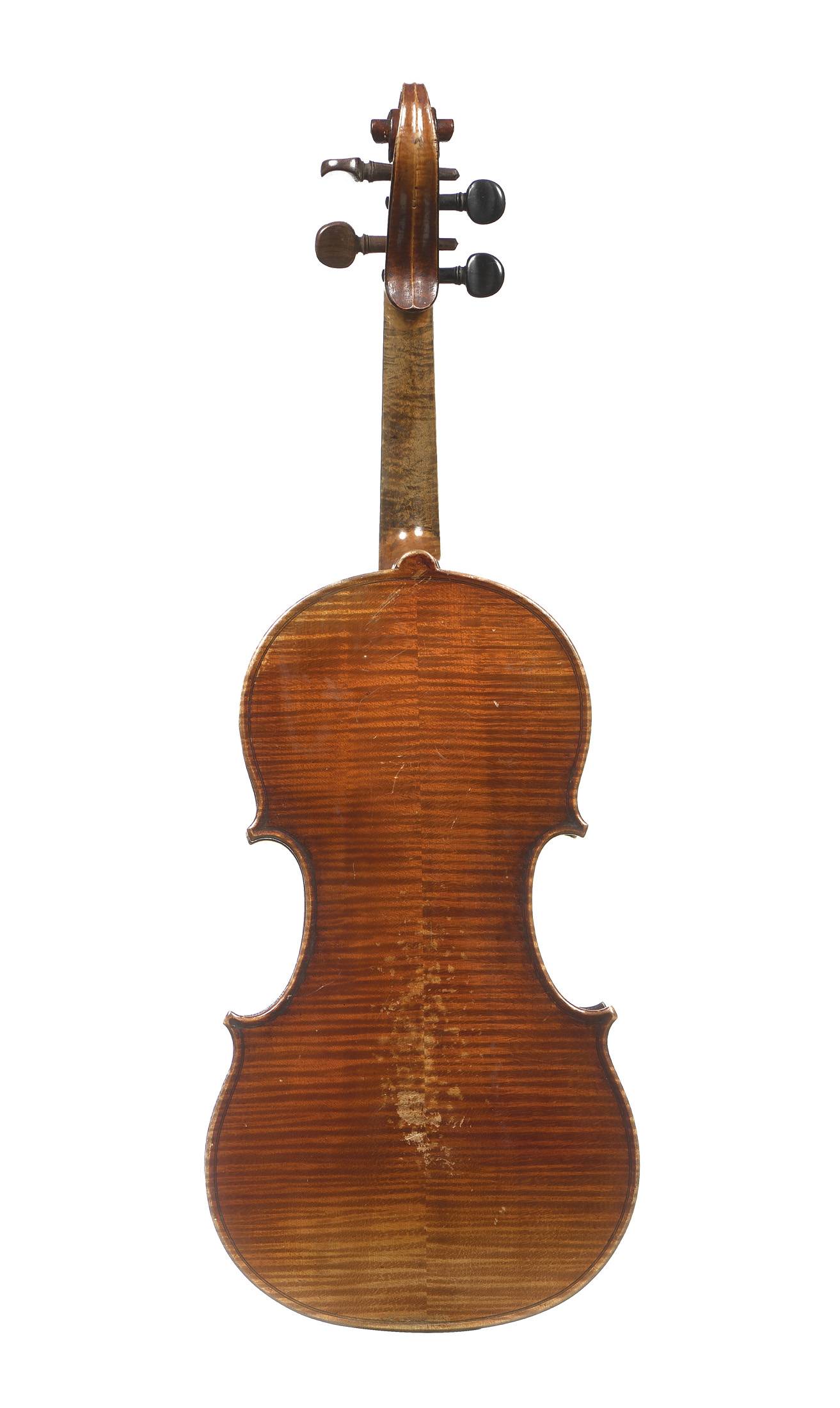 portant une étiquette "Antonius Stradivarius... 1721.". Fond de de deux pièces en érable. Vernis brun orangé sur fond doré. Avec boite et archet. Usures. 359 mm.