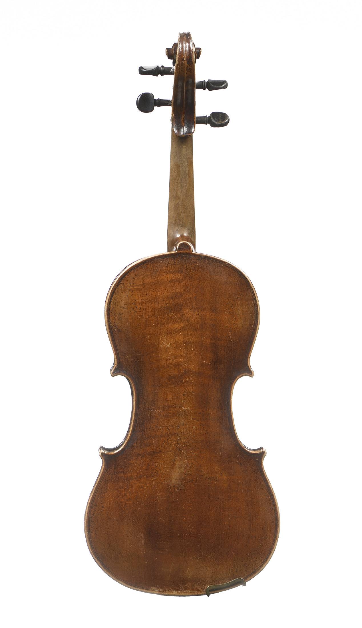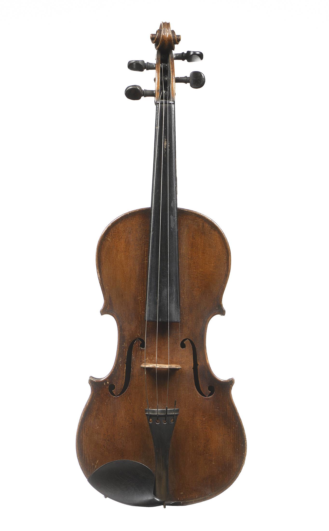 portant une étiquette "Antonius Stradivarius Cremonensis...". Fond de deux pièces en érable en érable aux ondes légères. Table en épicéa aux pores serrés au centre, s'élargissant sur les bords. Avec boite et archet. 340 mm.