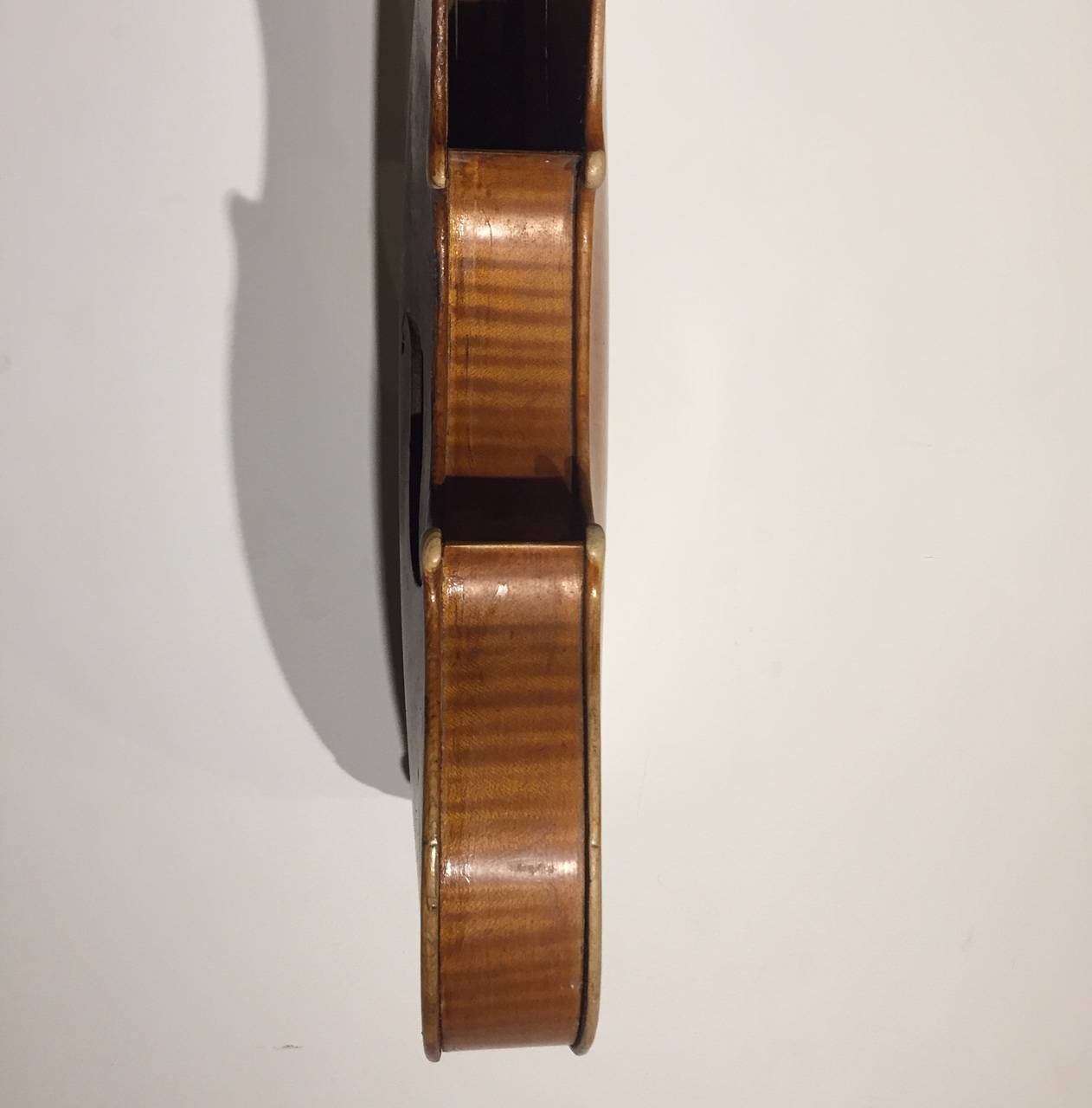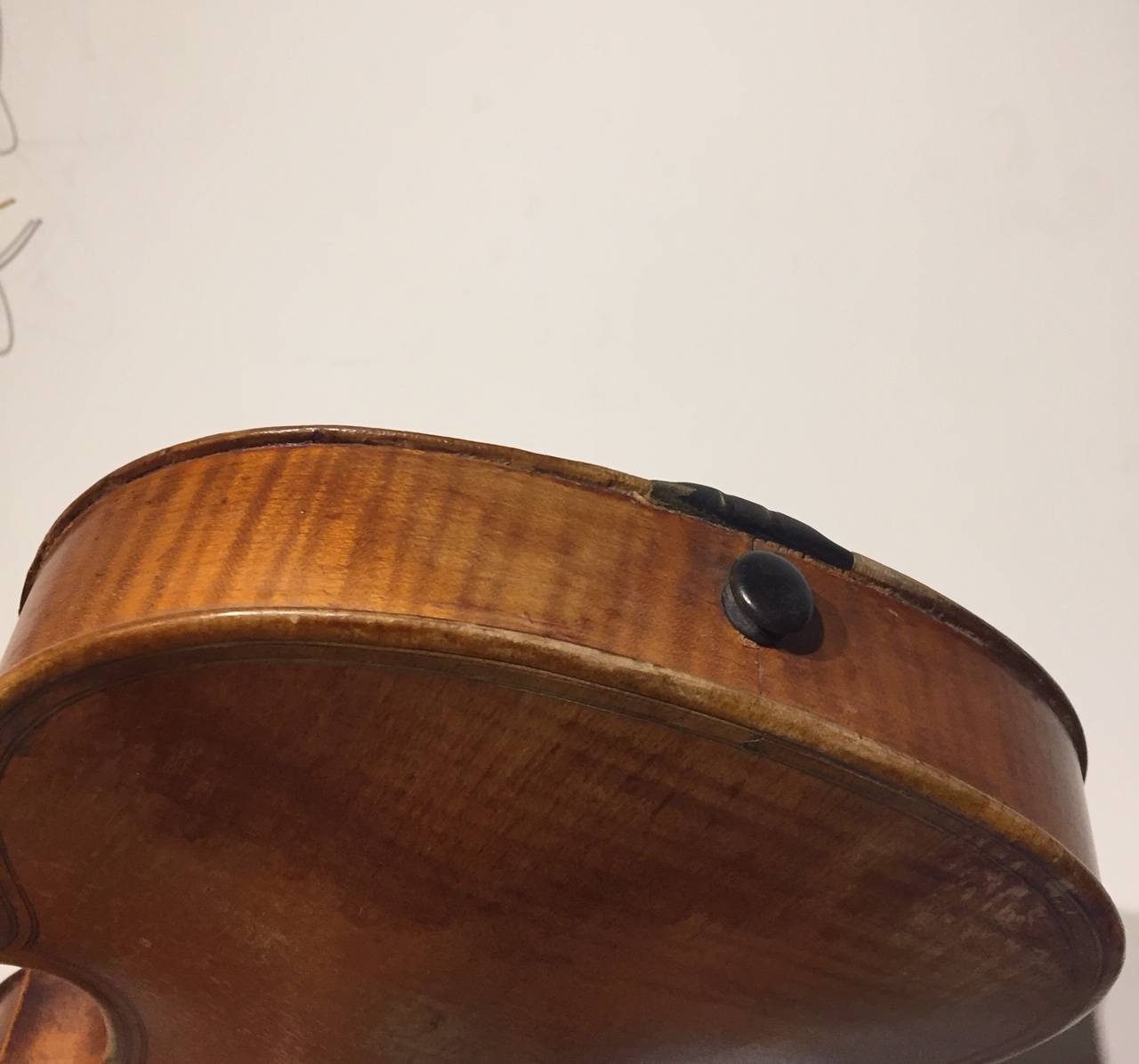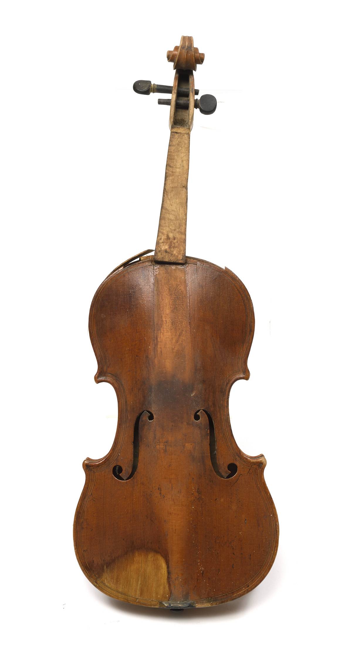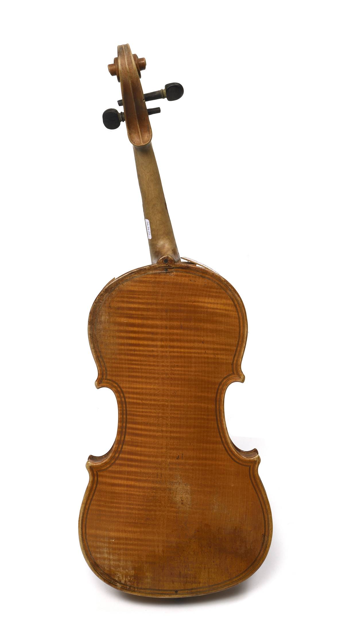 dont il porte l'étiquette "Nicolas MAUCHANT Ainé..." et une seconde étiquette de réparation. Fond d'une pièce en érable ondé. Modèle Maggini. Vernis jaune paille. L'ensemble est à restaurer. 364 mm.