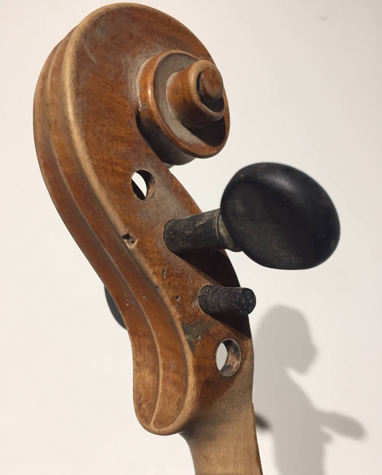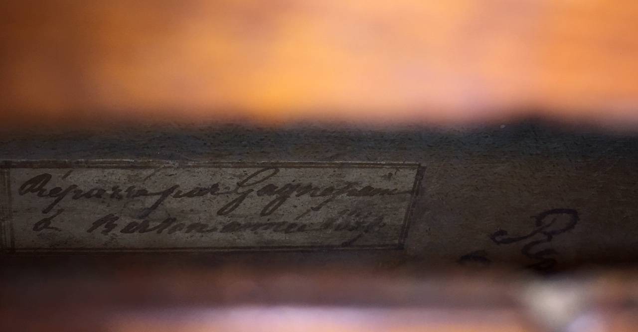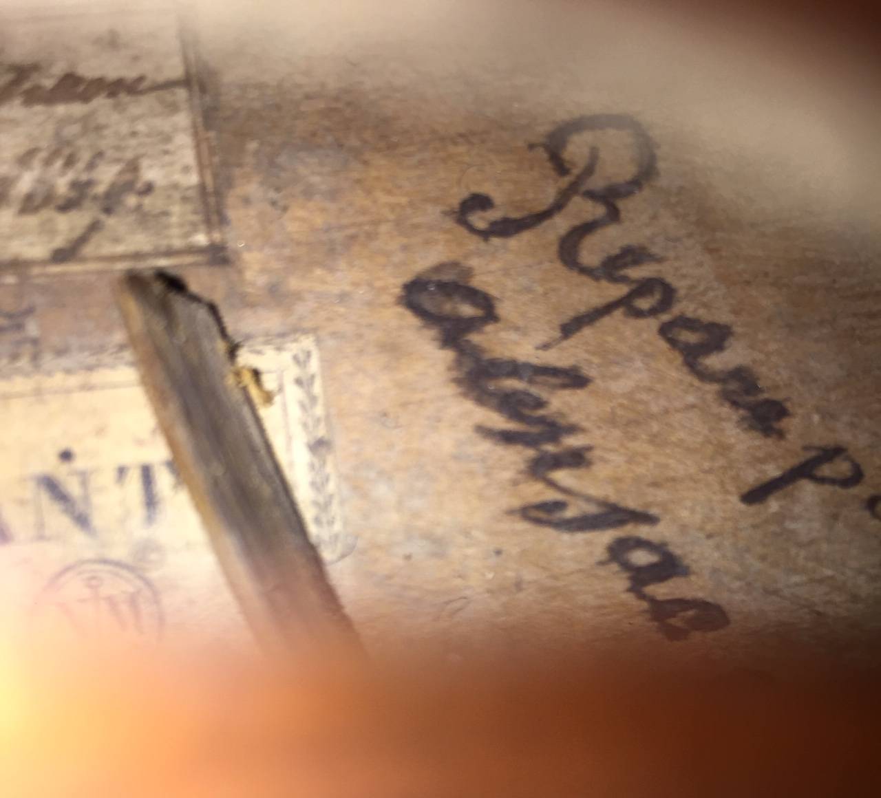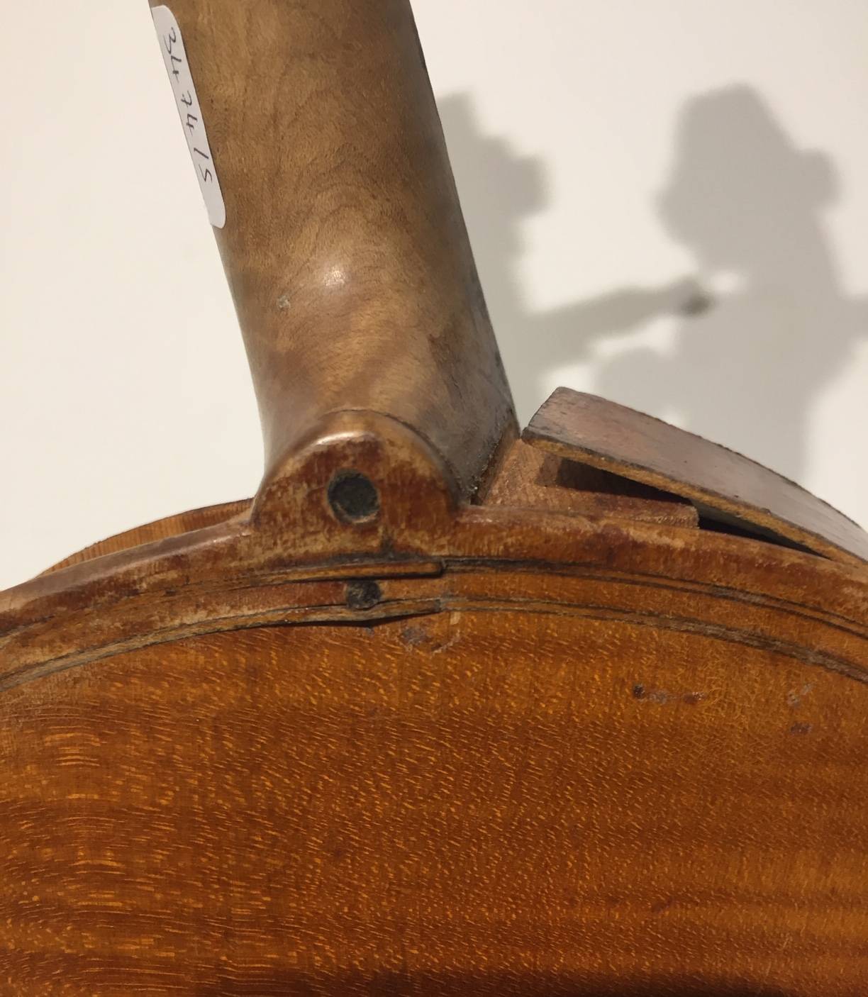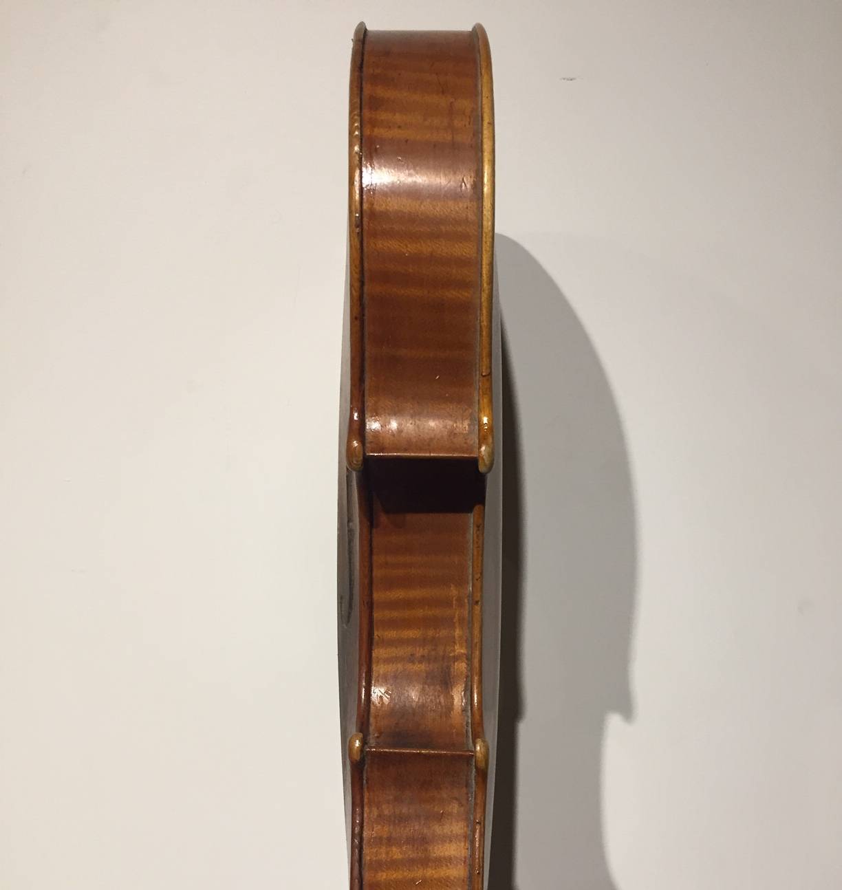 dont il porte l'étiquette "Nicolas MAUCHANT Ainé..." et une seconde étiquette de réparation. Fond d'une pièce en érable ondé. Modèle Maggini. Vernis jaune paille. L'ensemble est à restaurer. 364 mm.