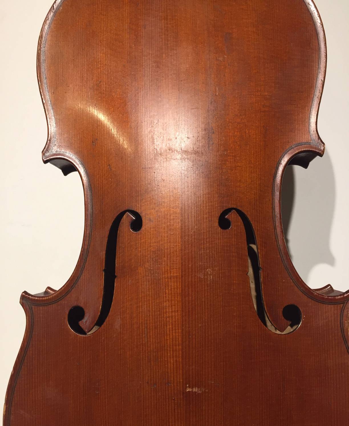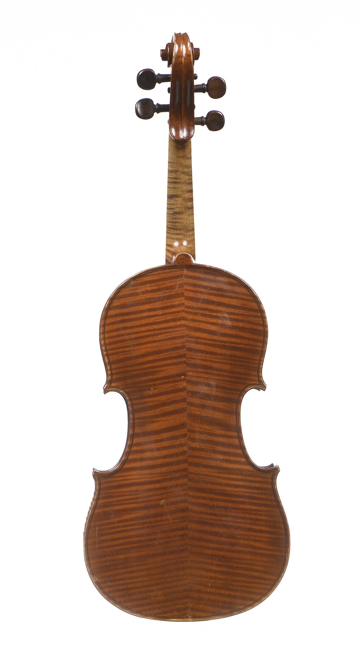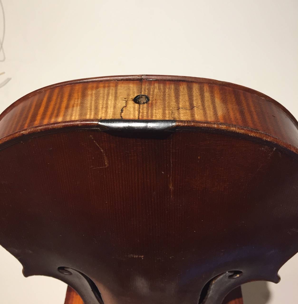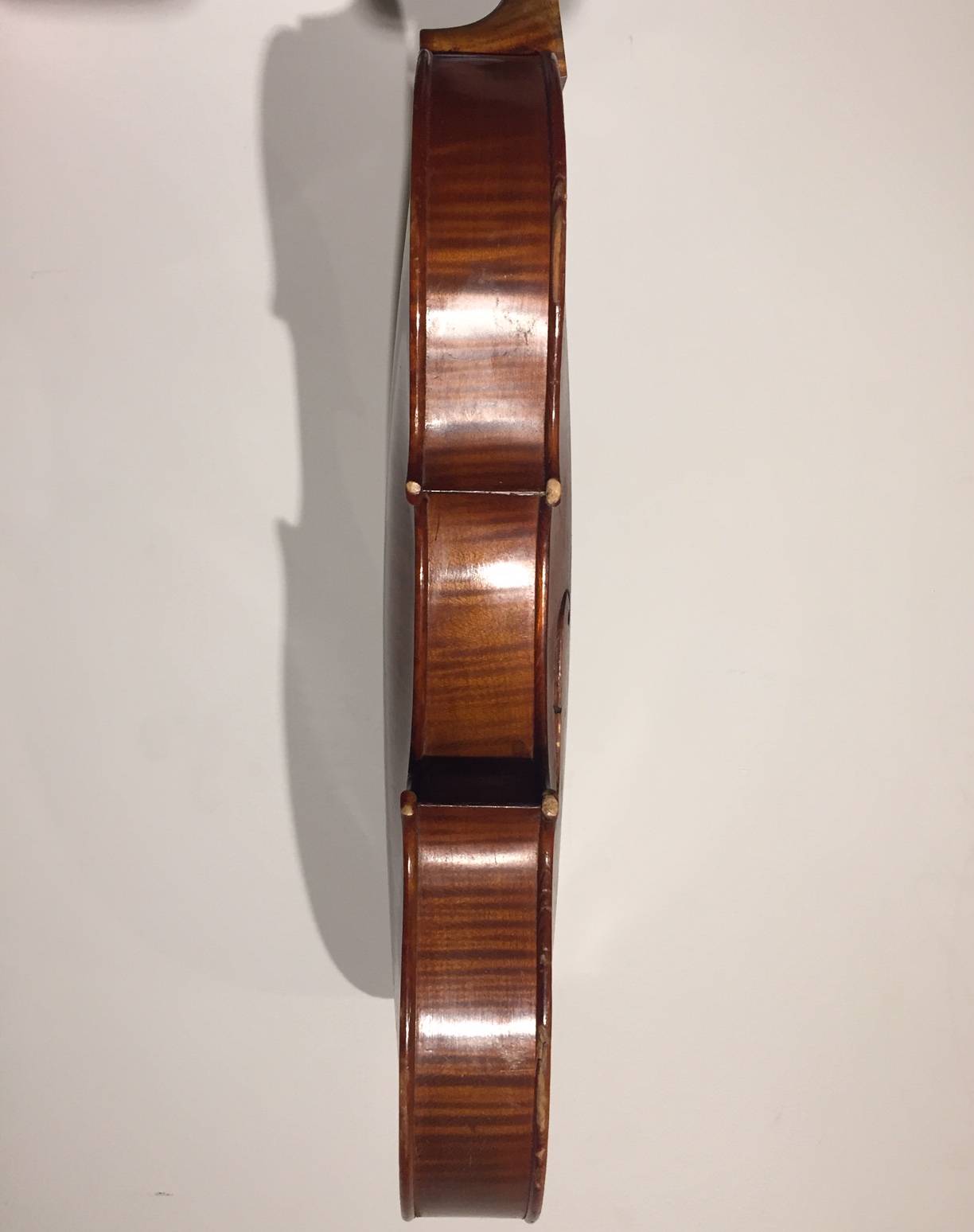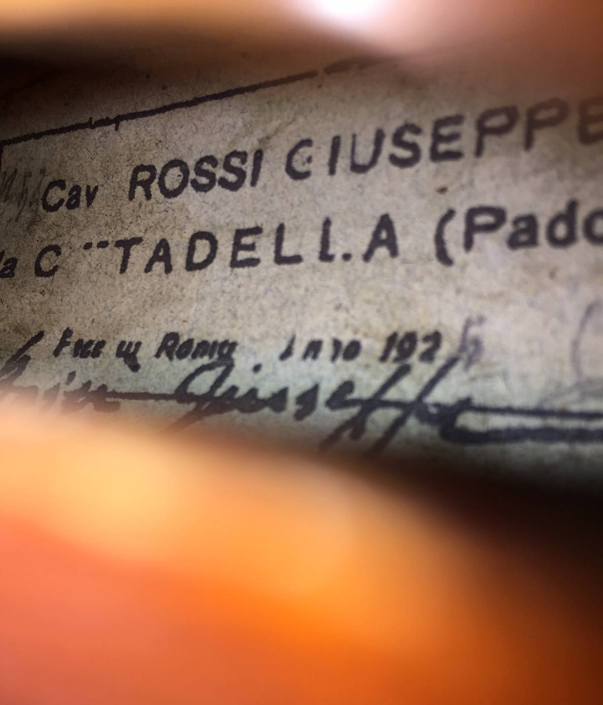portant une étiquette apocryphe "Cav ROSSI GIUSEPPE...". Fond de deux pièces en bel érable ondé. Vernis brun doré. Table en épicéa aux pores fins. 357 mm. Cassures.