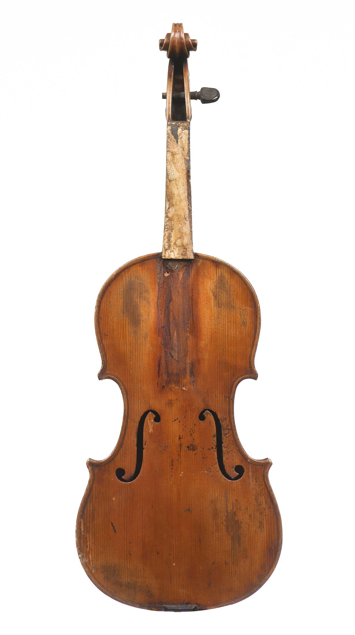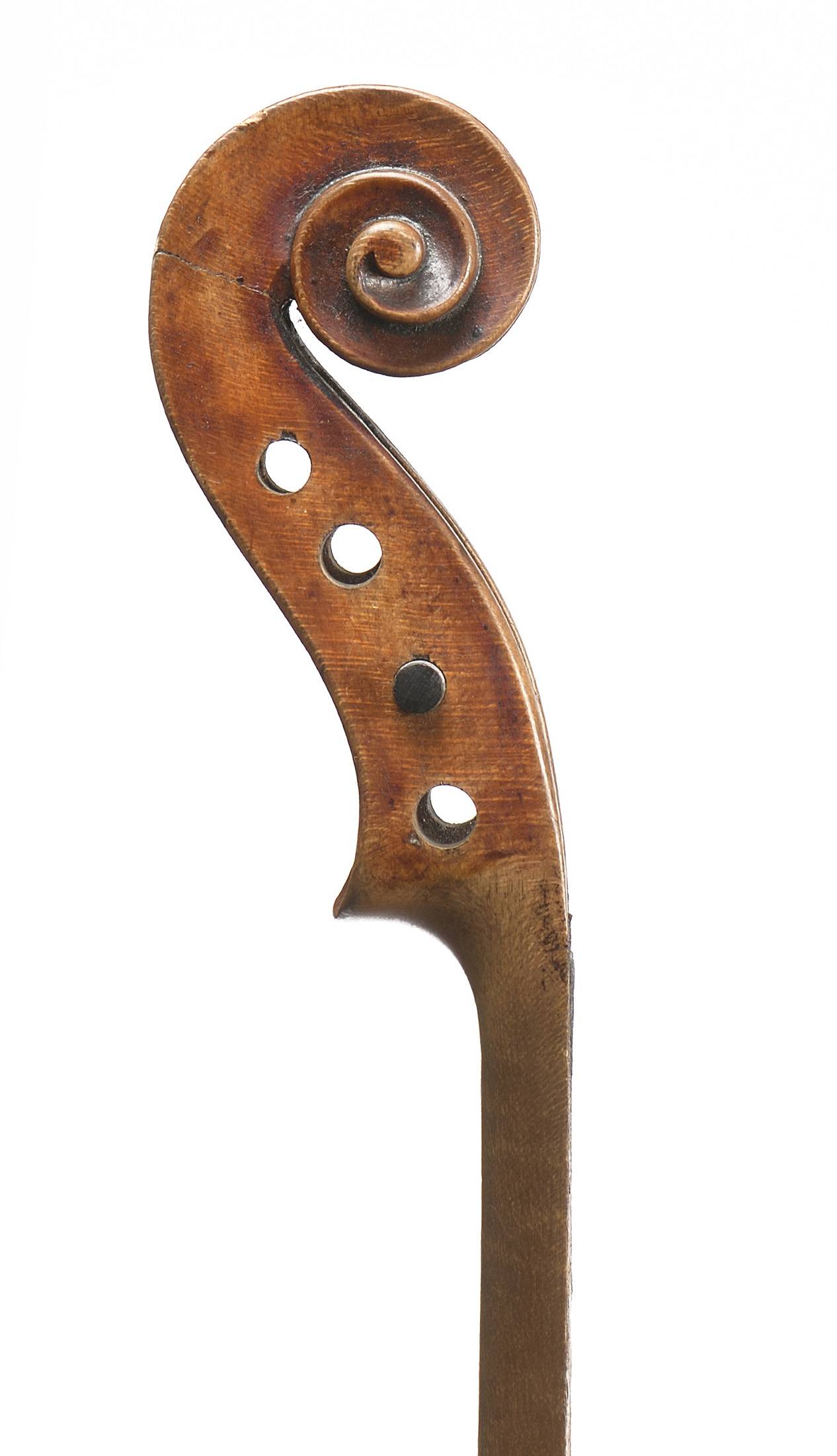Fond de deux pièces en érable presque sans ondes. Vernis brun rouge sur fond doré. L'ensemble est à restaurer : Diverses cassures et traces de vers. Tête cassée, réparée.