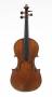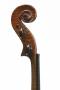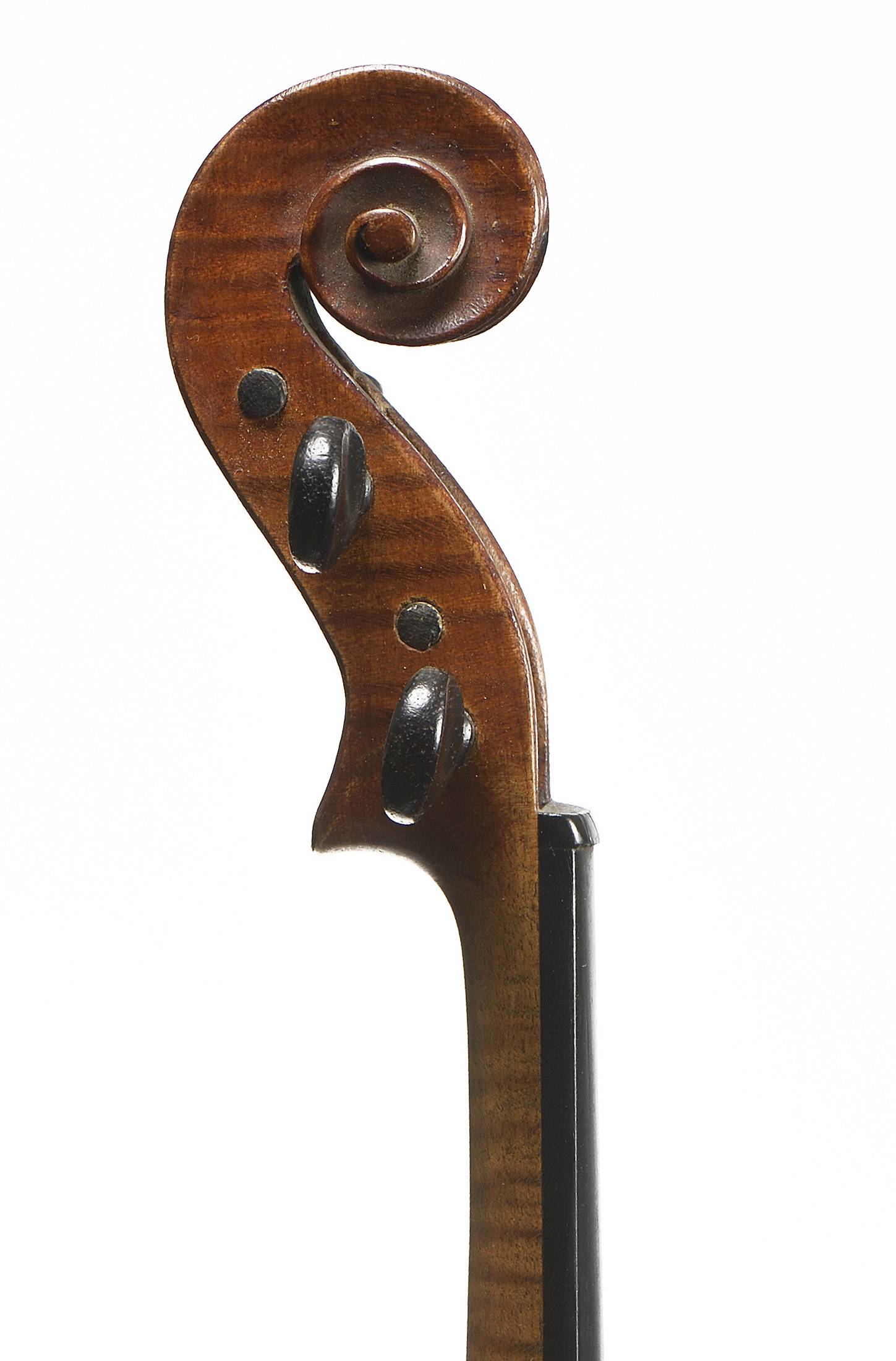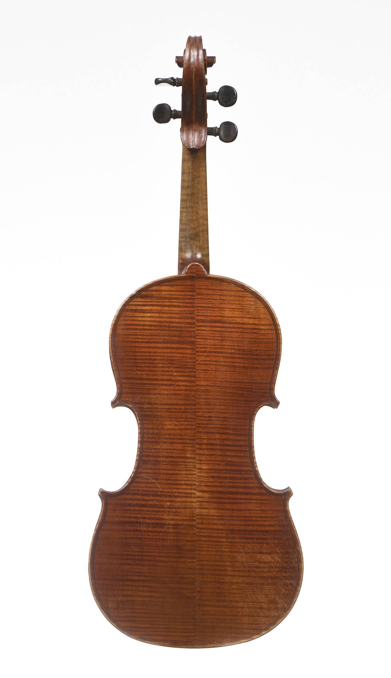 portant une étiquette Stradivarius. Fond de deux pièces en bel érable aux ondes fines et horizontales. Table en épica aux pores très fins au cente, s'élargissant sur les bords. Vernis brun orangé sur fond doré. 361 mm.