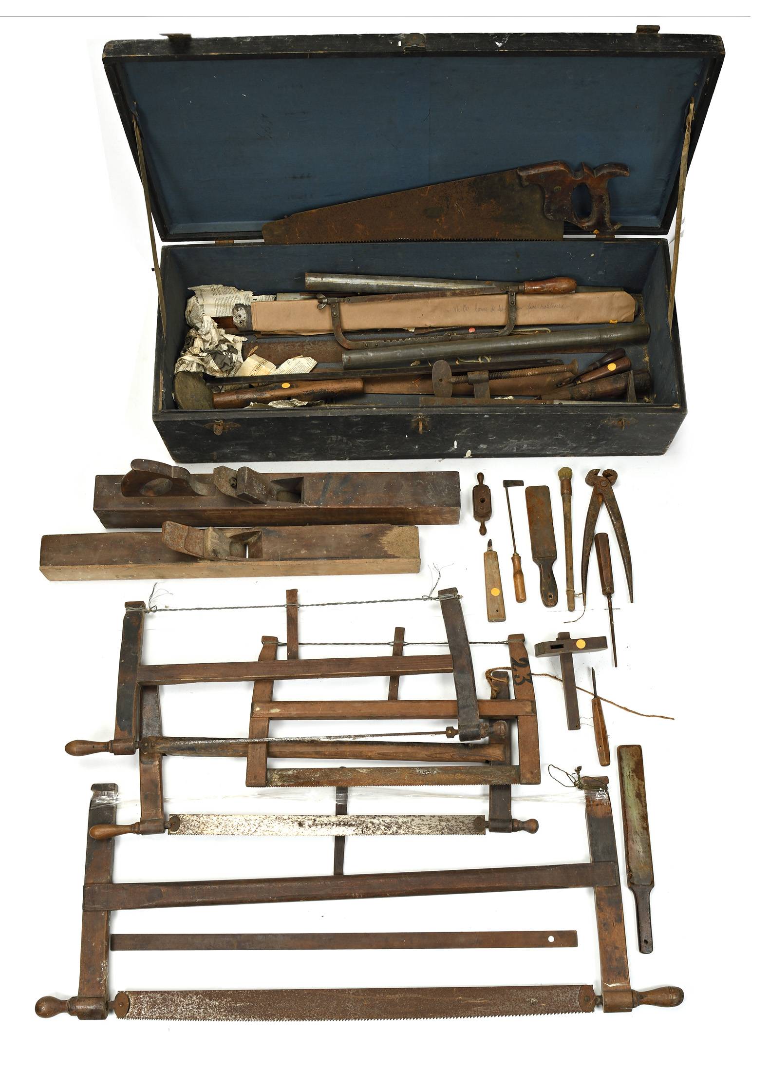 Important lot d'outils provenant de l'atelier de Emile FRANCAIS. Rabots, serre-joints, scies... En l'état: traces de vers.