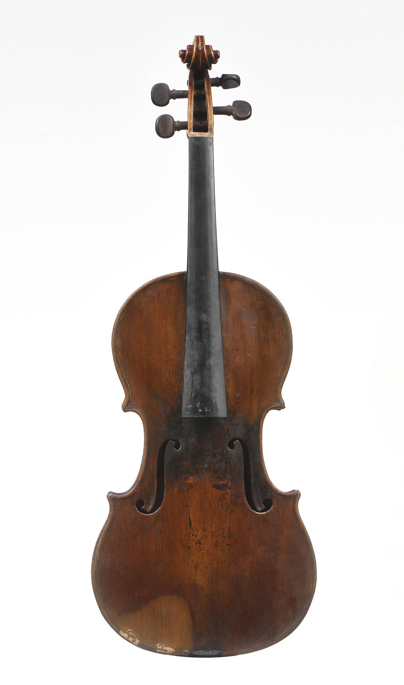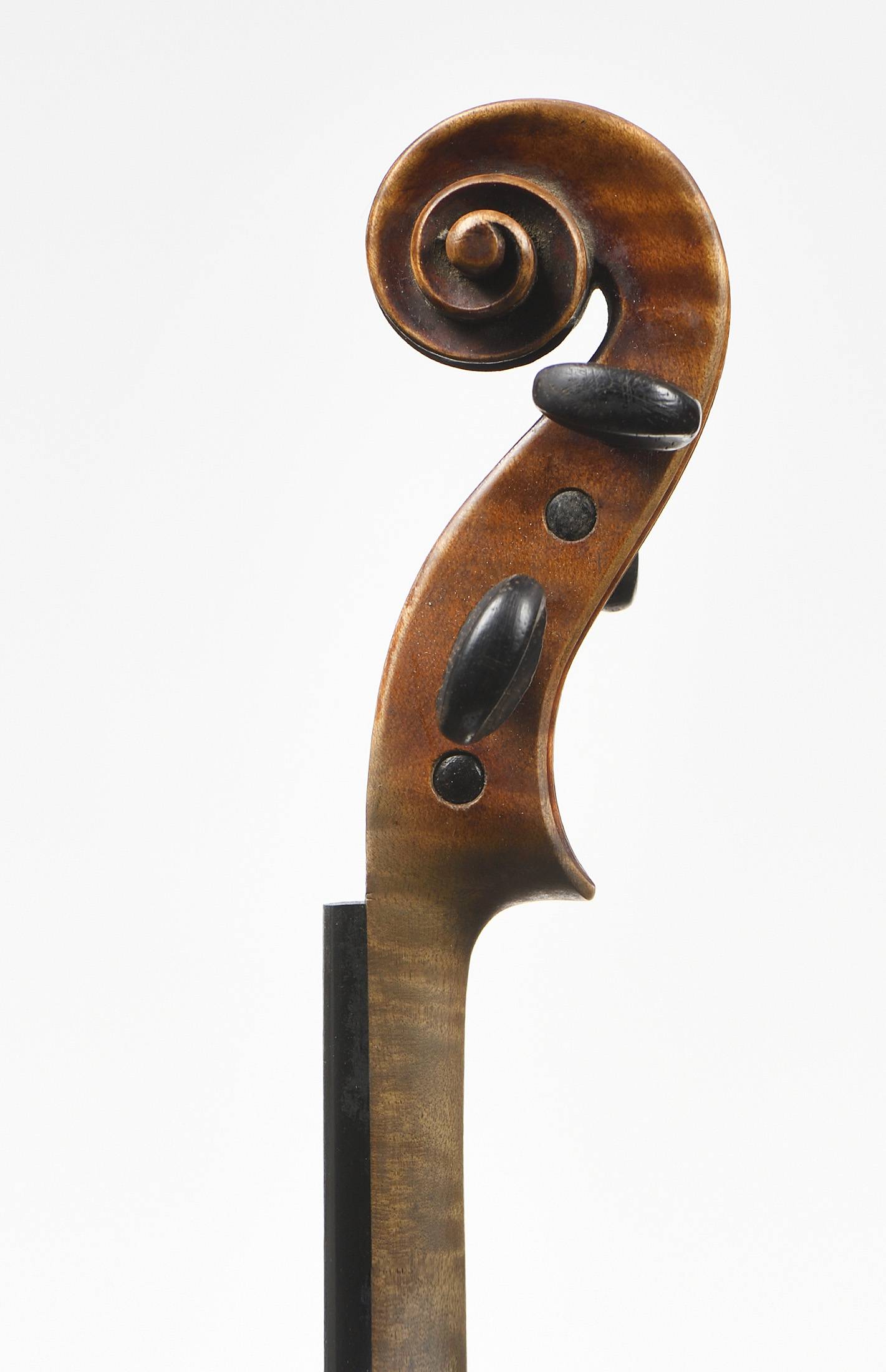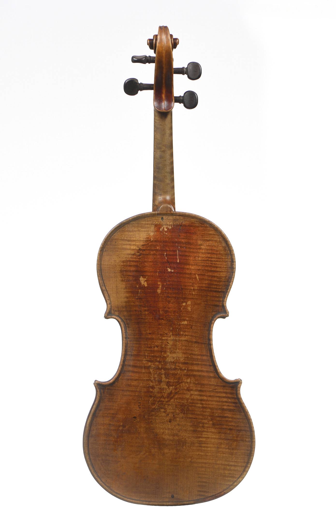 portant la marque au fer "PLUMEREL A PARIS", et l'étiquette "Réparé par Amel Luthier à Lorient 1856". Fond d'une pièce en érable aux ondes moyennes et régulières. Table de deux pièces en épicéa aux pores fins. Vernis brun rouge sur fond doré. 364 mm.