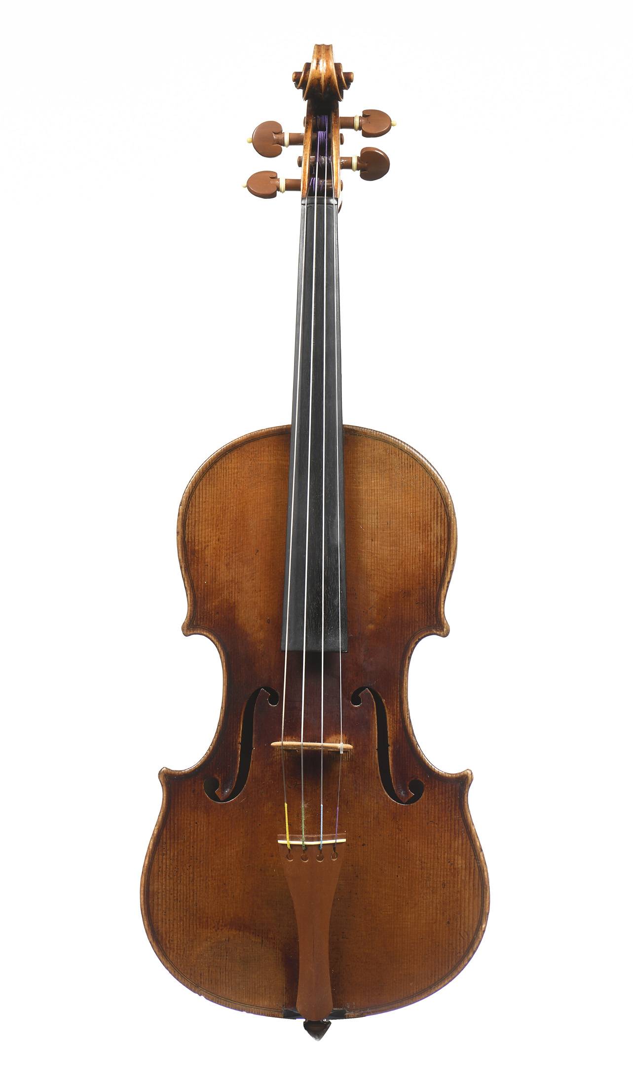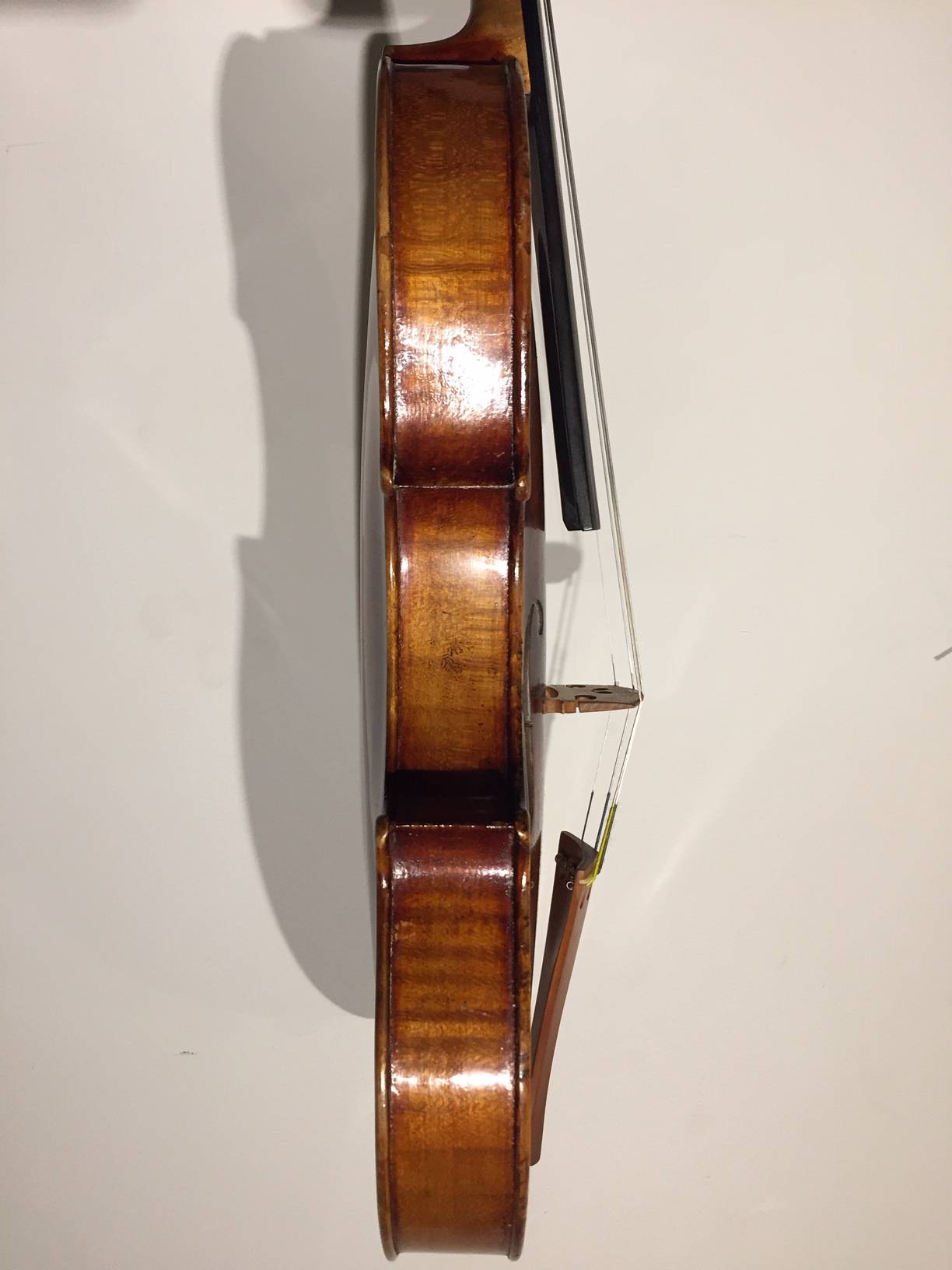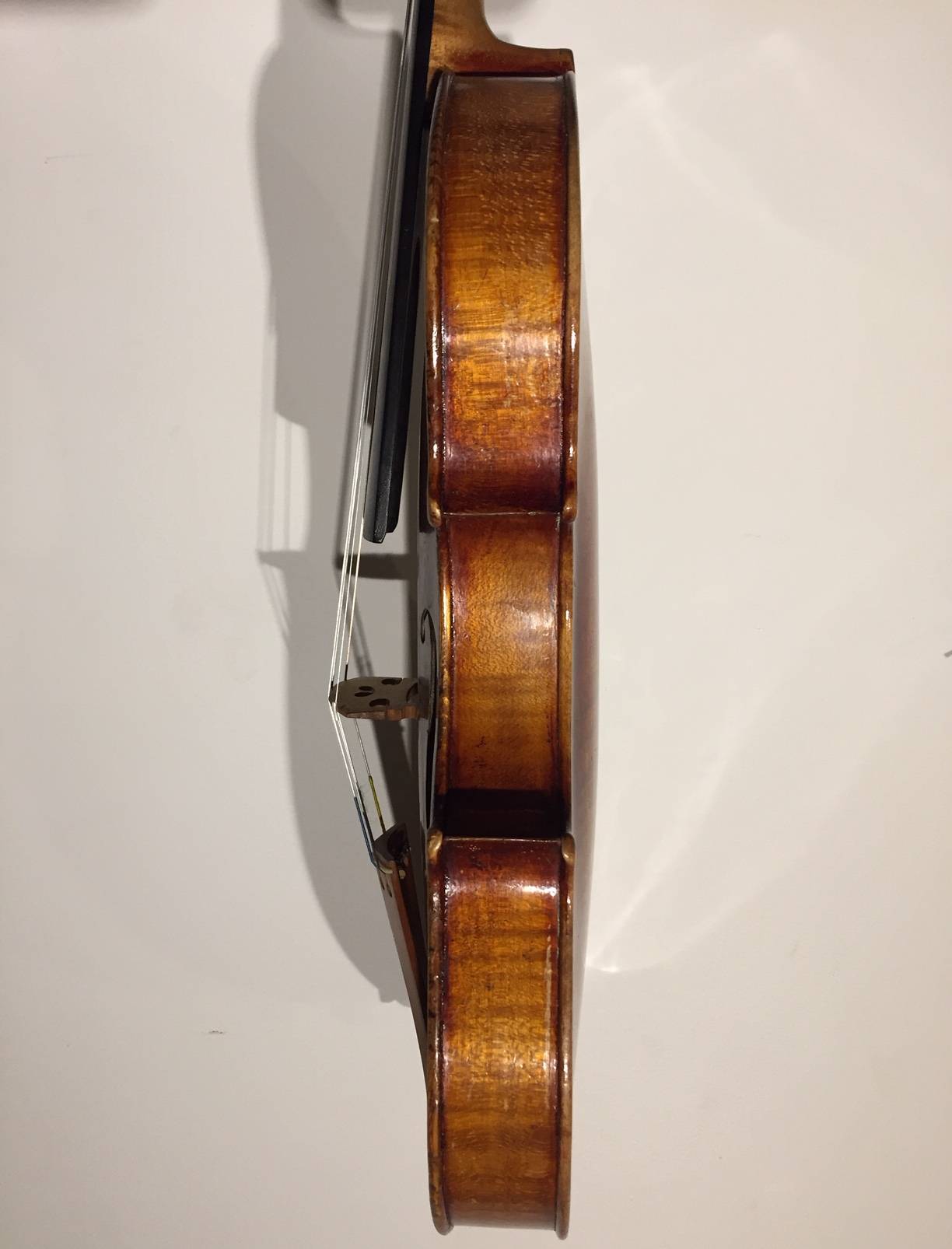 Fait en copie de Montagnana, portant une étiquette apocryphe "Dominicus Montagnana...". Fond d'une pièce en érable aux ondes légères et régulières. Table en épicéa aux pores serrés au centre, s'élargissant sur les bords. Vernis brun rouge sur fond doré. 357 mm. Avec boite moderne.