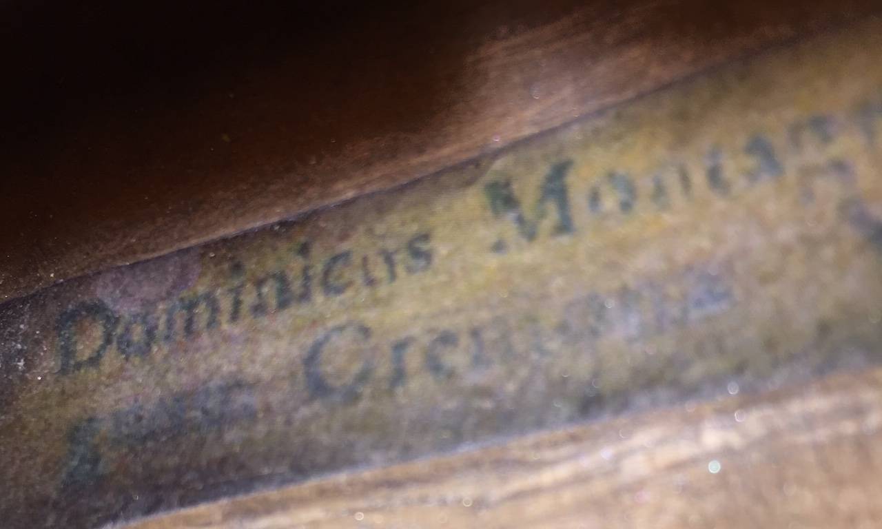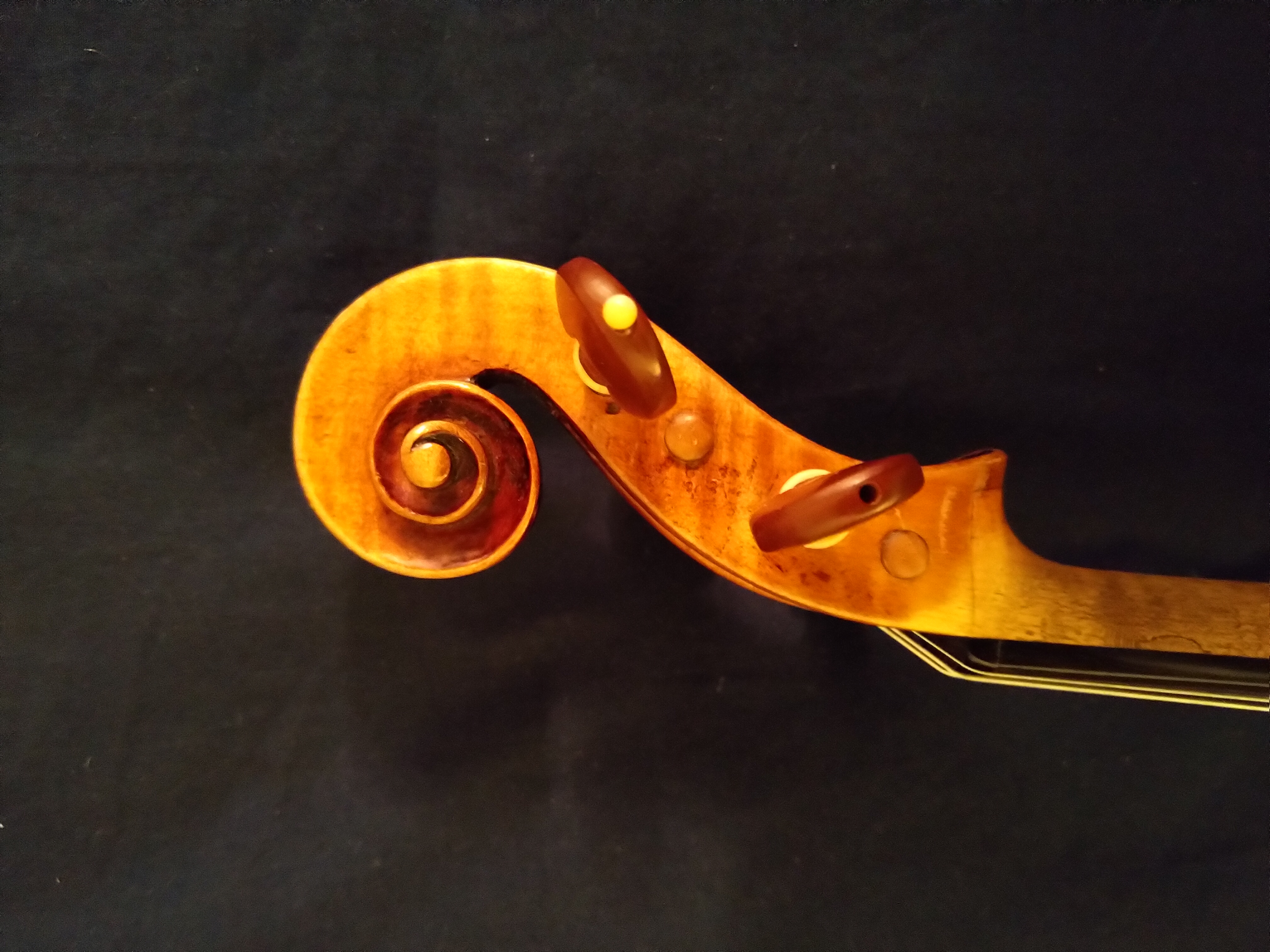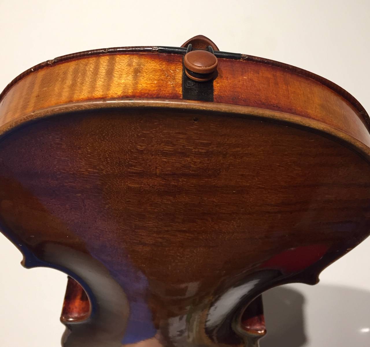 Fait en copie de Montagnana, portant une étiquette apocryphe "Dominicus Montagnana...". Fond d'une pièce en érable aux ondes légères et régulières. Table en épicéa aux pores serrés au centre, s'élargissant sur les bords. Vernis brun rouge sur fond doré. 357 mm. Avec boite moderne.