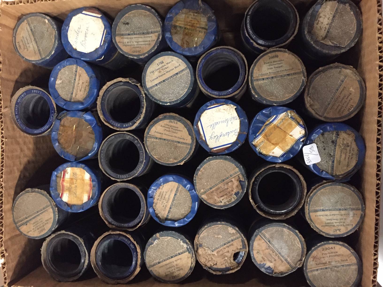 60 cylindres en cire dont Edison Blue Amberol. Columbia. Pathé. Répertoire de Bergeret. Maréchal. Polka. Marche avec xylophone. Strauss. Musique militaire.