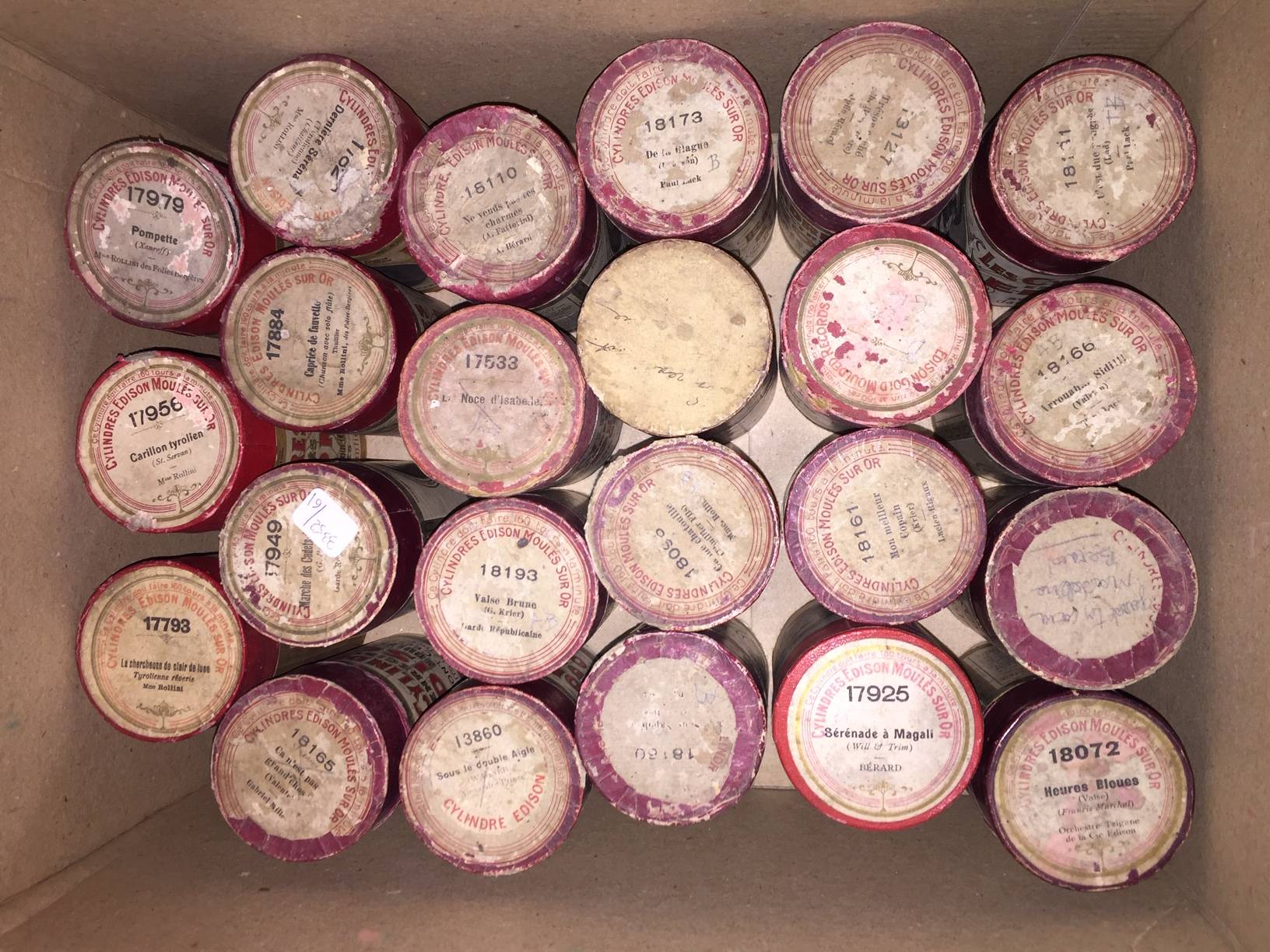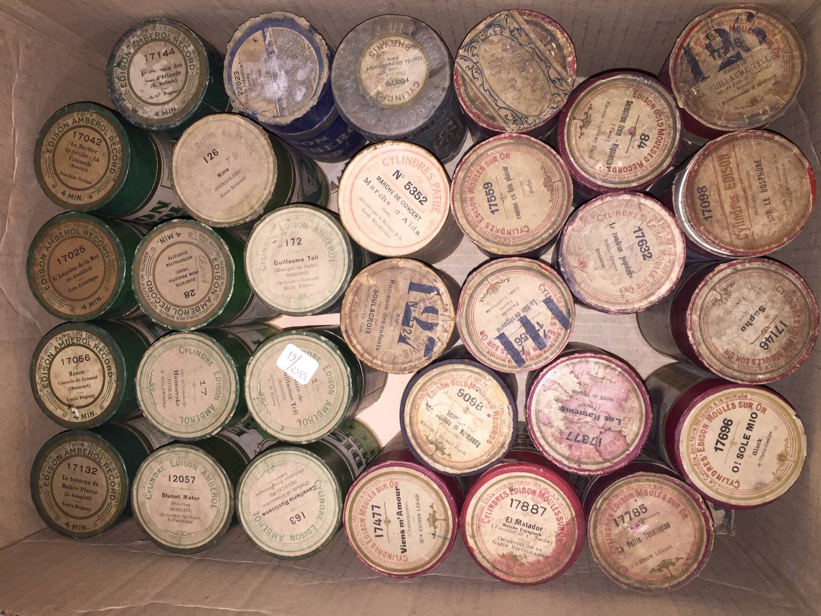 53 cylindres en cire. Edison Amberol dont Guillaume Tell de Rossini. Barbier de seville. Manon de Massenet. Marche d'Aida. Tyroliennes. Orchestre Tzigane.
