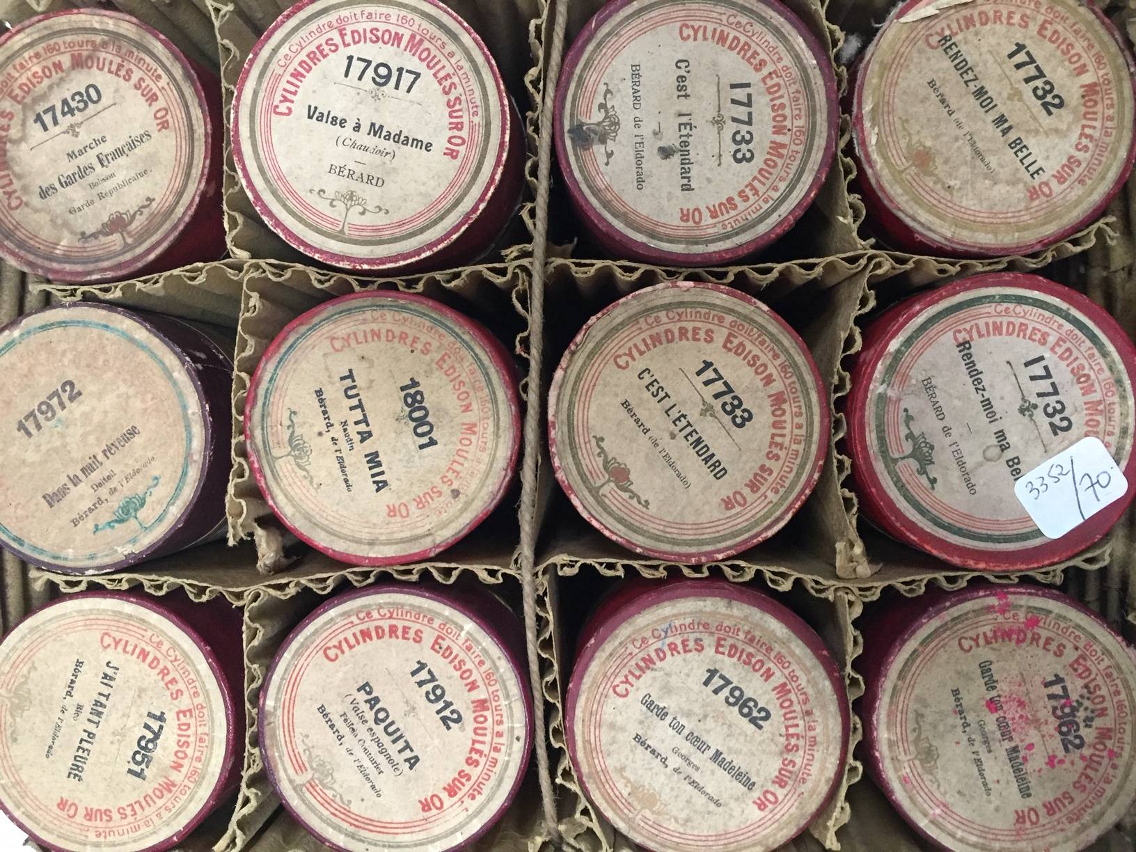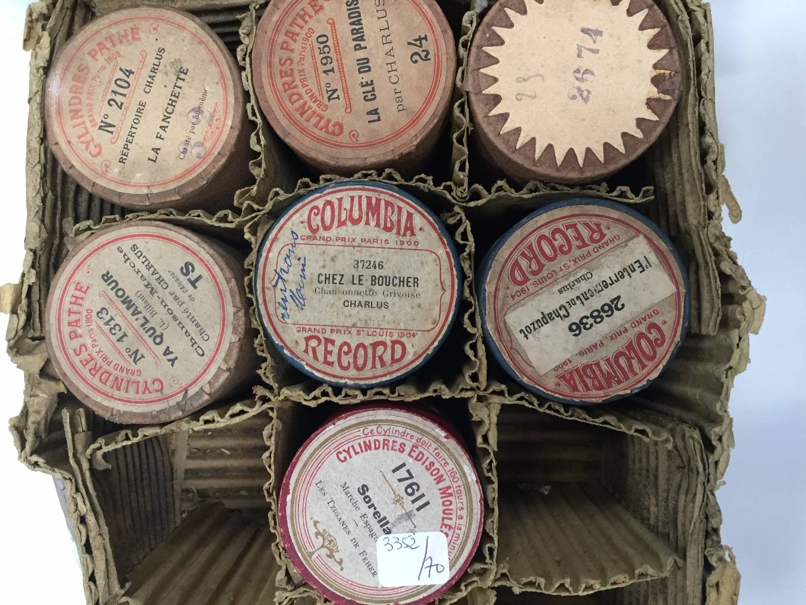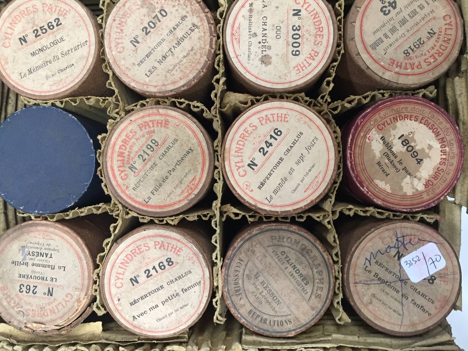 31 cylindres en cire de marques PATHE – COLUMBIA, avec le répertoire de CHARLUS et divers.