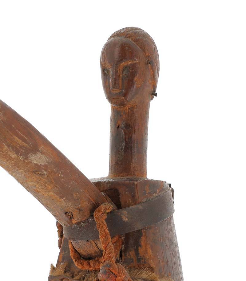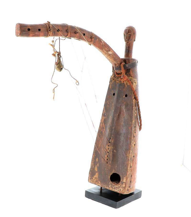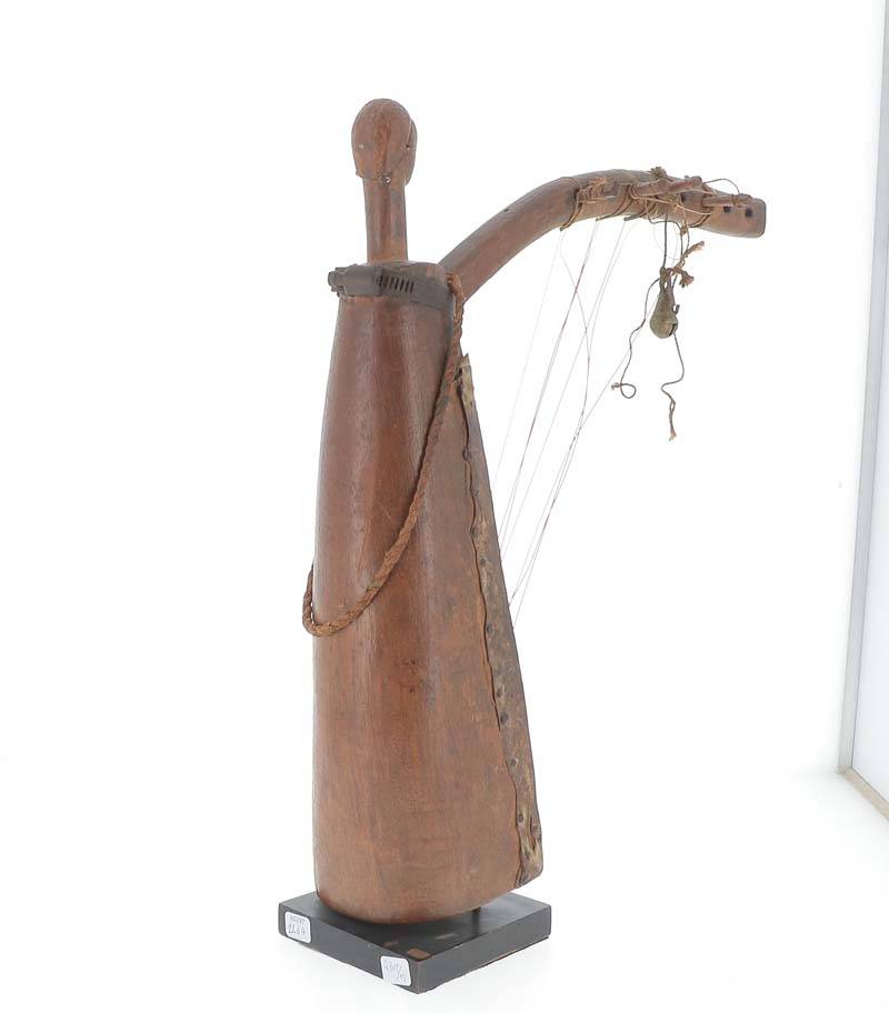 harpe de cérémonie utilisée par les griots pour annoncer la venue du roi et conter l’histoire de sa lignée, elle présente une tête ancestrale à l’expression enjouée, le front bombé surmonté d’une coiffe stylisée