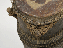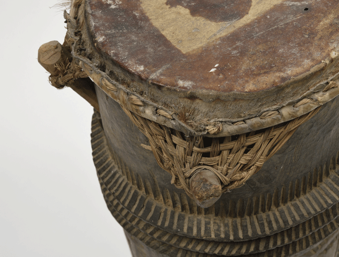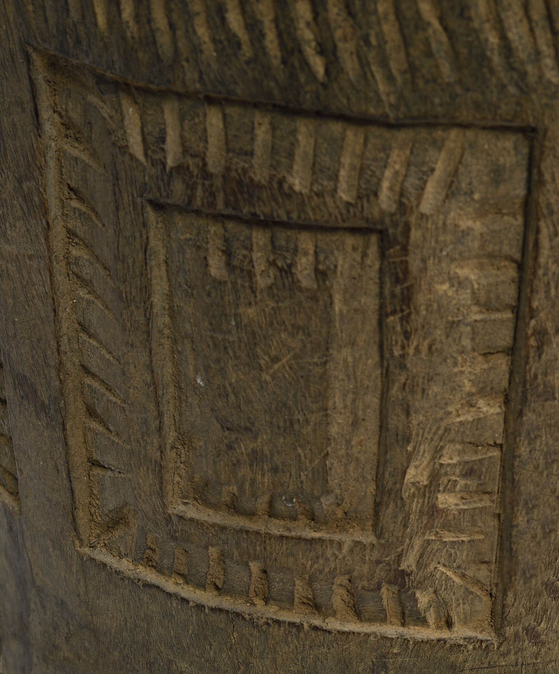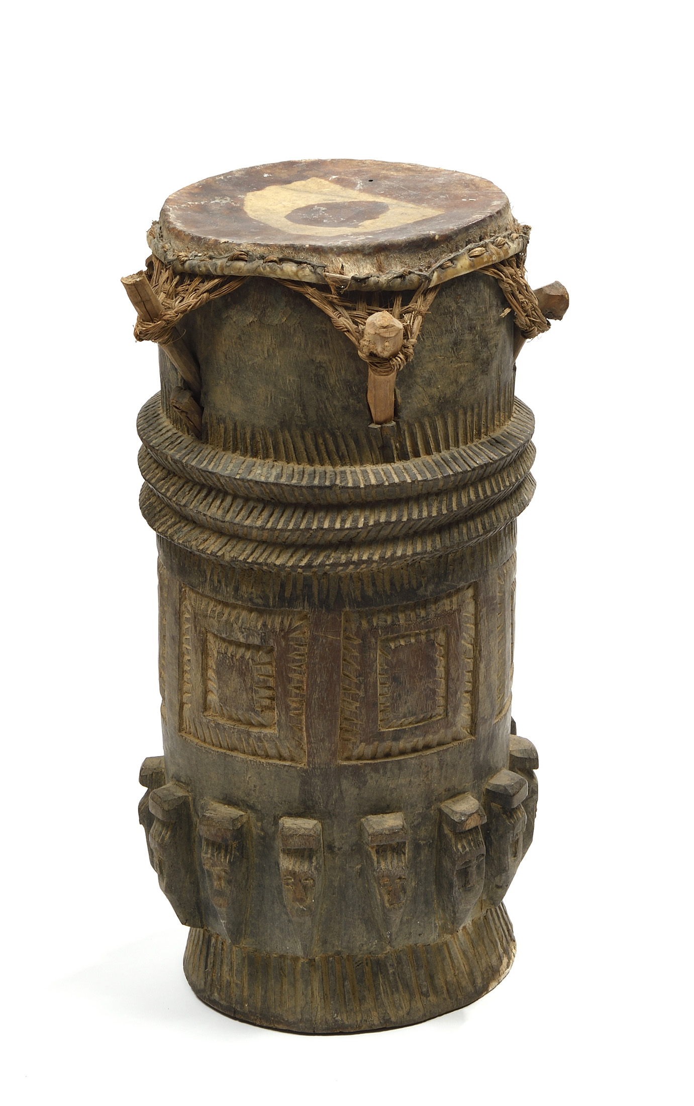 Tambour de cérémonie à décor de fenêtres de greniers à mil. Agrémenté sur le pourtour d'une ronde de tête ancestrale évoquant la cohésion du clan autour de la cérémonie. Bois, peau animale. Anciennes marques d'usage.