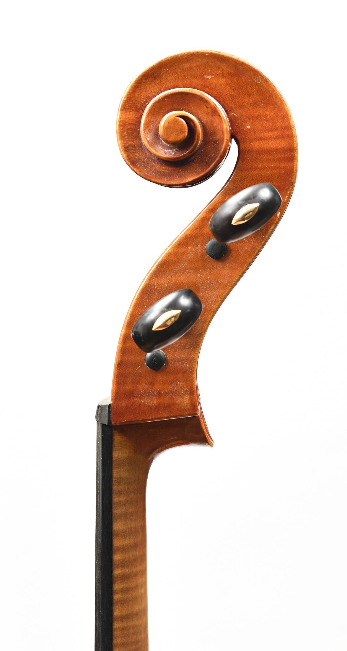Portant une étiquette "Primavera CAPELLINI. Cremona 1977. Modelo Stradivari". Fond de deux pièces en érable aux ondes horizontales irrégulières. Table en épicéa aux pores irréguliers plutôt larges sur les bords. Petites cassures au sillet du bas. Vernis orangé brun sur fond doré. 760 mm.