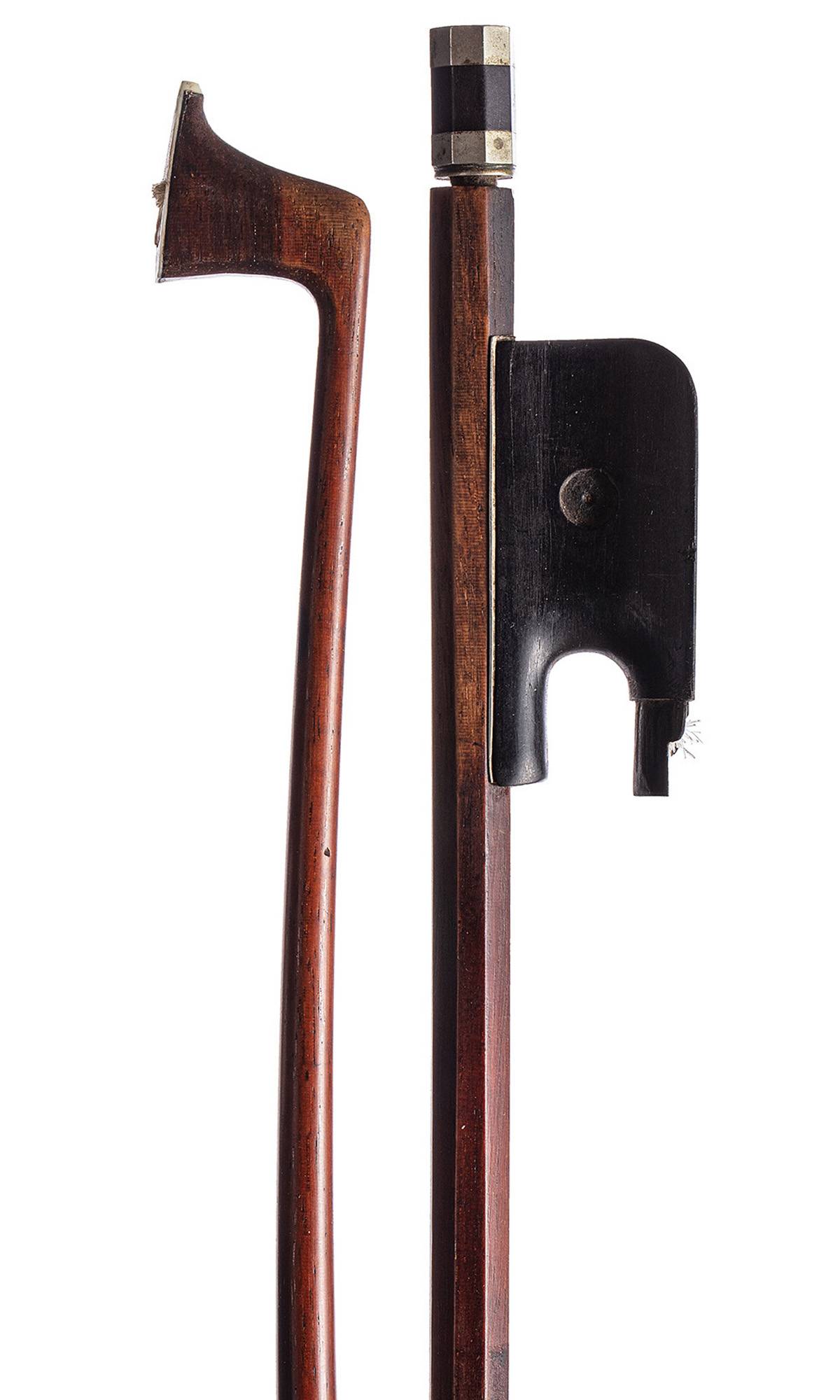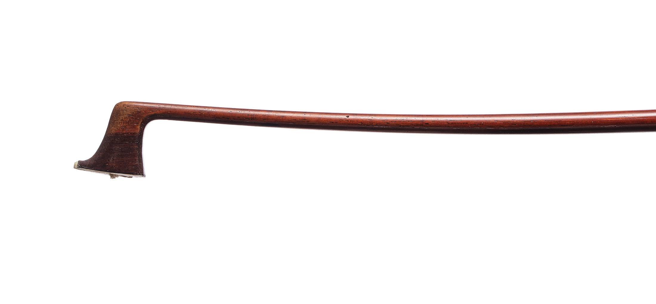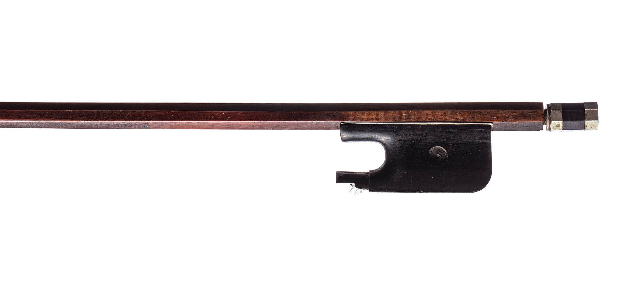 Archet Français fait au XIXe. Baguette ronde en bois exotique. Hausse ébène montée maillechort, d'un autre auteur. Passant manquant. 726 mm. 60 g sans mèche, sans garniture, sans passant.