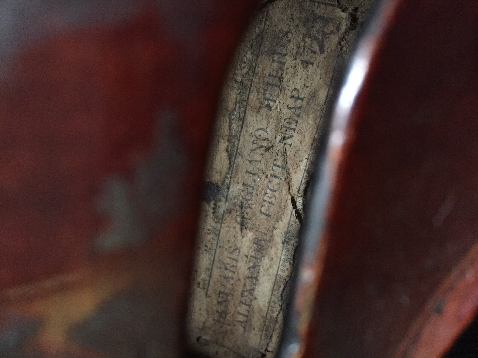 portant une étiquette "Anuaris Gagliano Filius Alexandr fecit Neap...?". Fond de deux pièces en érable. Vernis rouge sur fond doré. 357 mm.