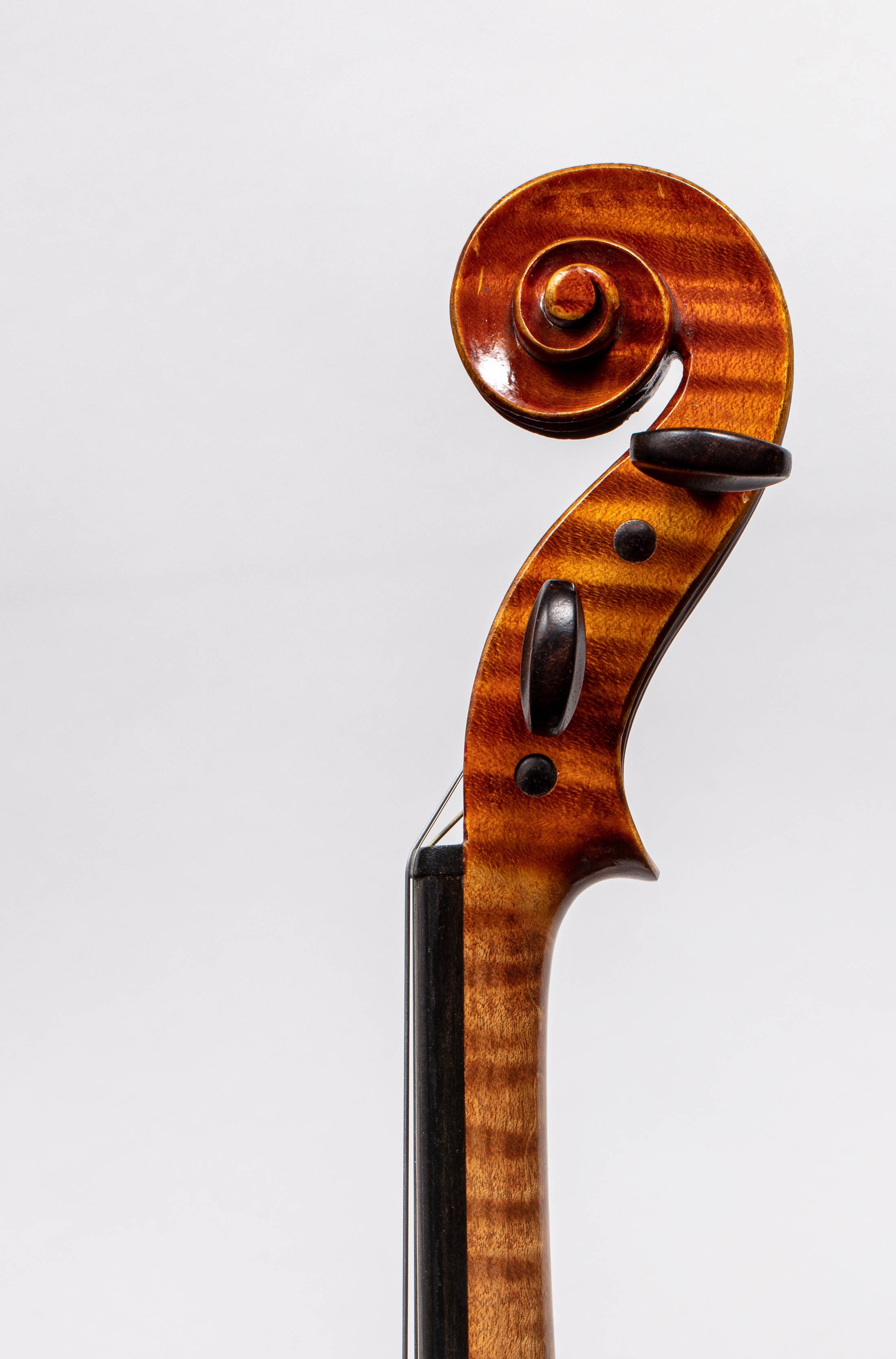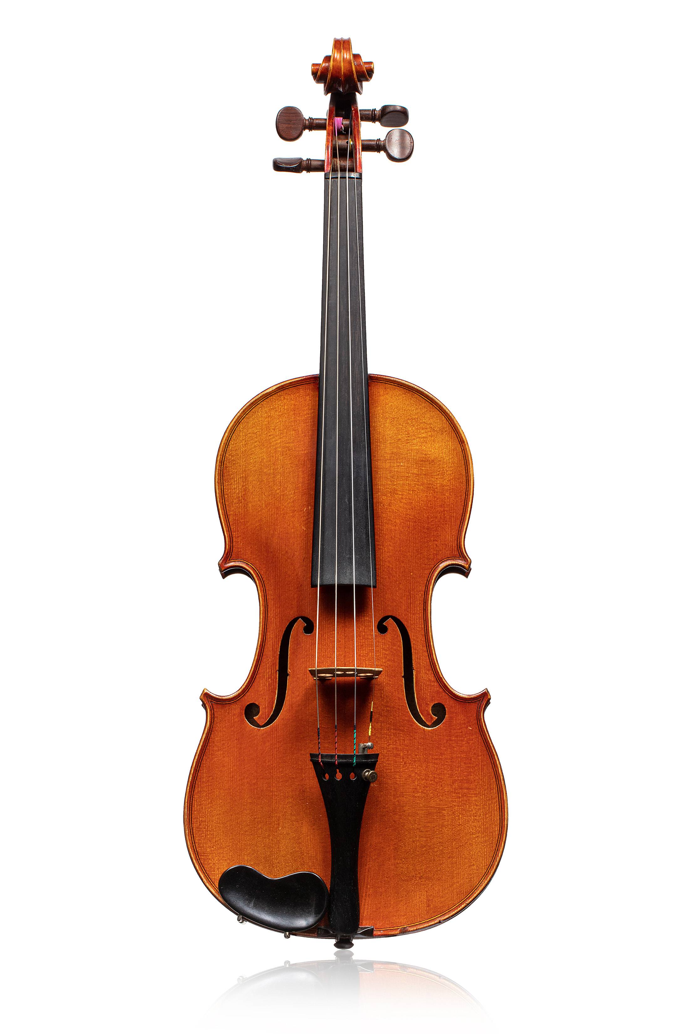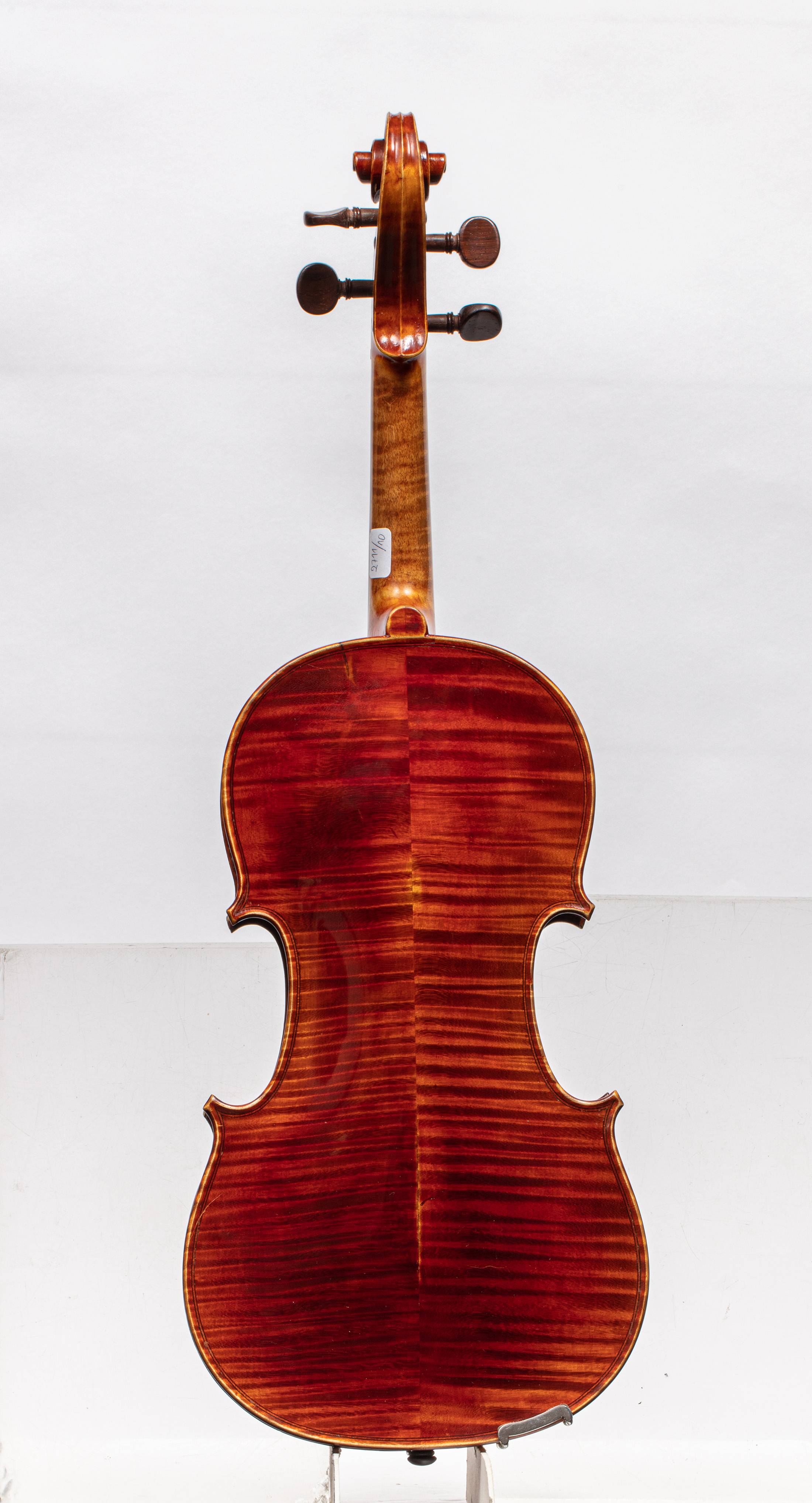 dont il porte l'étiquette "Instrument d'artiste. Jacques LECLERC...". Fond de deux pièces en bel érable. Table en épicéa. Vernis brun rouge sur fond doré. 360 mm.