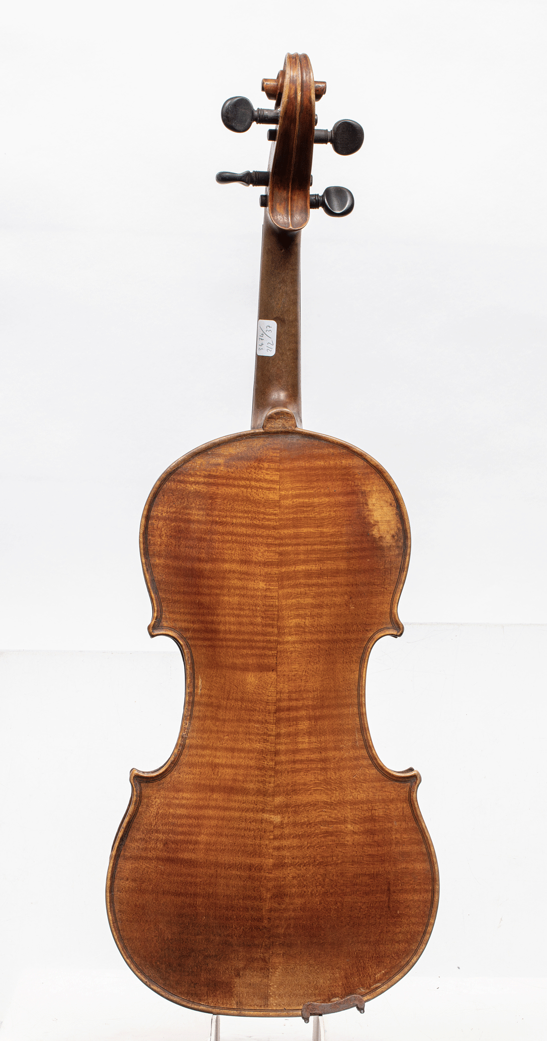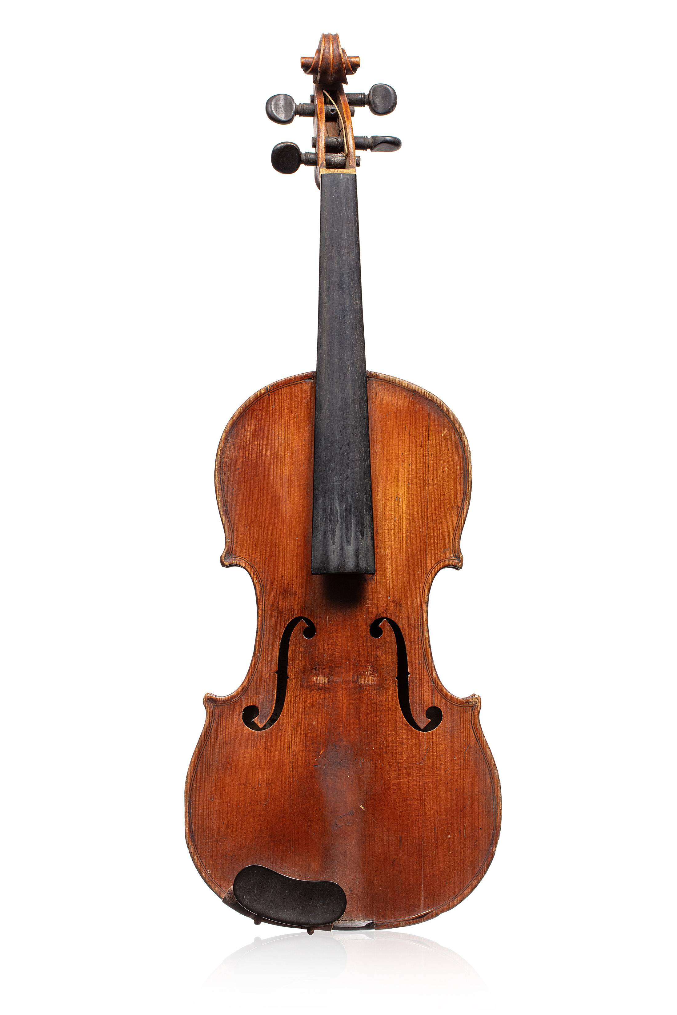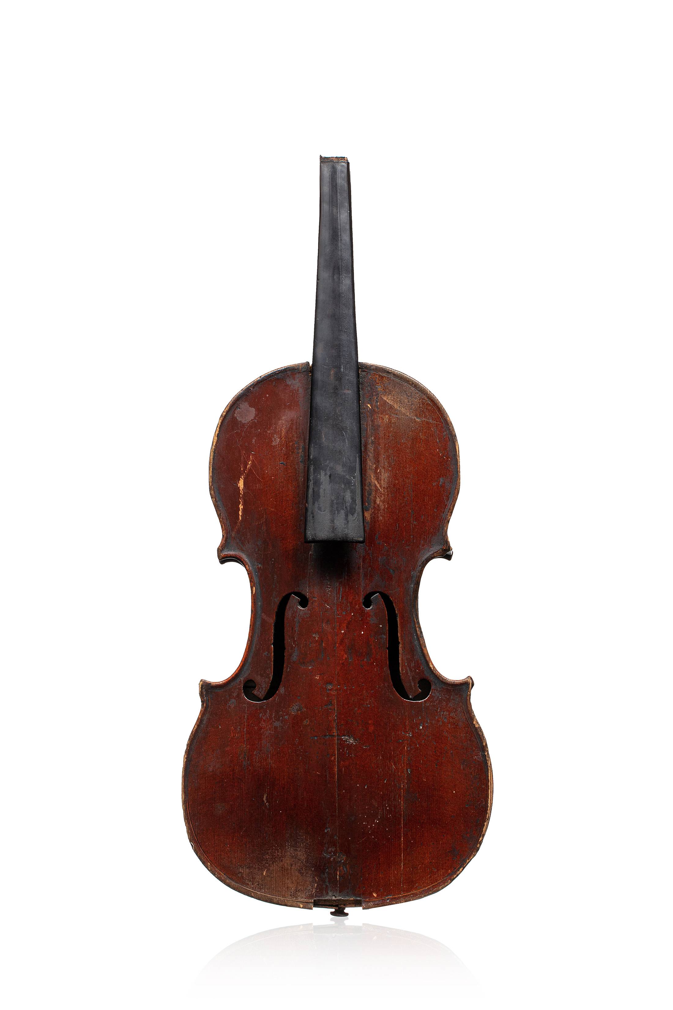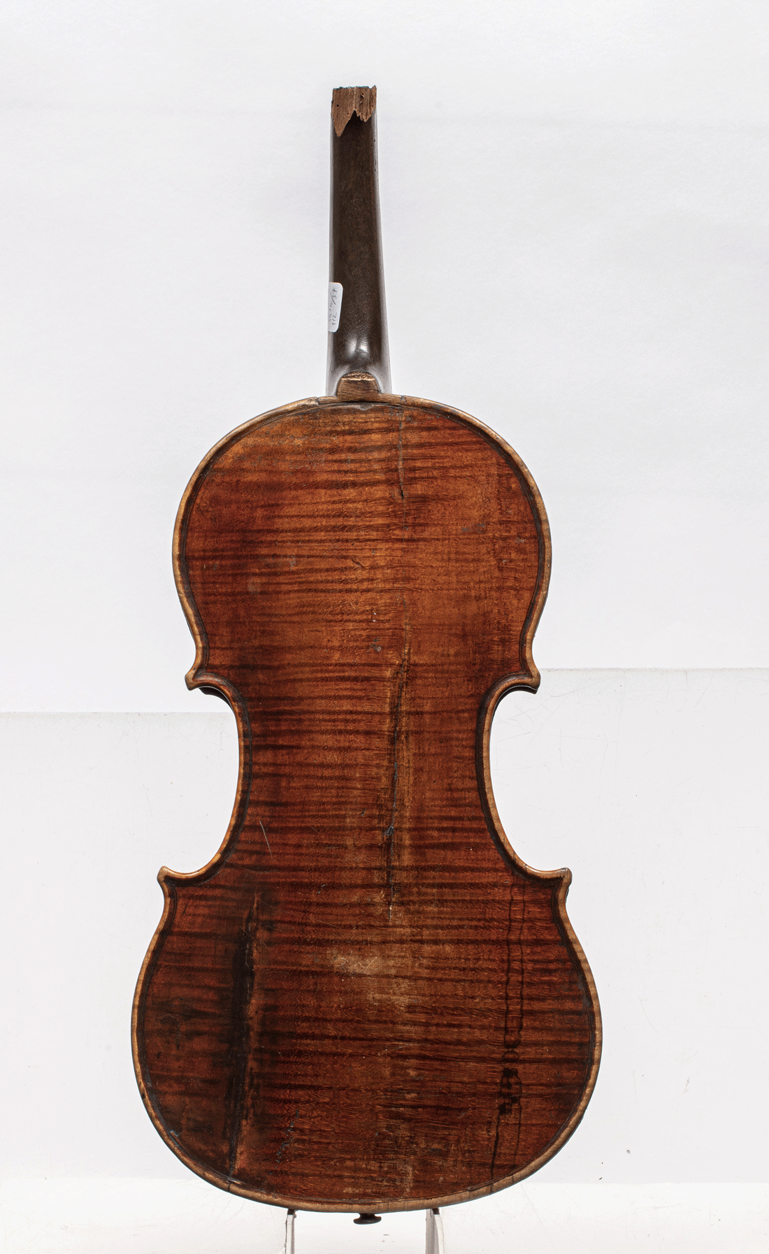 - Un violon portant une étiquette apocryphe "Nicolaus Gagliano..." Fond de deux pièces. Table épicéa. Diverses cassures. Vernis brun doré.