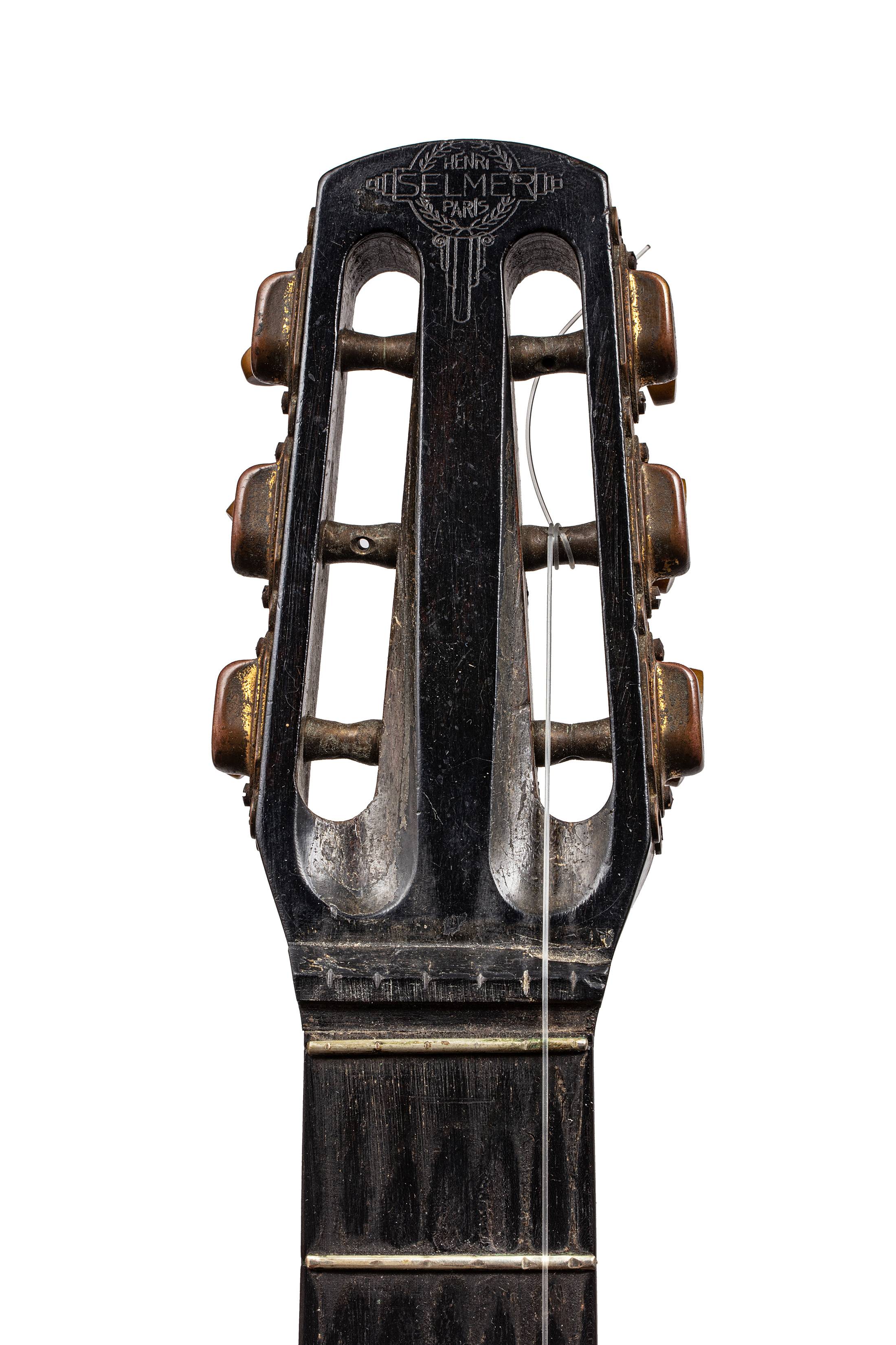 Portant marque au fer à la tête, étiquette " SELMER. Fabriqué en France SELMER PARIS. N°459" fait par MACCAFERRI. Bouche ovale. Fond et éclisses en palissandre. Table en épicéa. Diverses cassures et usures à la table. Manche en noyer. Avec boite d'origine. Cordier, chevalet et mécaniques SELMER d'origine.