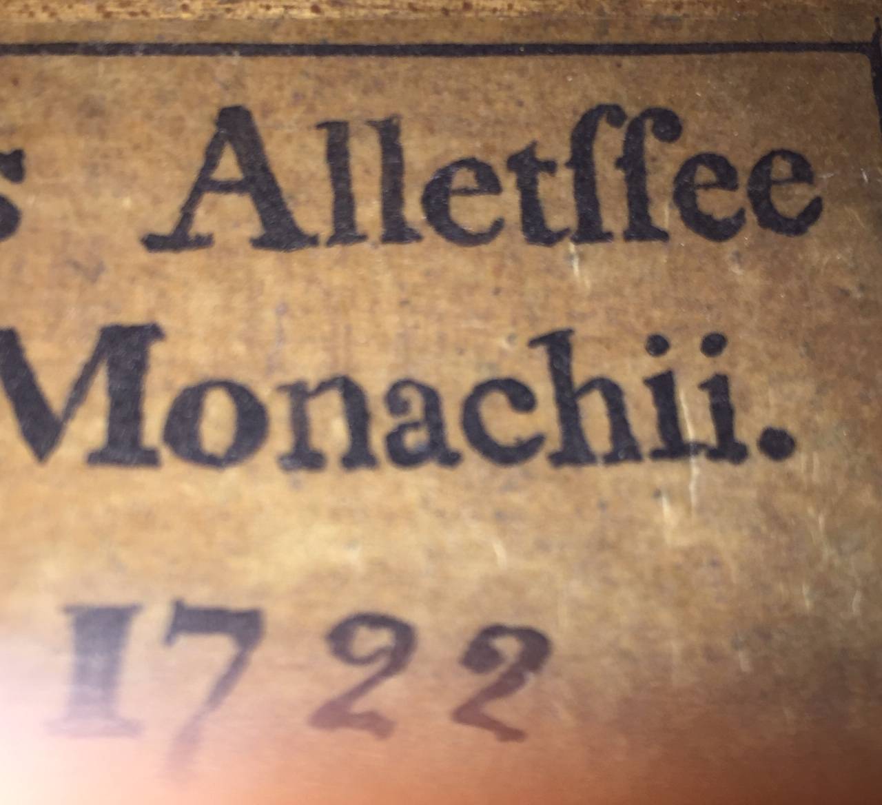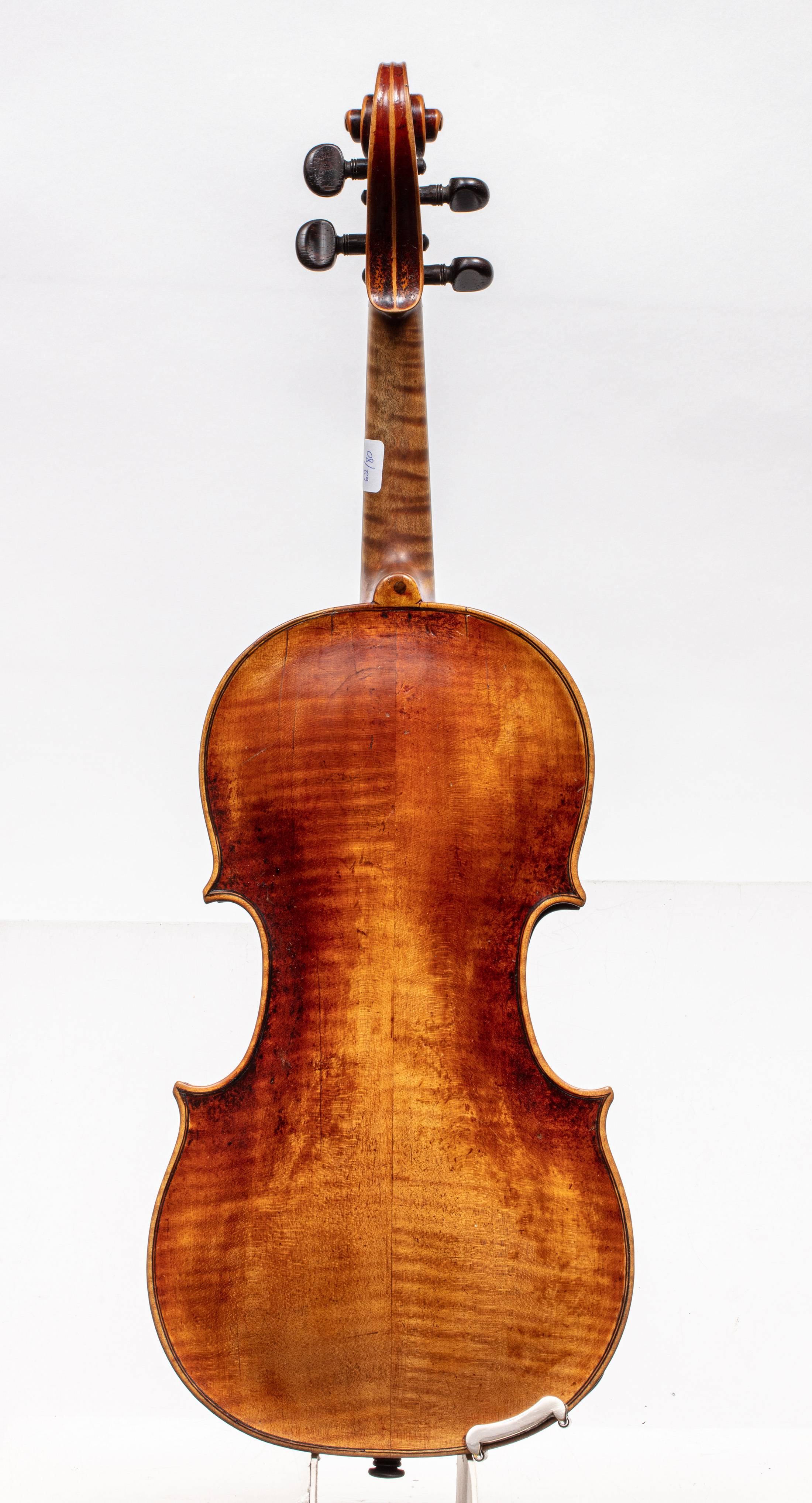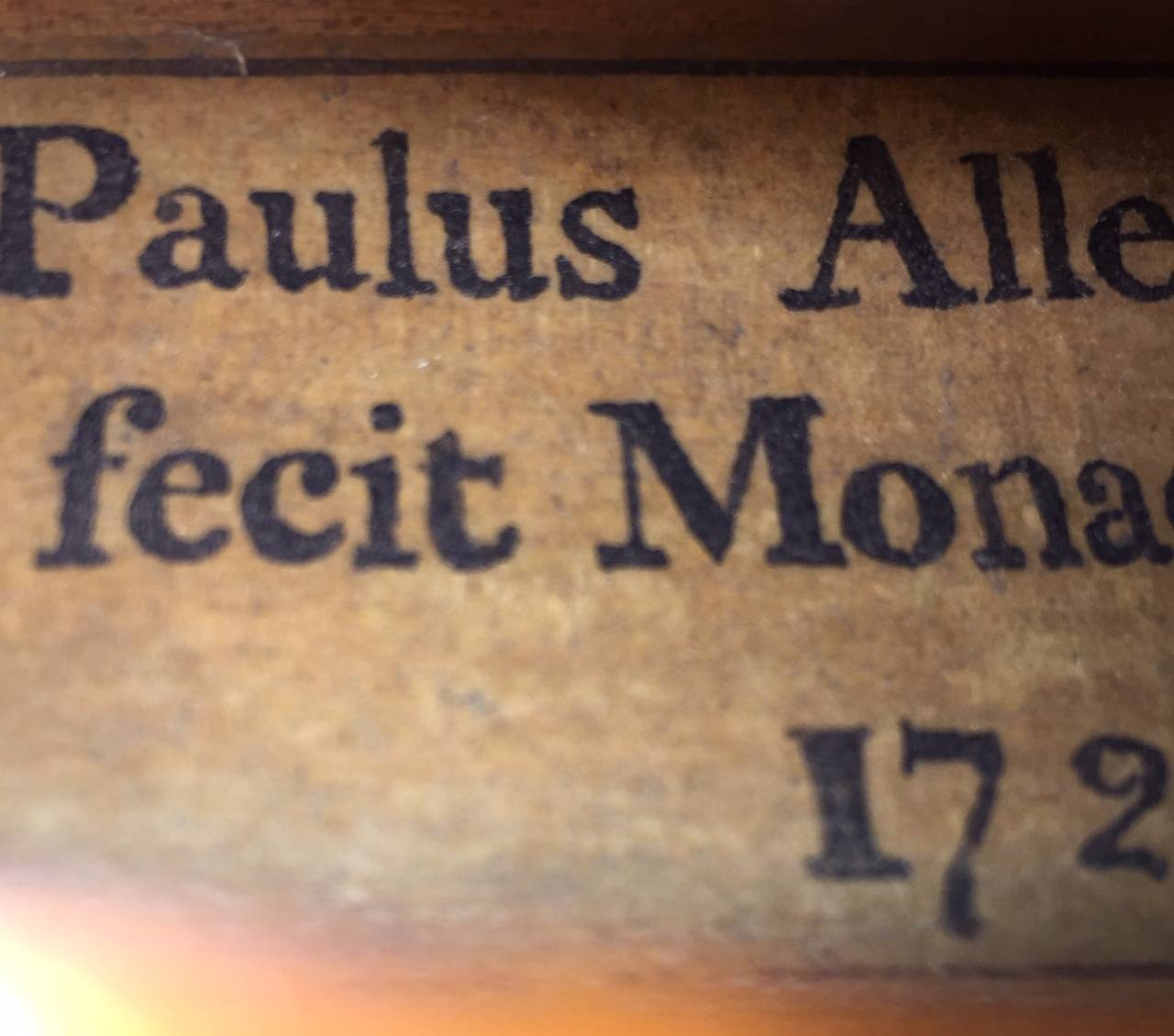 dont il porte l'étiquette "Paulus ALLETSEE". Fait par Paul ALLETSEE, Luthier Bavarois XVII / XVIIIe. Fond de deux pièces en érable aux ondes légères. Table en épicéa aux pores serrés au cente. Diverses cassures restaurées dont une fracture d'âme au fond. 355 mm. Vernis brun doré.