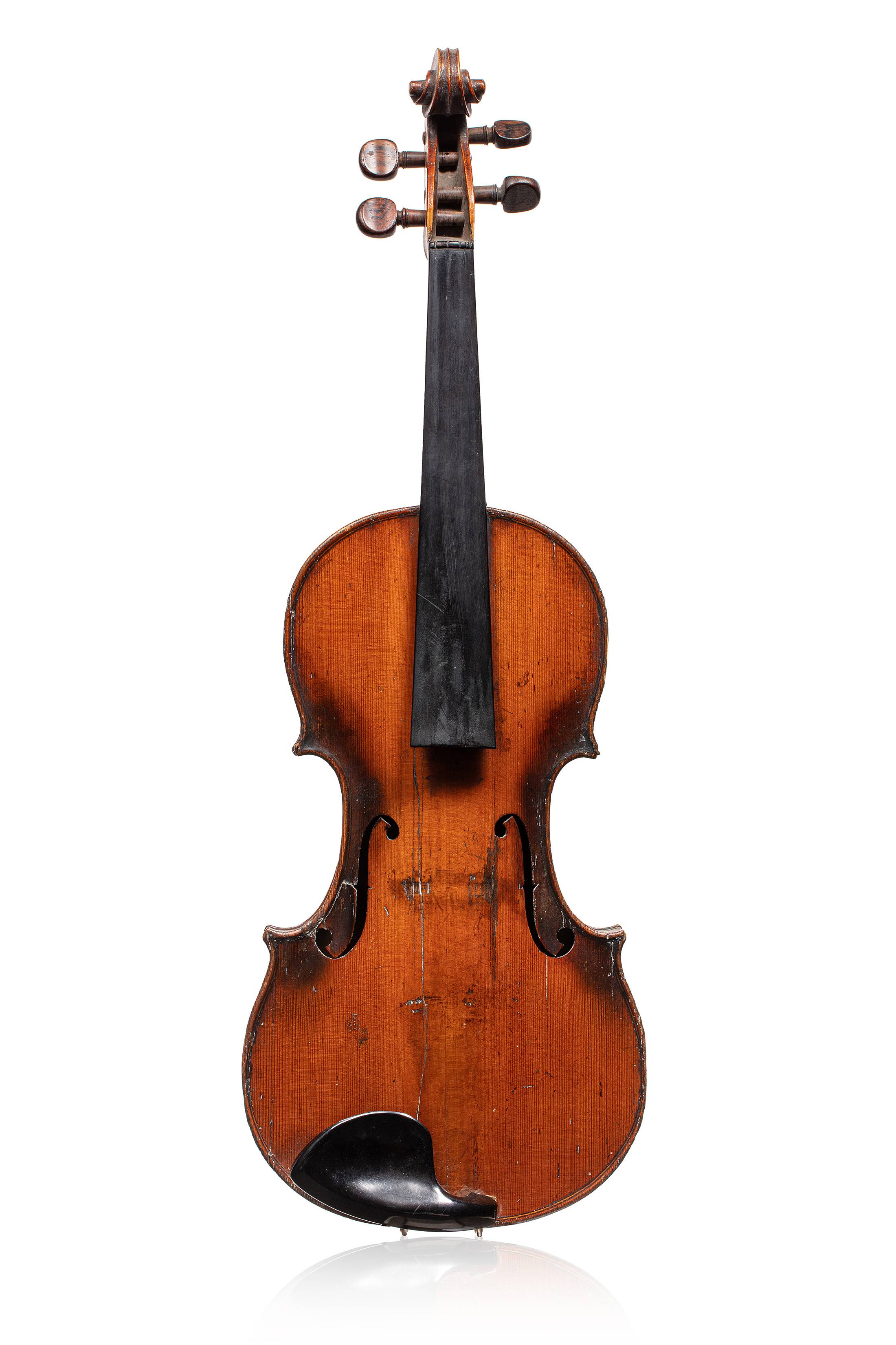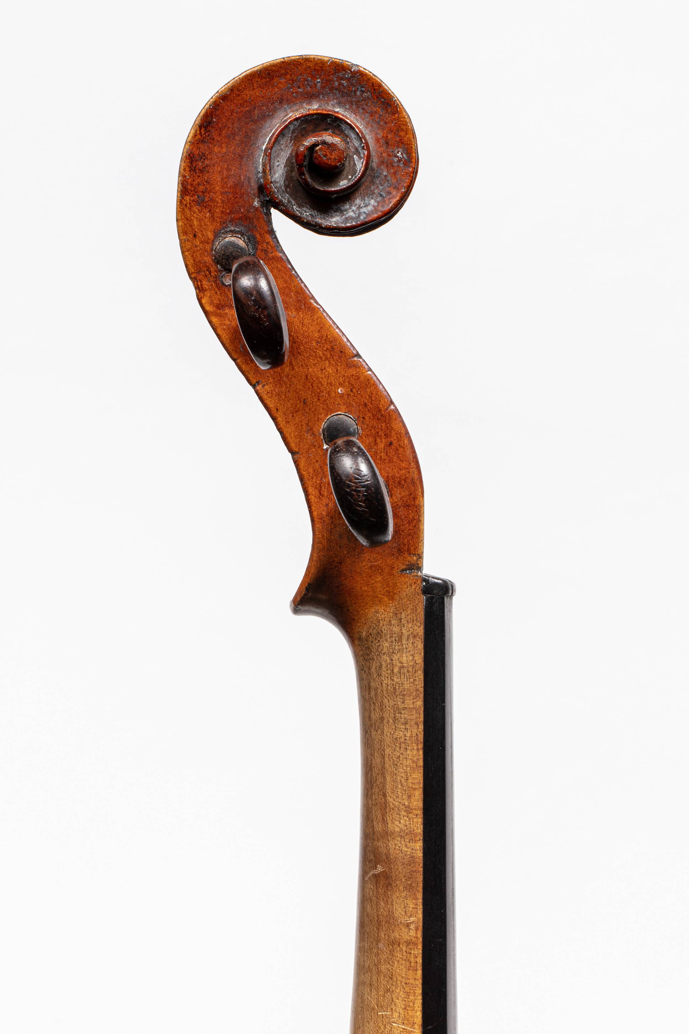 portant la marque au fer sous le talon du manche "N.CHAPPUY" . Fond de deux pièces en érable. Vernis brun orangé sur fond doré. 360 mm. Diverses cassures. Montage baroque d'origine.