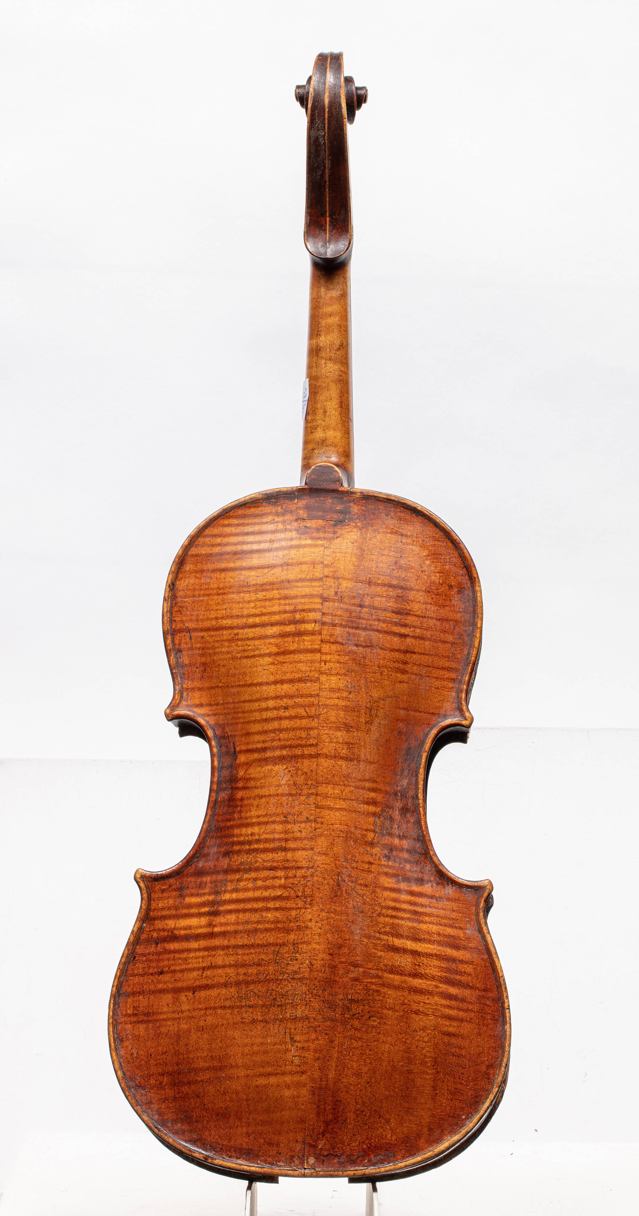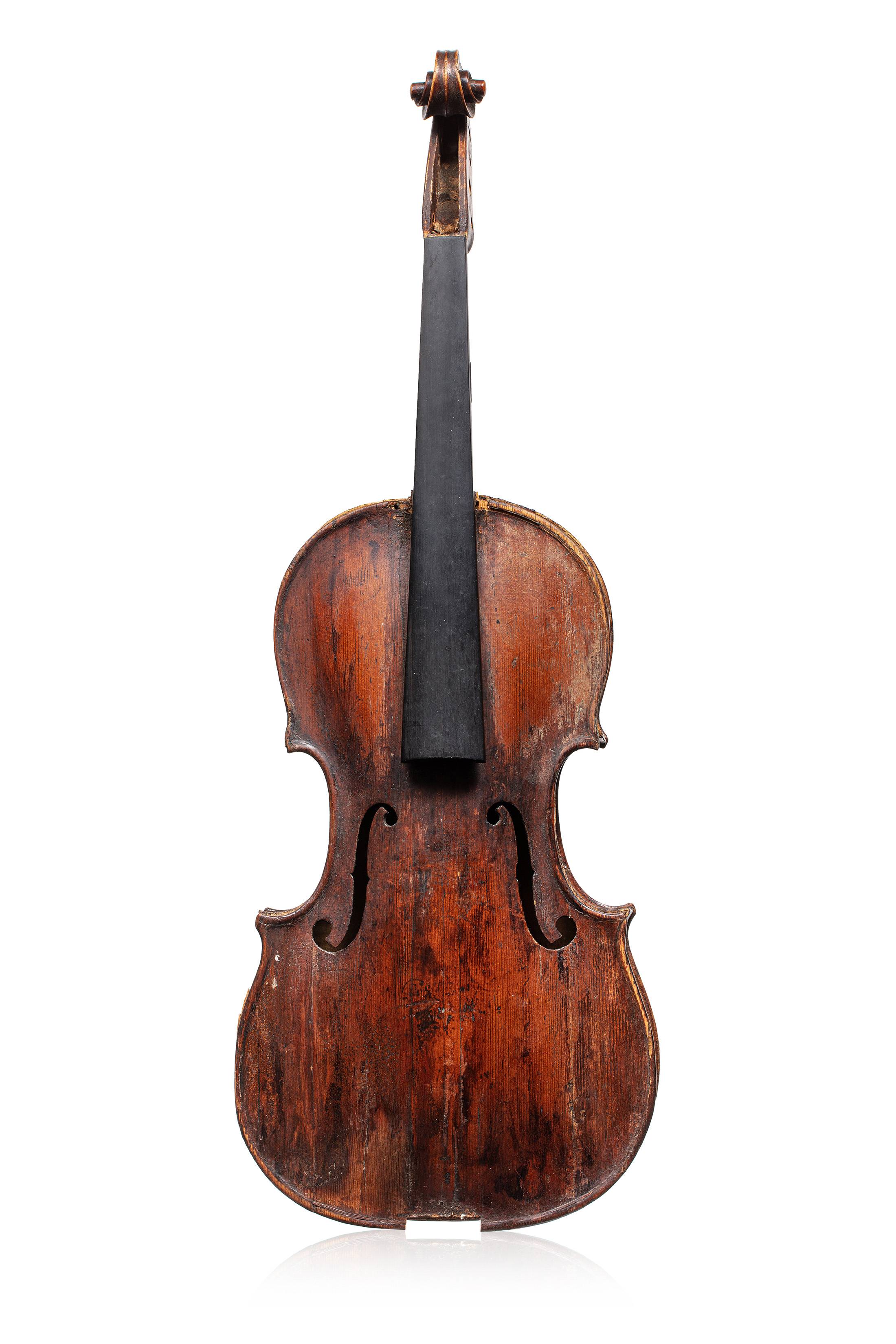 portant diverses signatures de réparations. Fond de deux pièces en érable. Table en épicéa. Vernis brun sur fond doré.