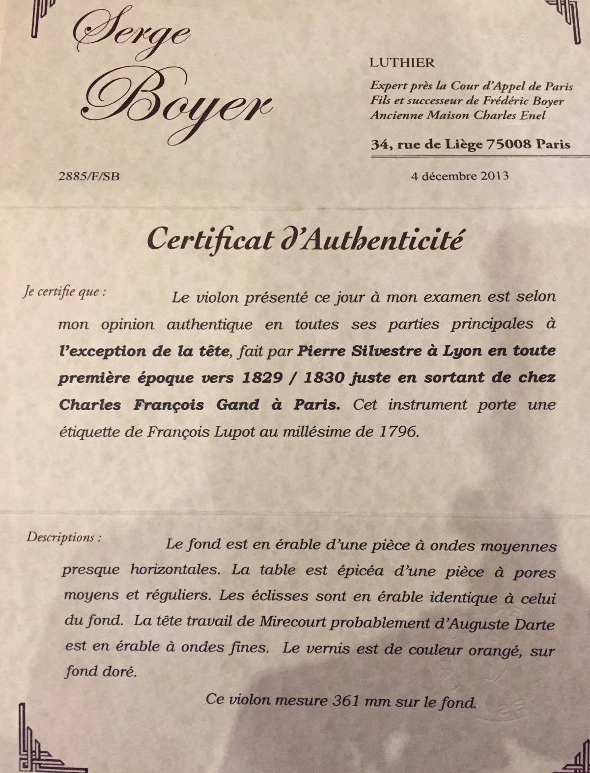 French violin by Pierre SILVESTRE bearing the label " Francisco LUPOT fecit in Orleano 1796.". Serge BOYER certificate.