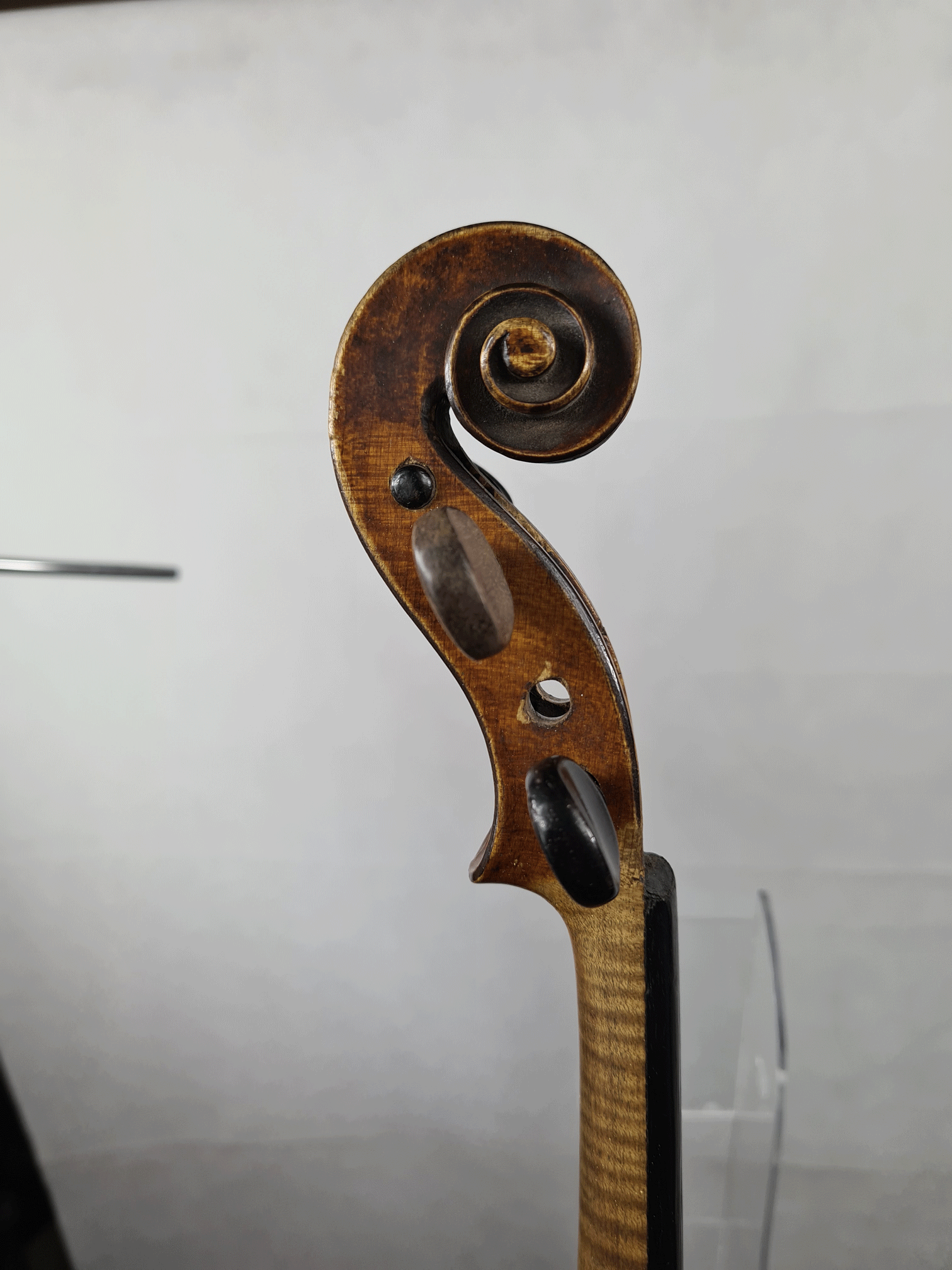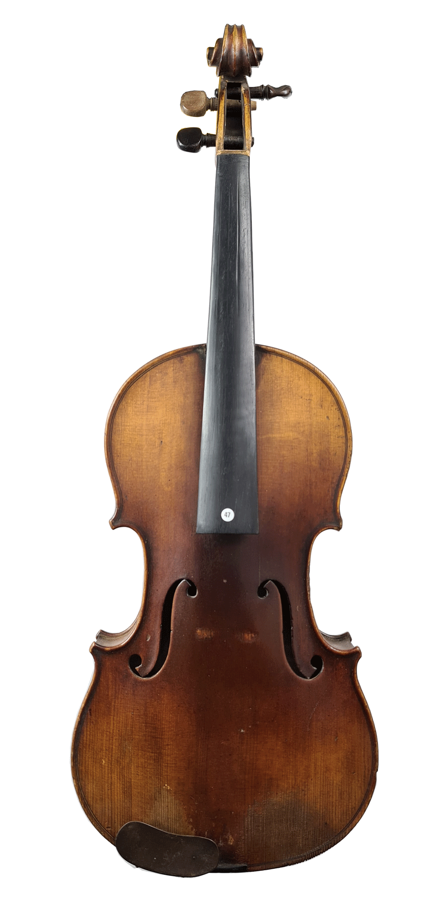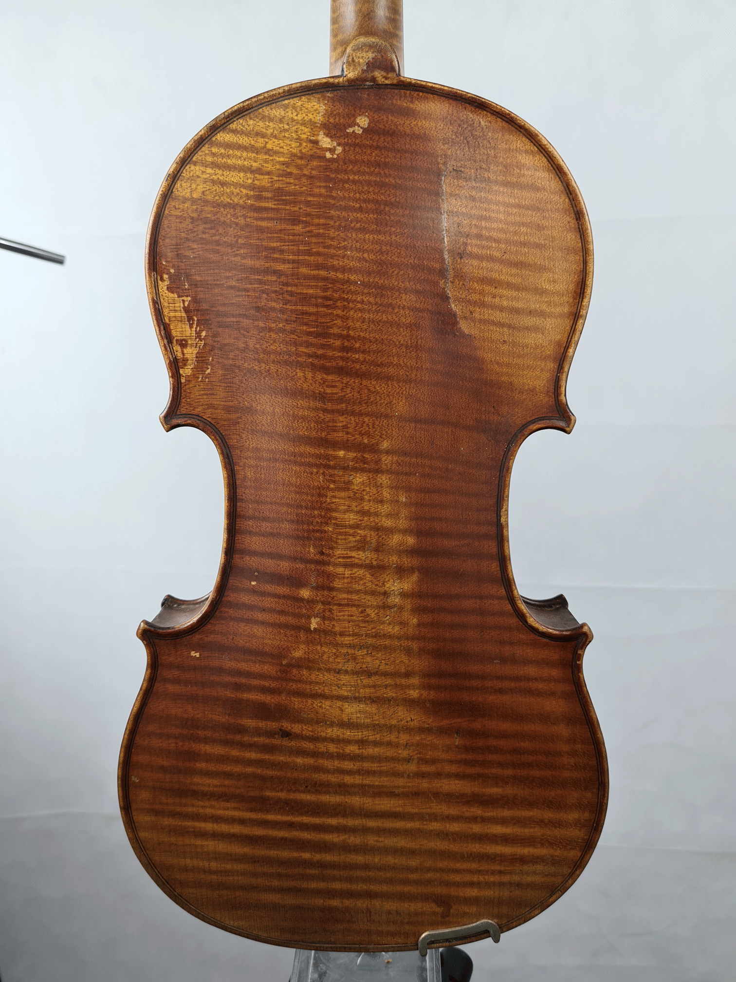 fait par Jules GRANDJON. Portant une étiquette "Antonius Stradivarius... 1786." et une signature manuscrite sur le fond 'Jules Grandjon. Mirecourt". Fond d'une pièce en érable. Vernis brun rouge sur fond doré. 361 mm. Diverses cassures.