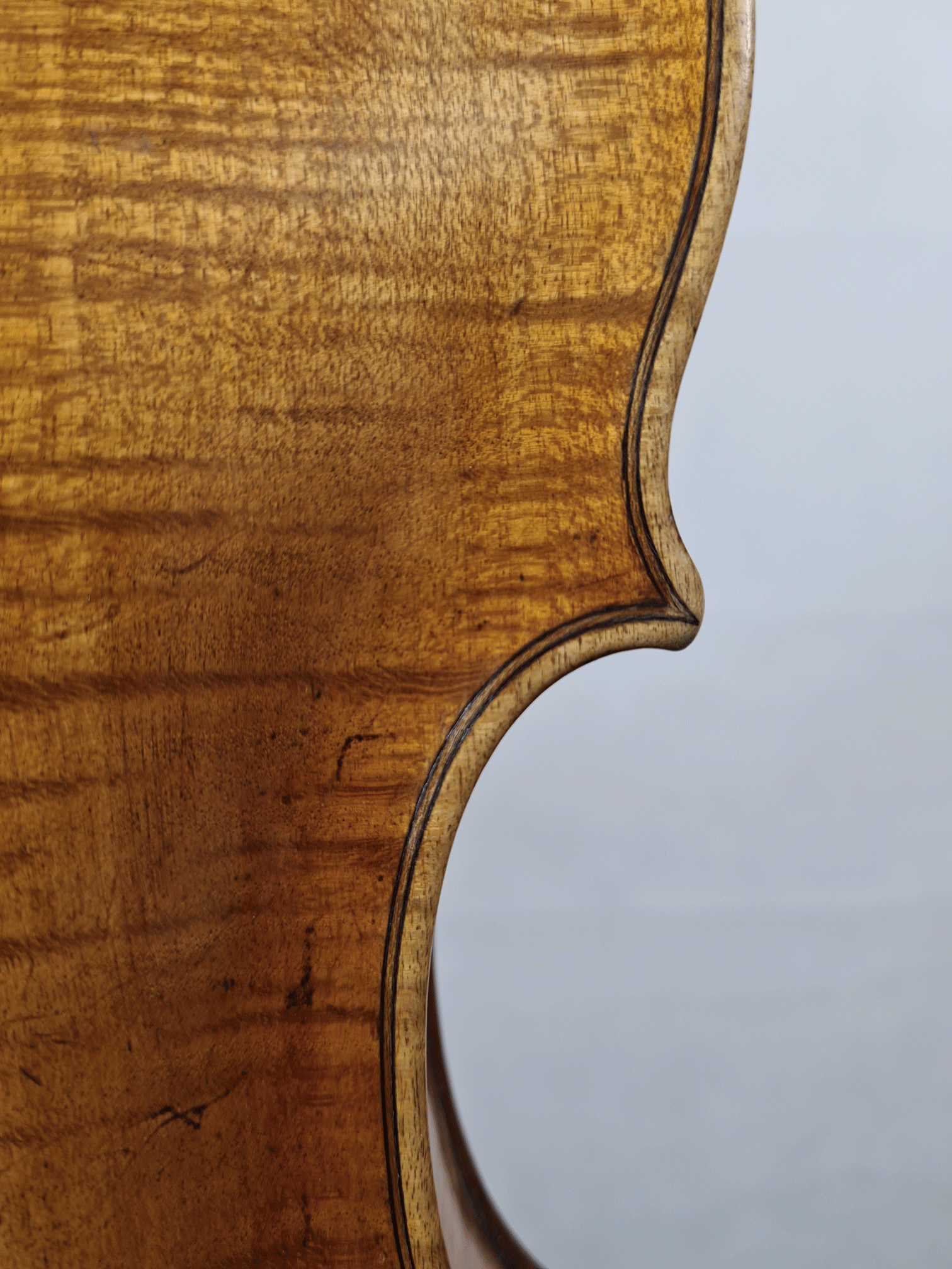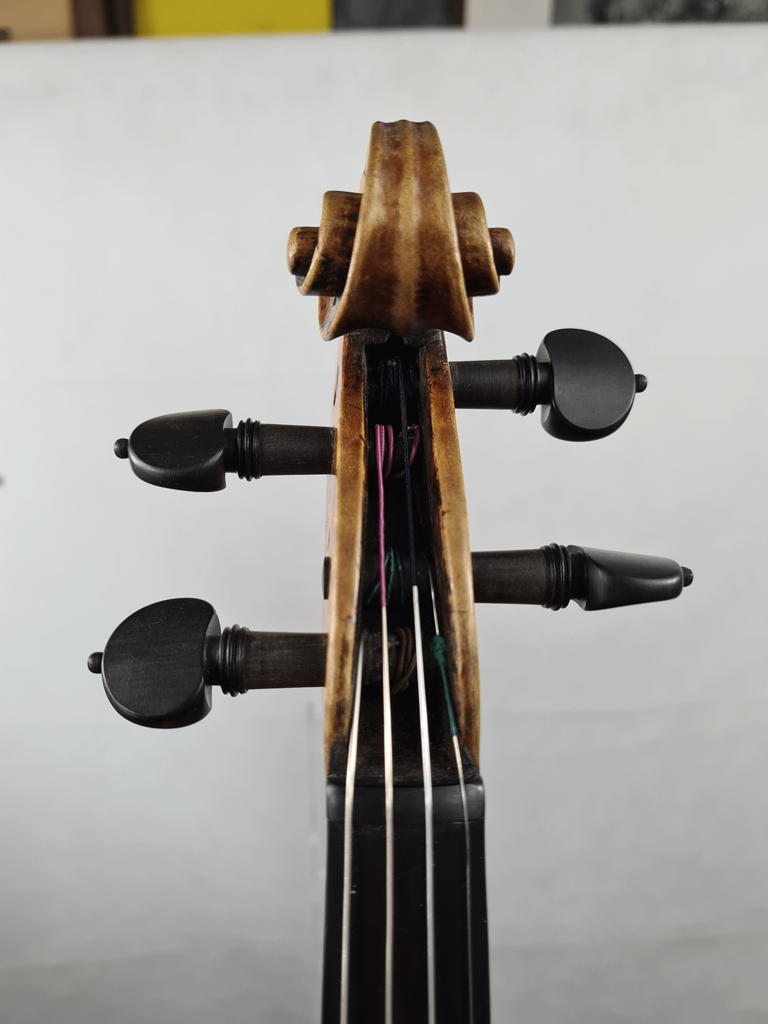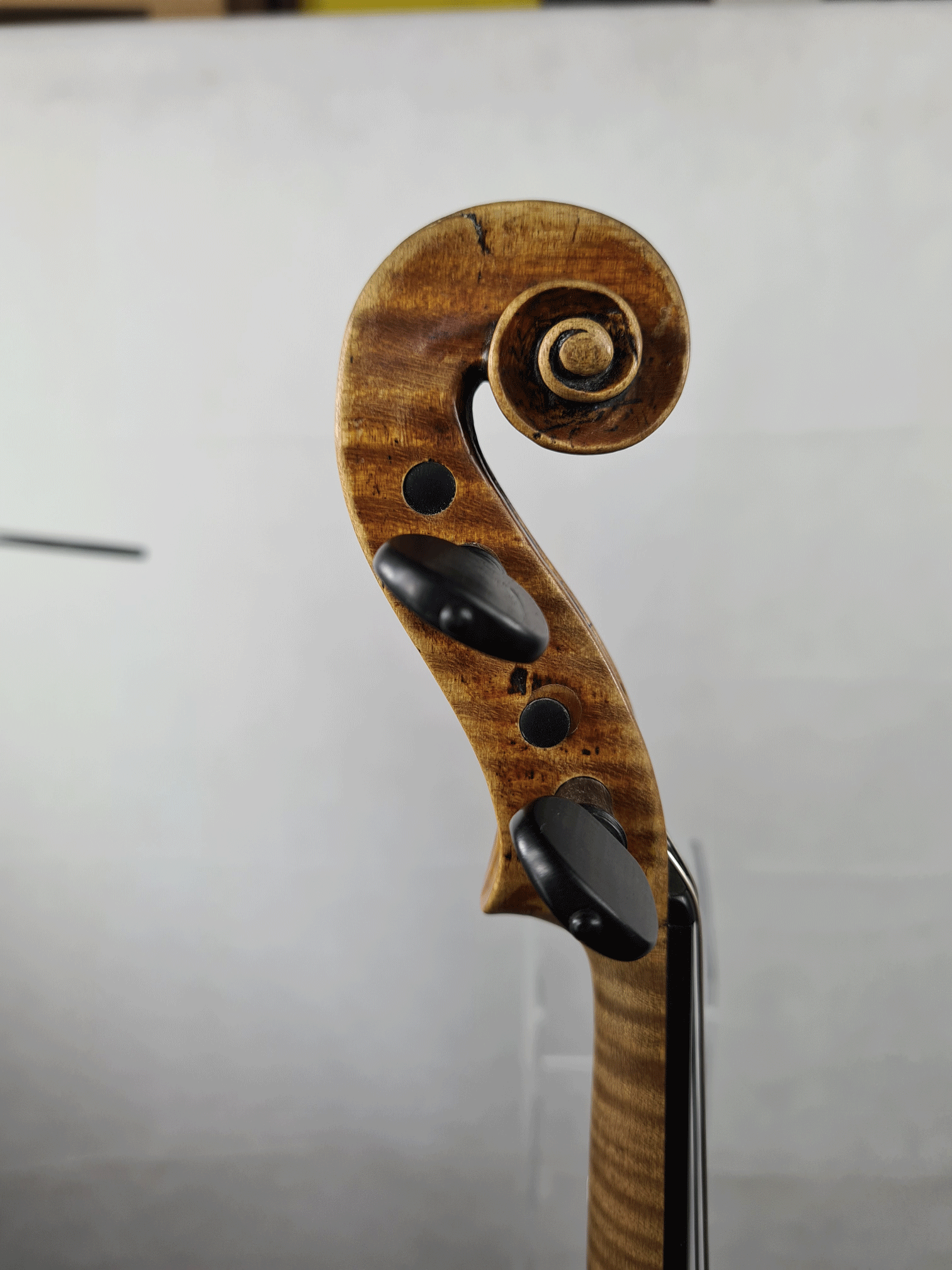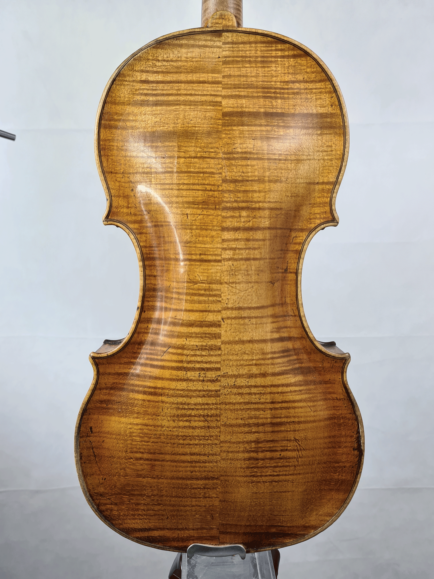 Intéressant violon sans marque, ni étiquette. Fond de deux pièces en érable. Vernis brun doré. Usures au bords. Diverses petites cassures. Manche rehaussé. 356 mm.