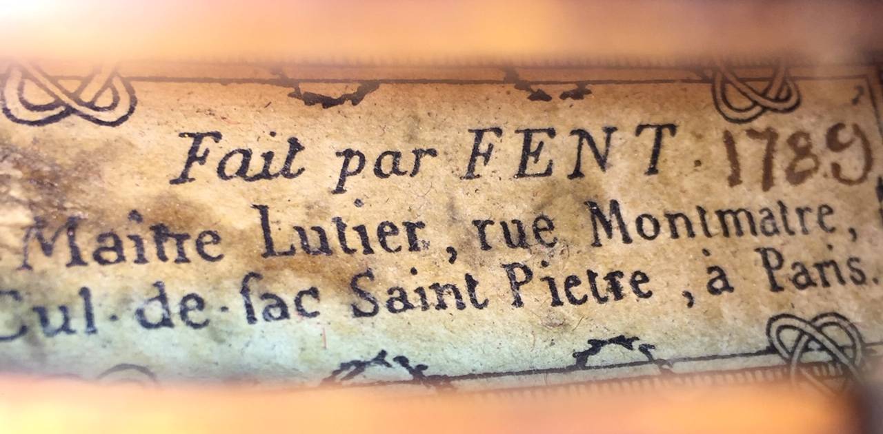 dont il porte l'étiquette "fait par FENT. maitre luthier, rue montmartre, Cul de sac Saint Pierre, à Paris. 1789.". Vernis brun rouge sur fond doré.