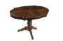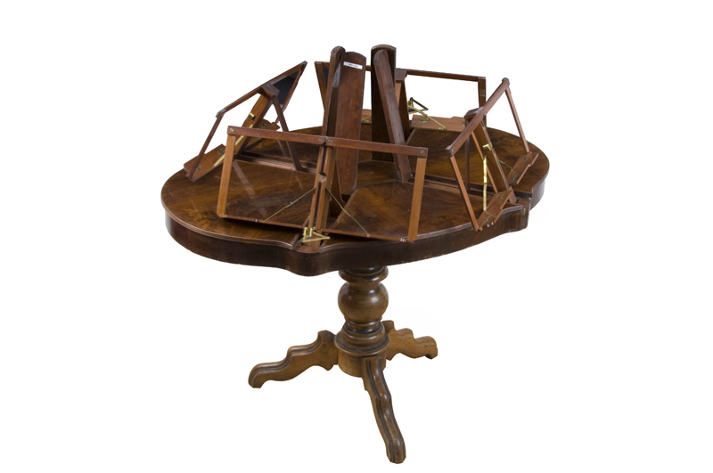 Table de quatuor faite vers 1860. Palissandre et filetage en marqueterie. Quatre pupitres dépliants avec portes chandelles en laiton. Deux tiroirs en ceinture. Manques et altérations.