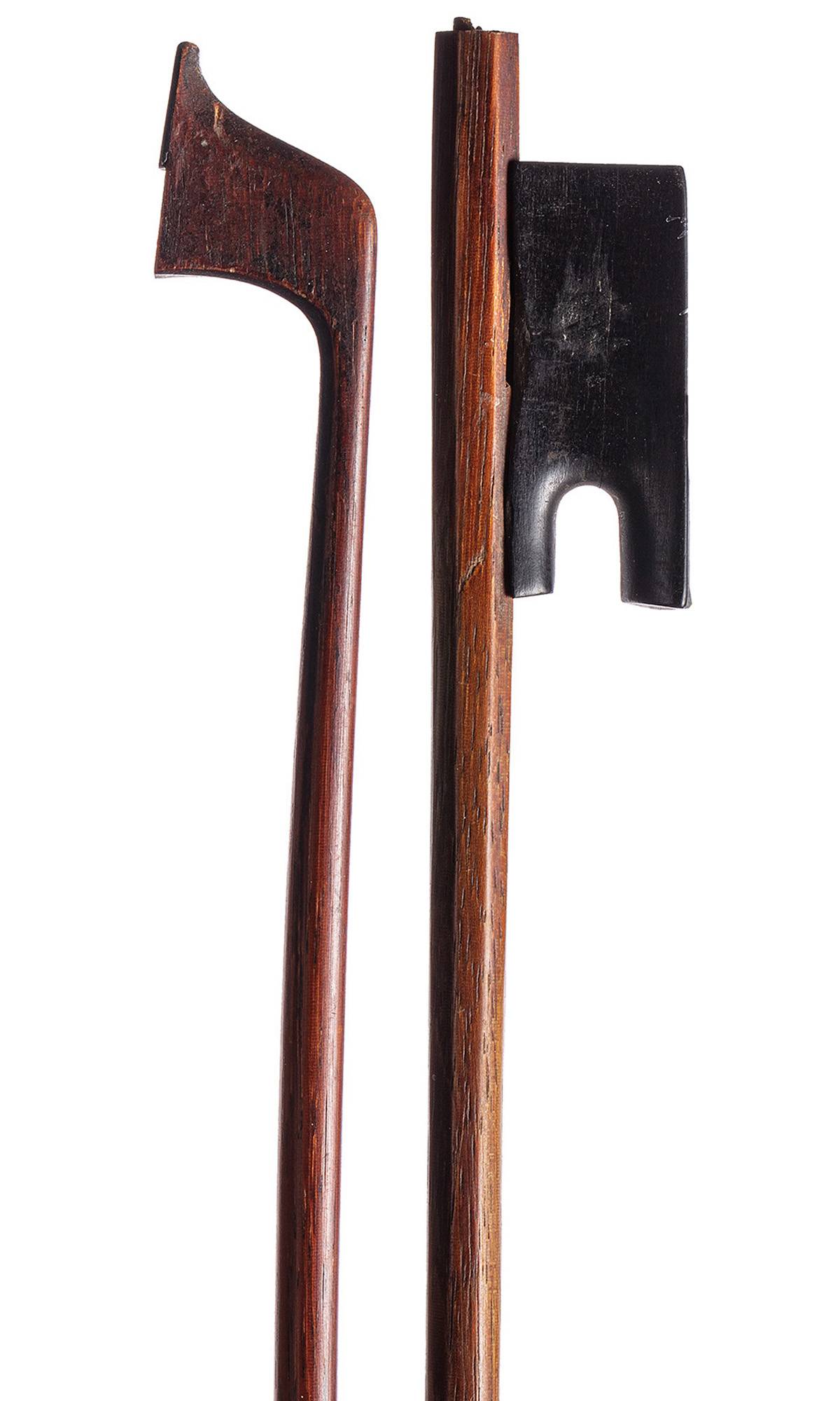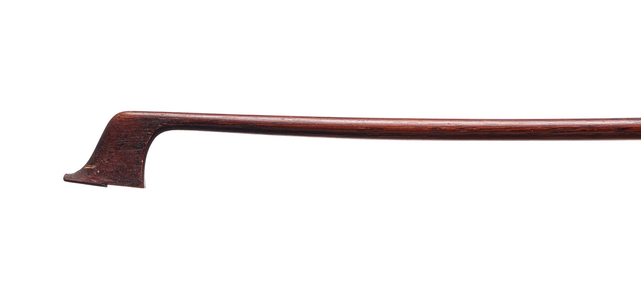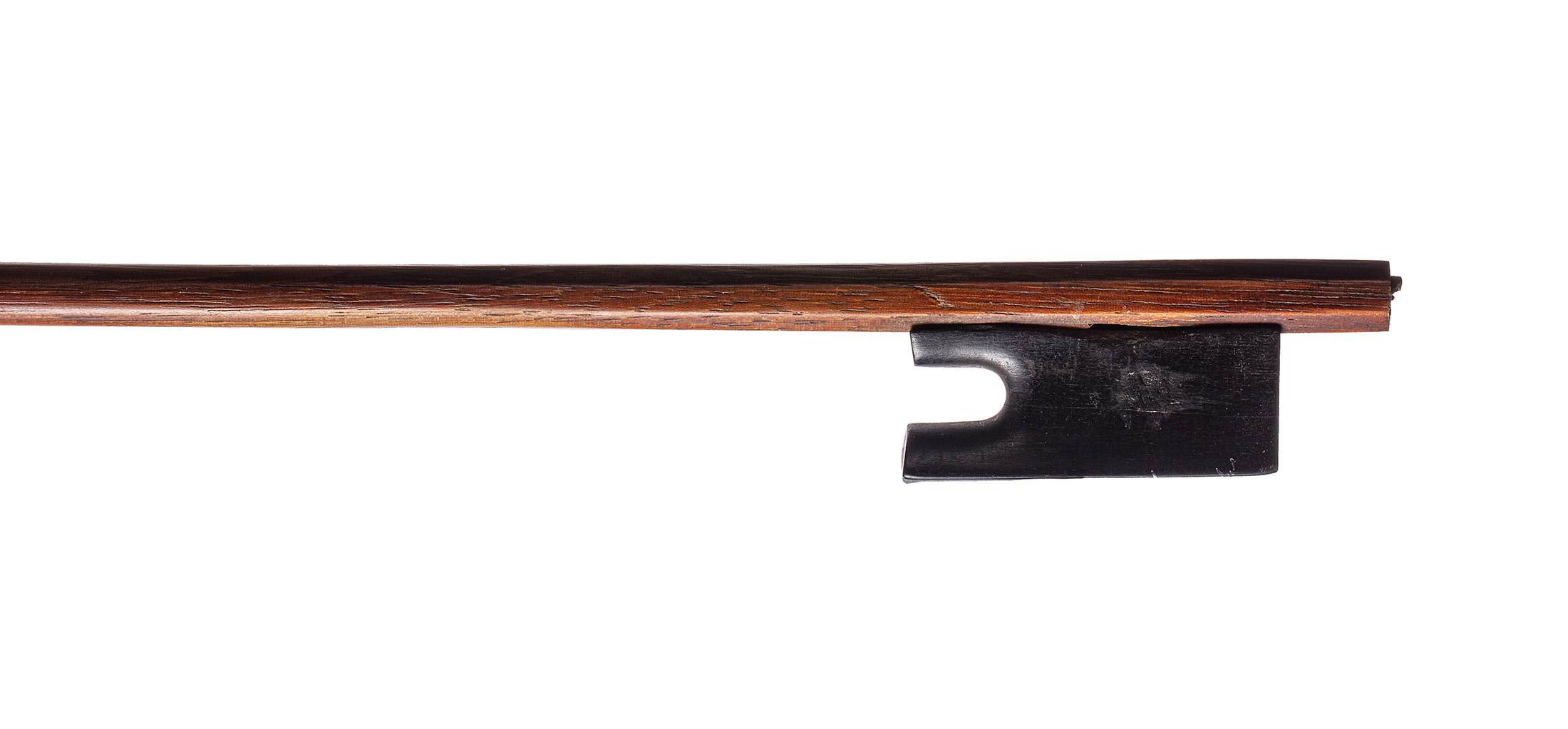 Archet baroque (Hausse ouverte). Baguette ronde en bois exotique. Bouton manquant. 727 mm. 46 g sans mèche, sans garniture, sans bouton.