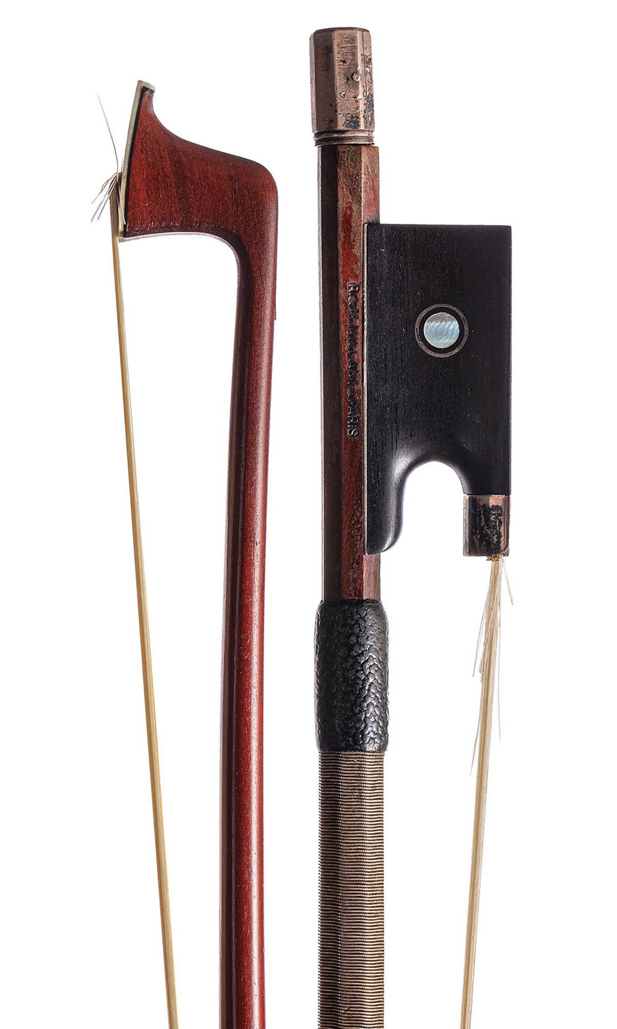 portant la marque au fer "R&M MILLANT A PARIS". Baguette ronde en bois de pernambouc. Hausse ébène montée argent. Fel au col de la tête. 728 mm. 57 g.